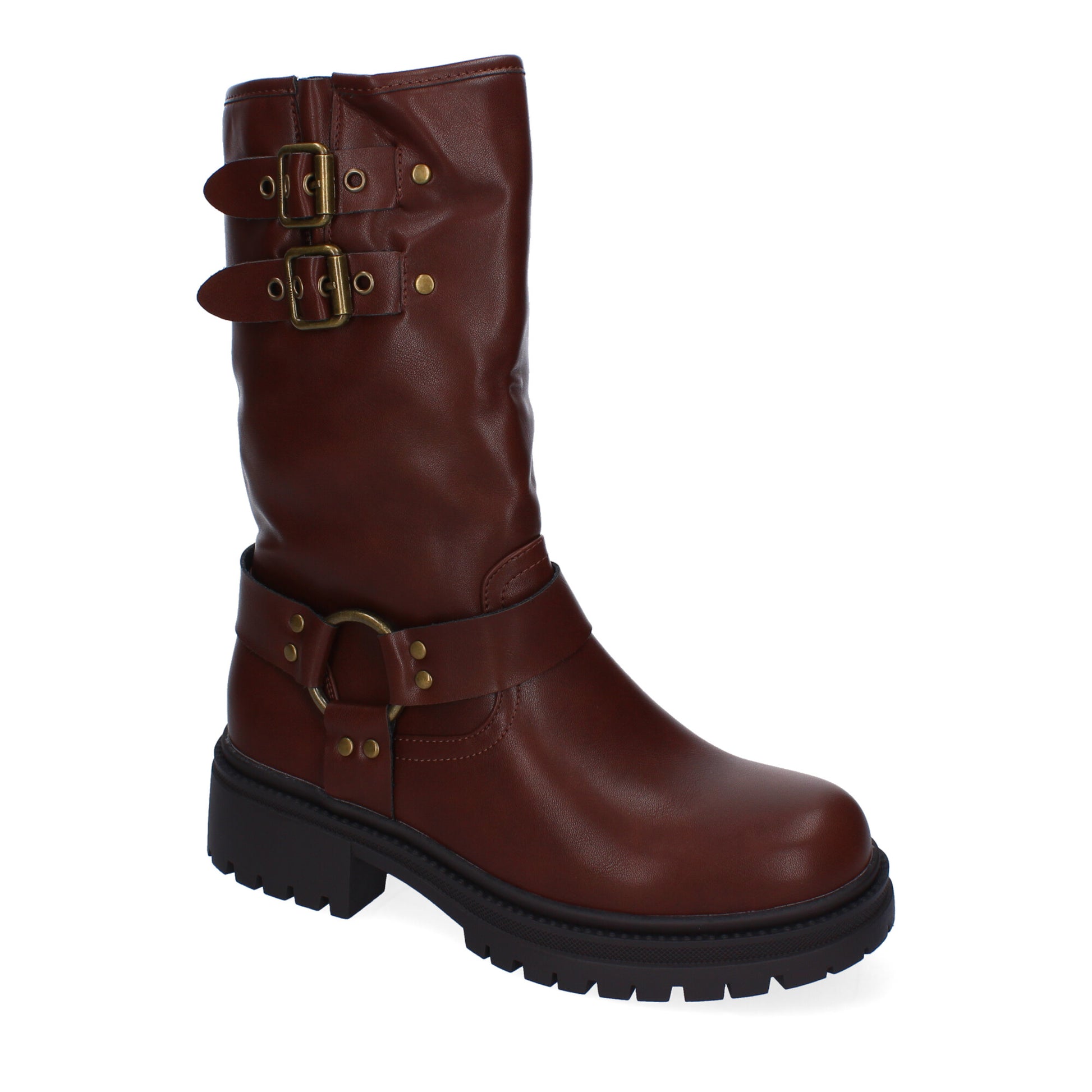 Bota biker con hebillas metálicas y suela gruesa. Diseño estructurado con caña media y cierre lateral.