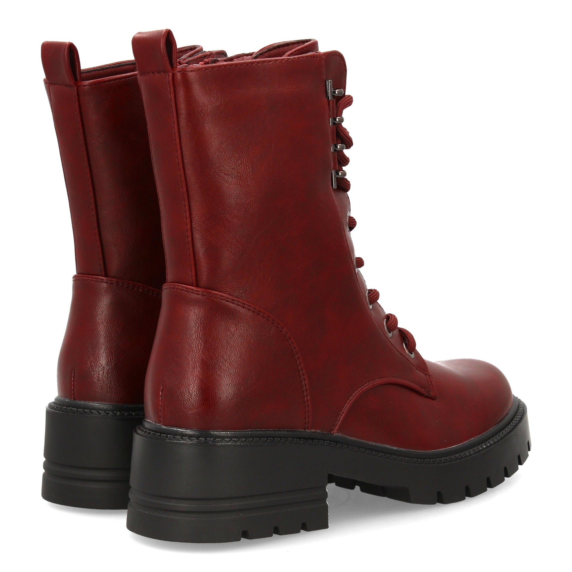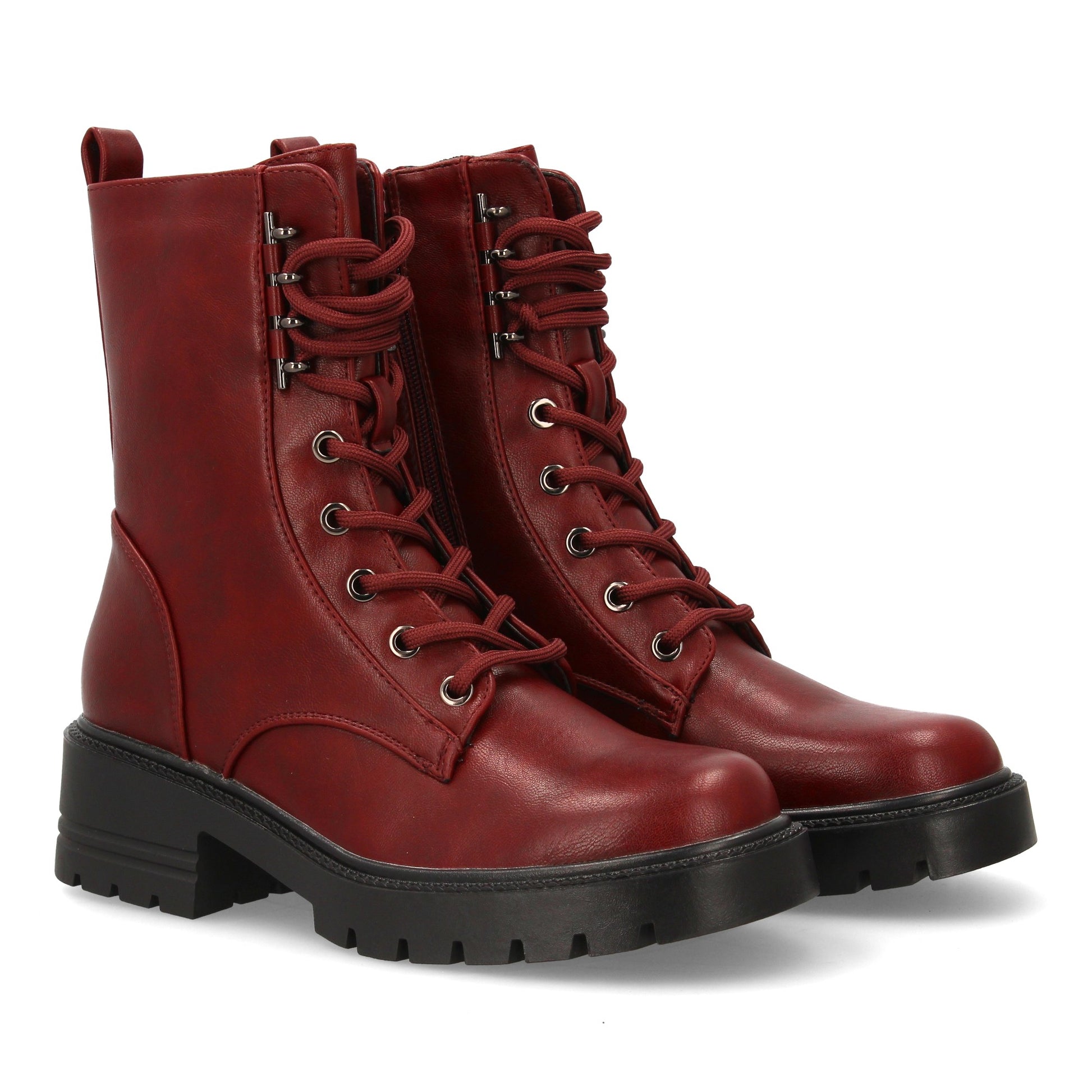Botín burdeos con cordones y cremallera lateral. Diseño robusto con suela gruesa y acabado efecto piel lisa.