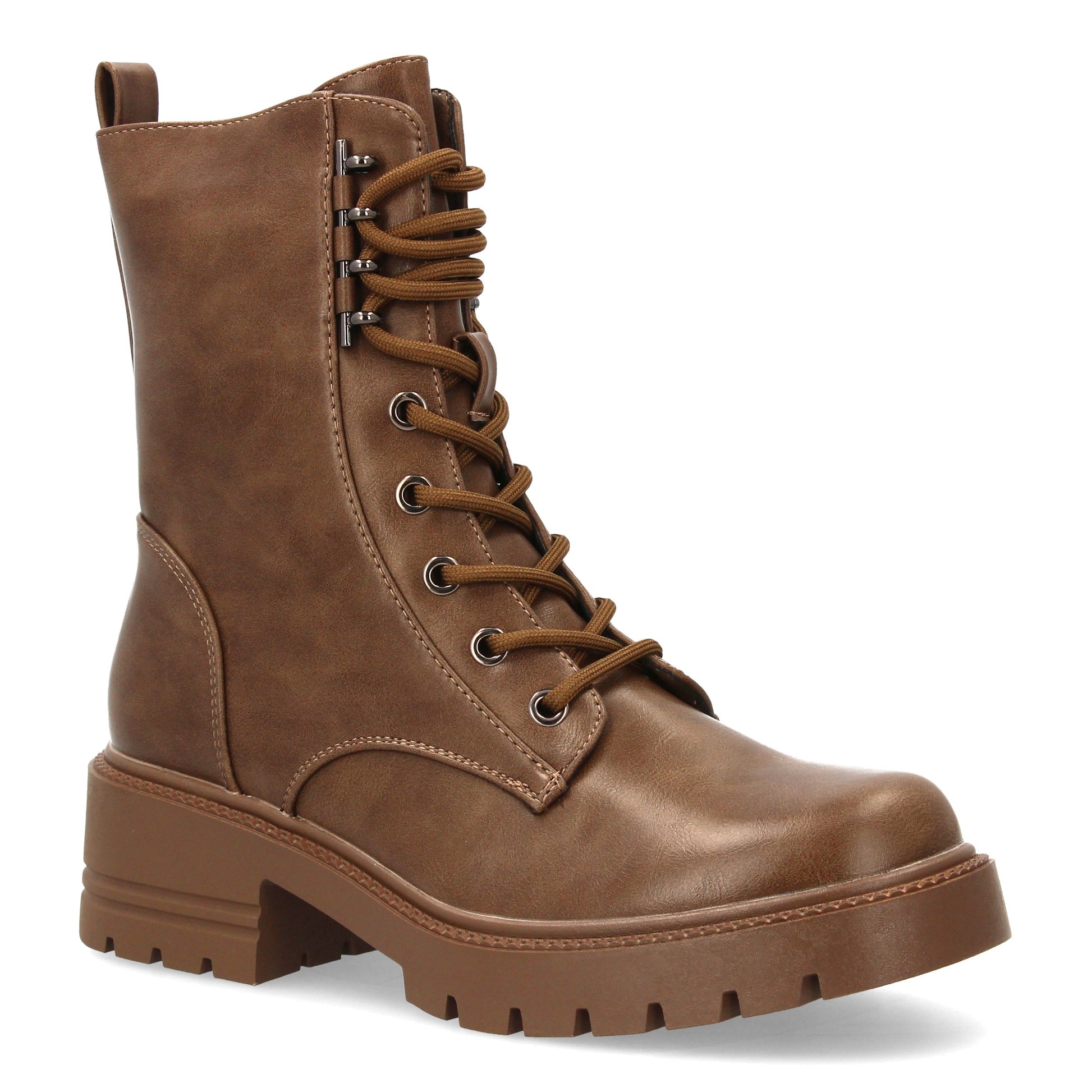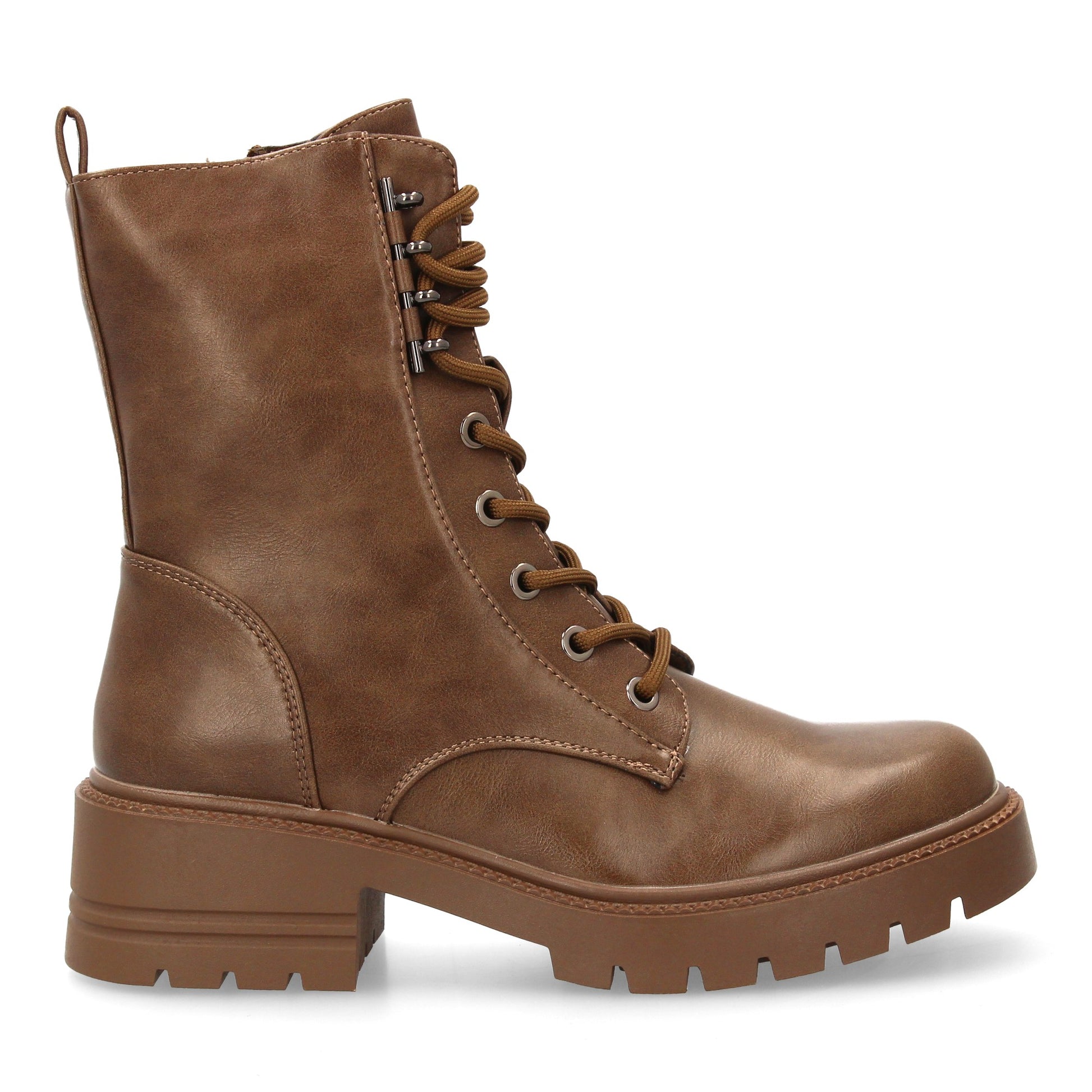 Bota marrón con cordones y cremallera lateral. Diseño robusto con suela gruesa y acabado efecto piel lisa.