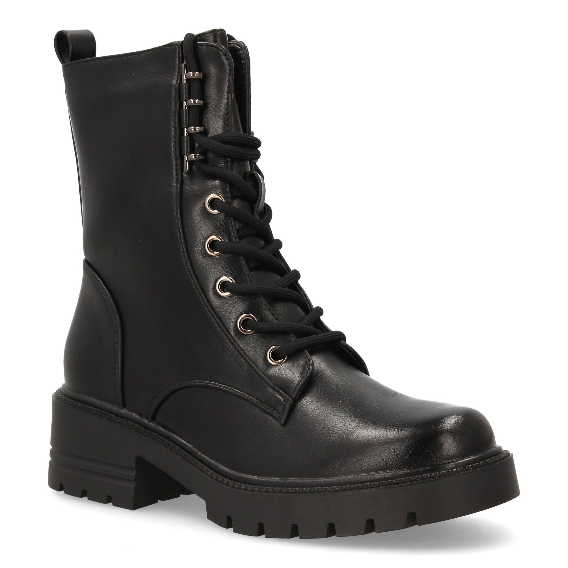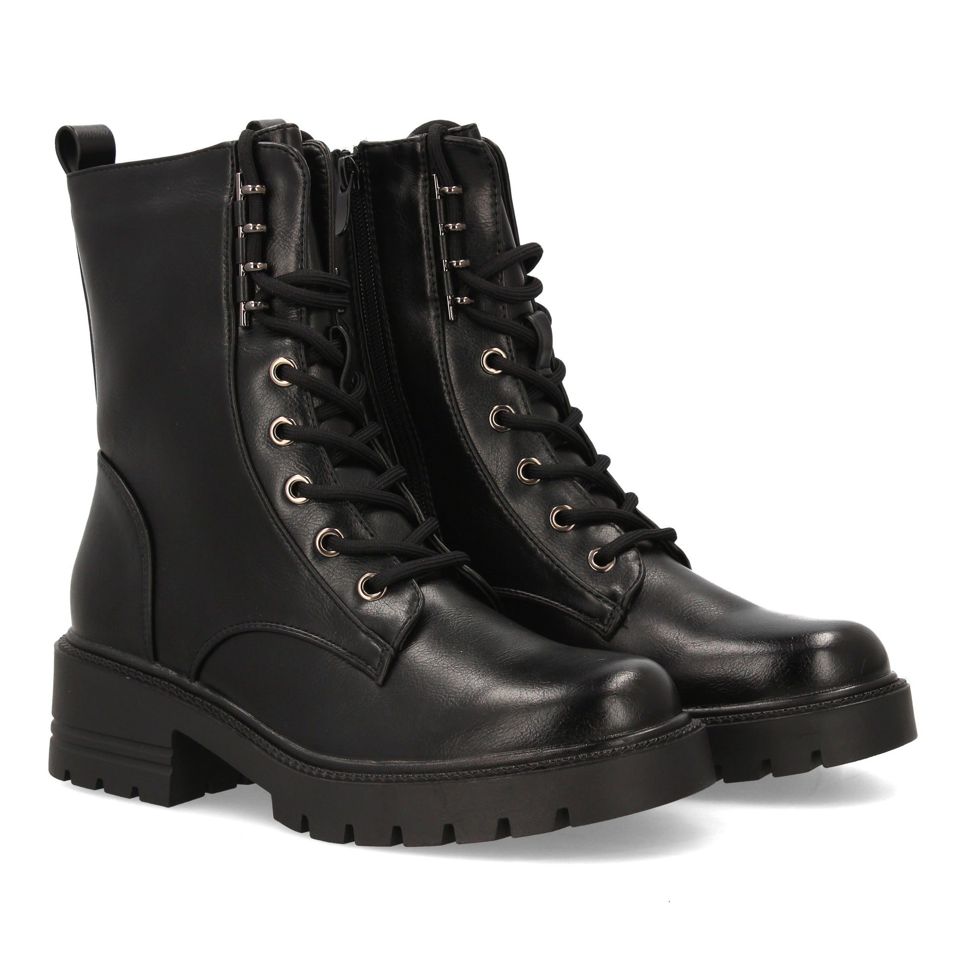 Botín con cordones y cremallera lateral. Diseño robusto con suela gruesa y acabado efecto piel lisa.