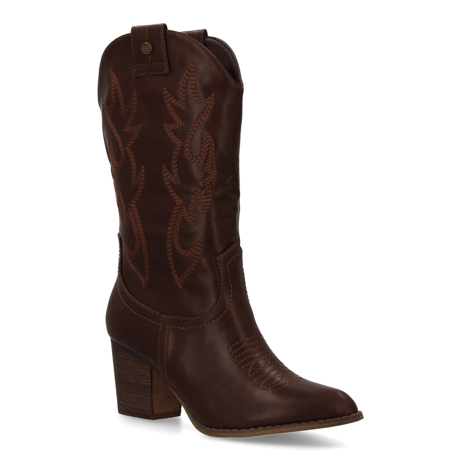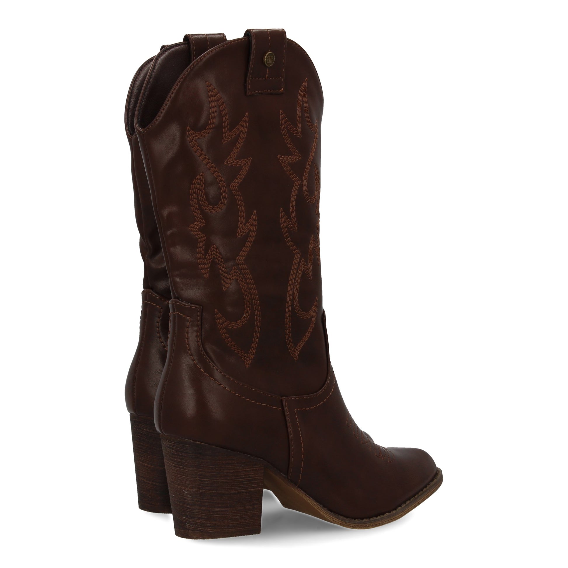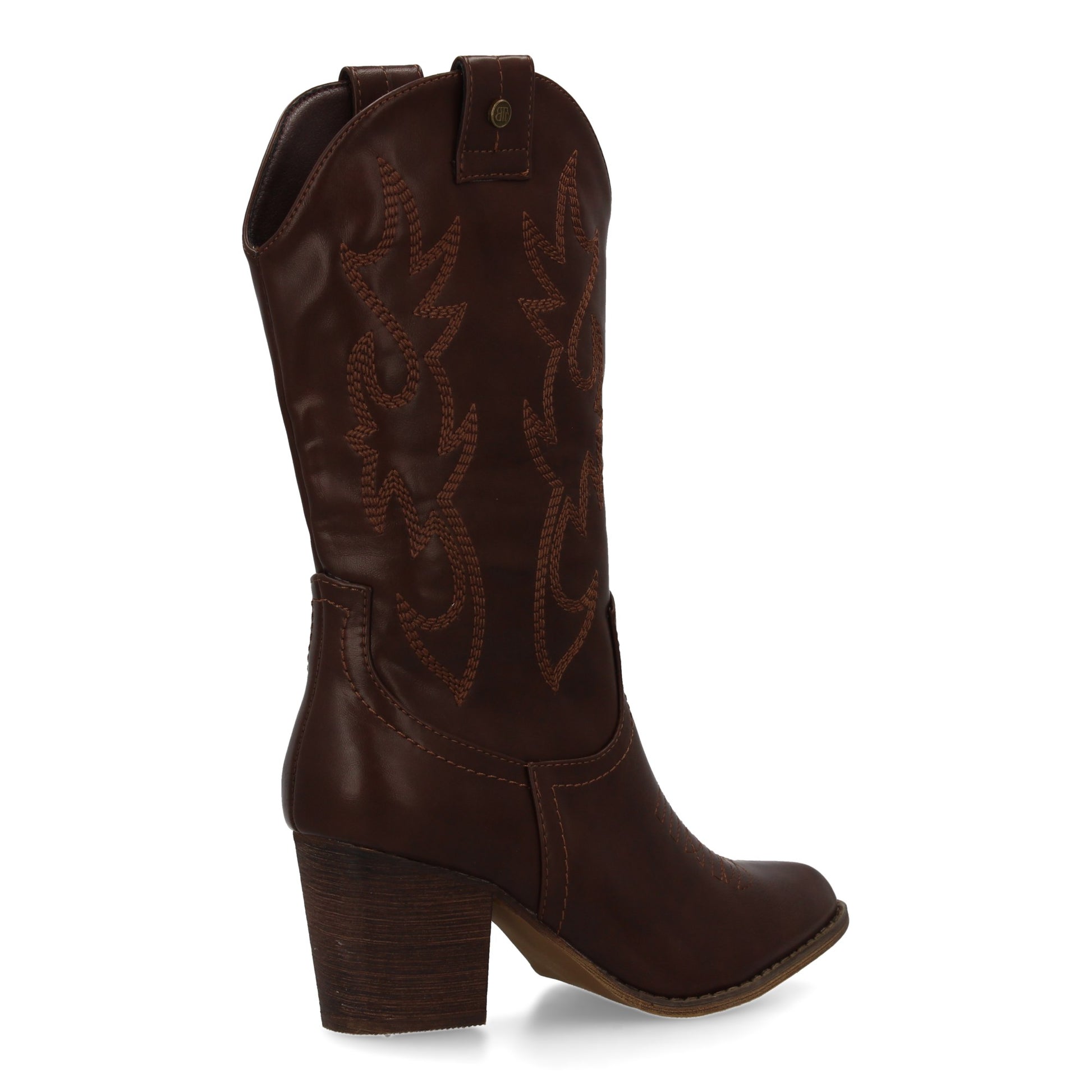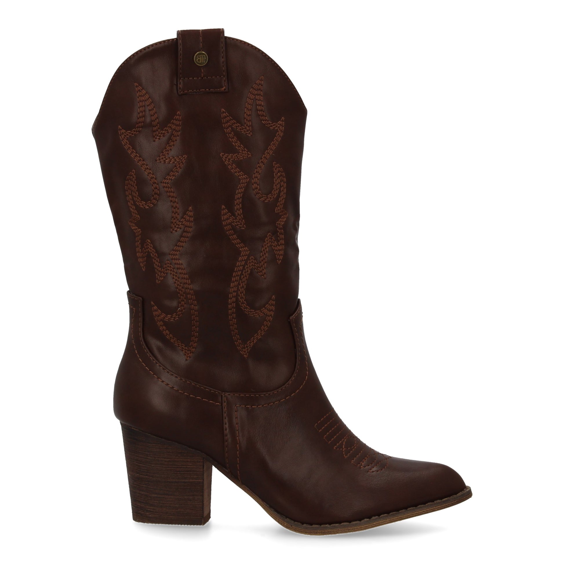 Bota cowboy de caña media en color marrón con bordado decorativo.