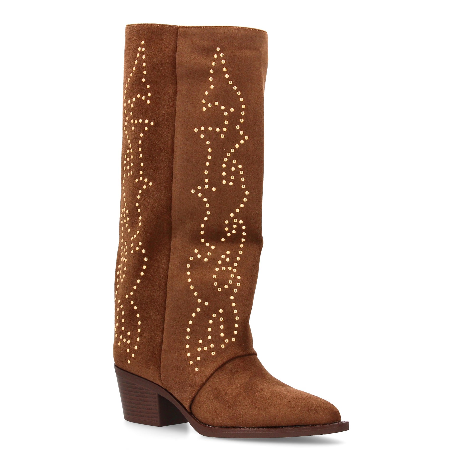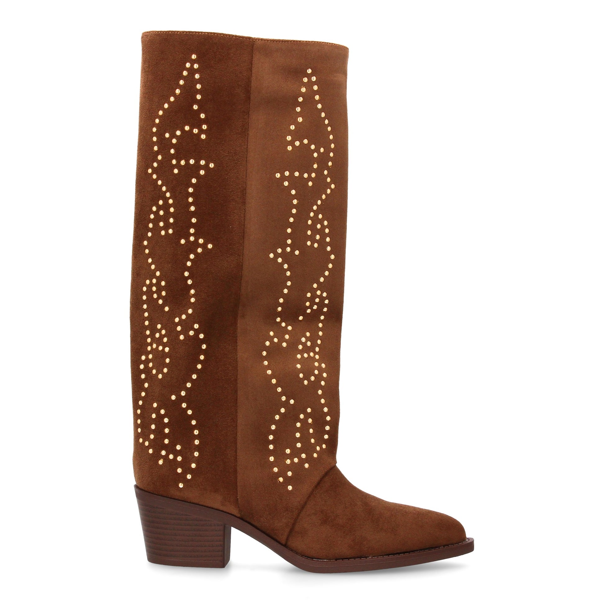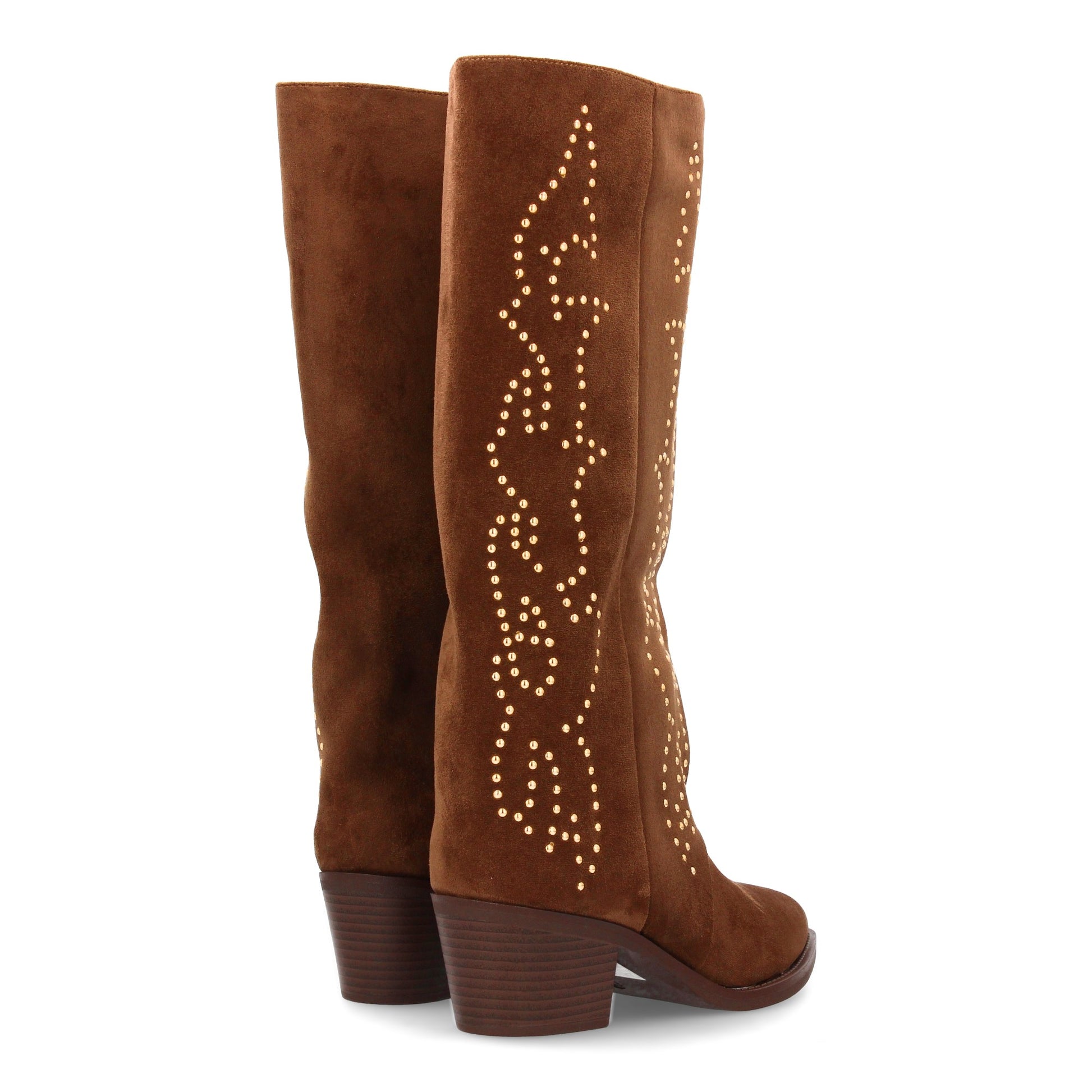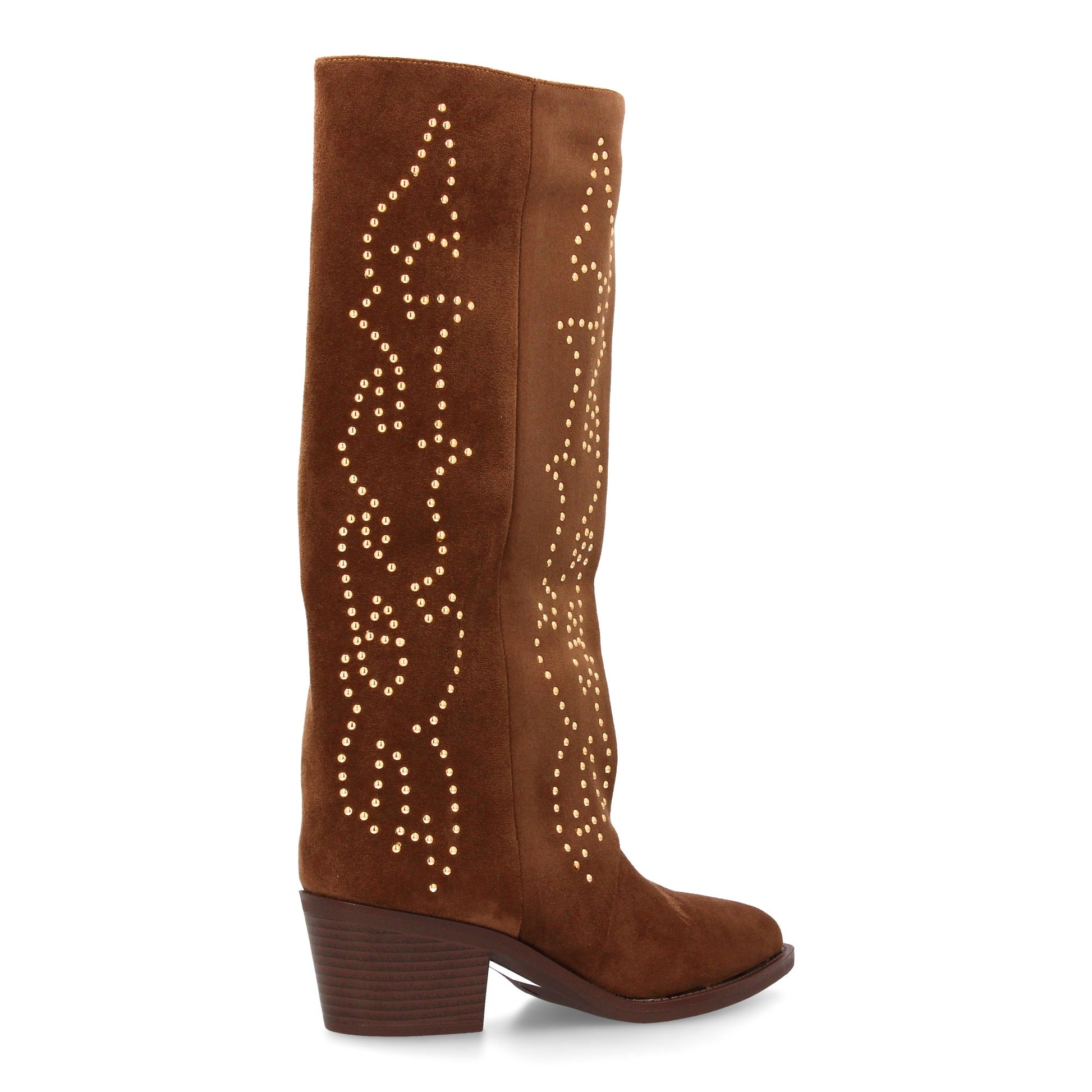 Bota alta de inspiración cowboy con detalle de microtachuelas en patrón decorativo. Acabado ante y tacón medio bajo. Cierre lateral interior.