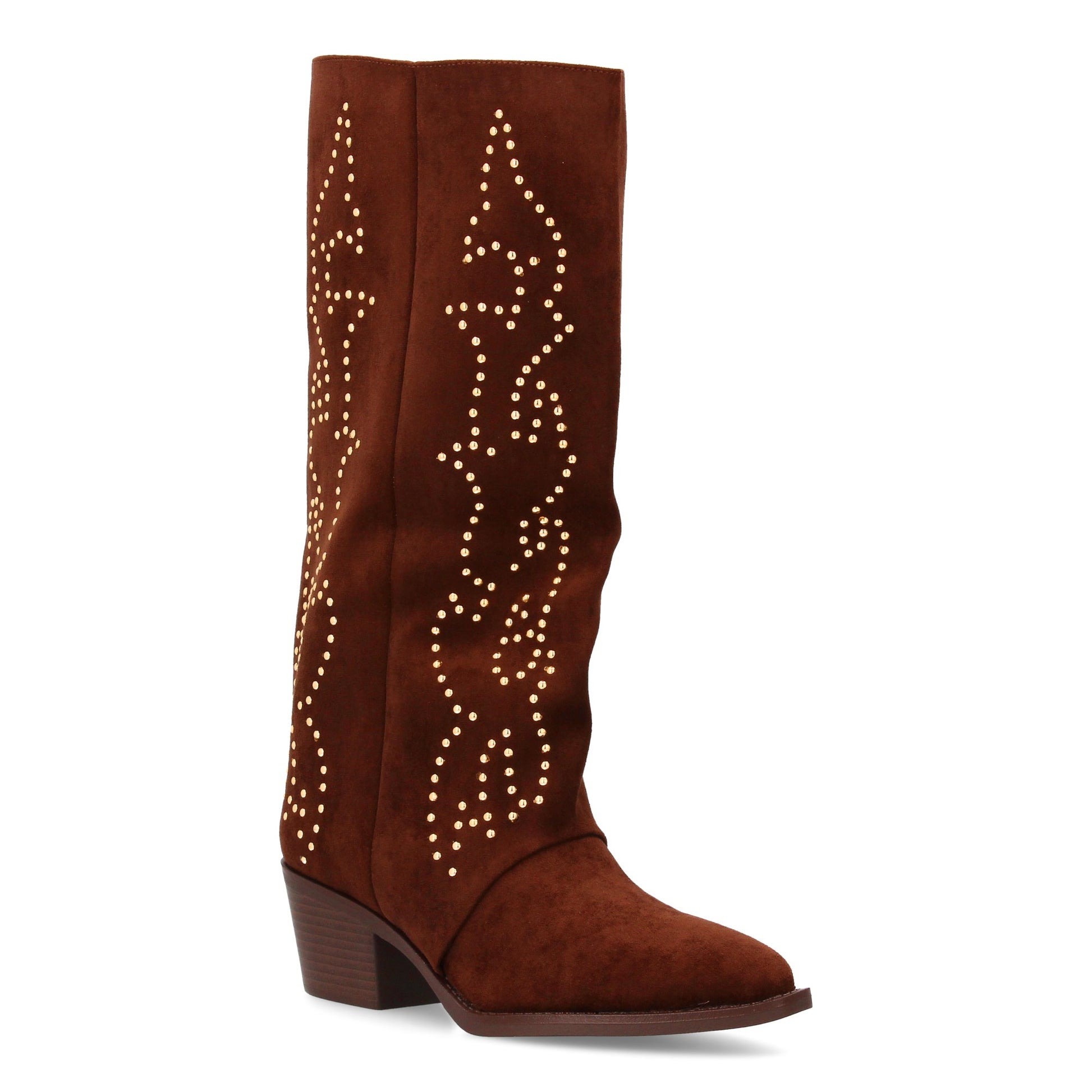Bota alta de inspiración cowboy con detalle de microtachuelas en patrón decorativo. Acabado ante y tacón medio bajo. Cierre lateral interior.