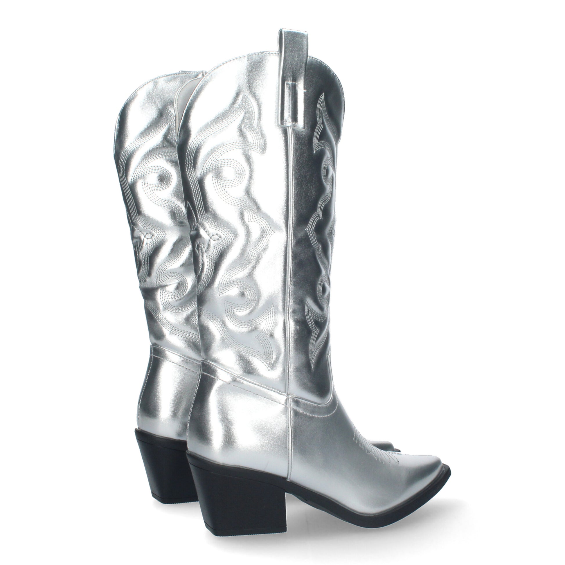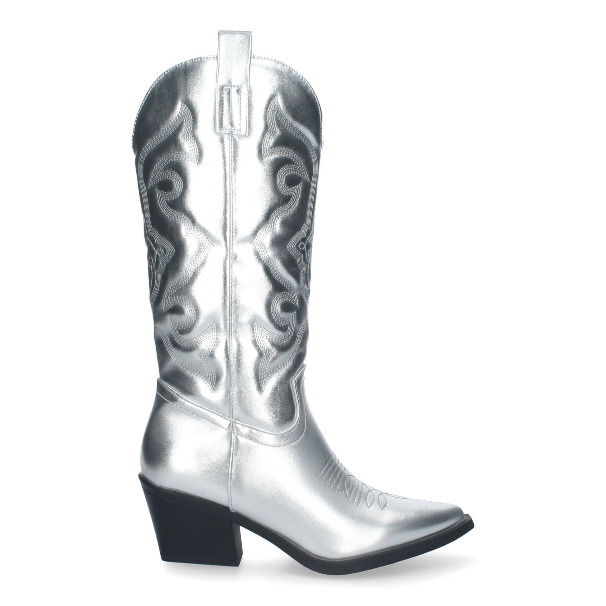 Bota cowboy de caña alta con acabado metalizado y bordado decorativo.