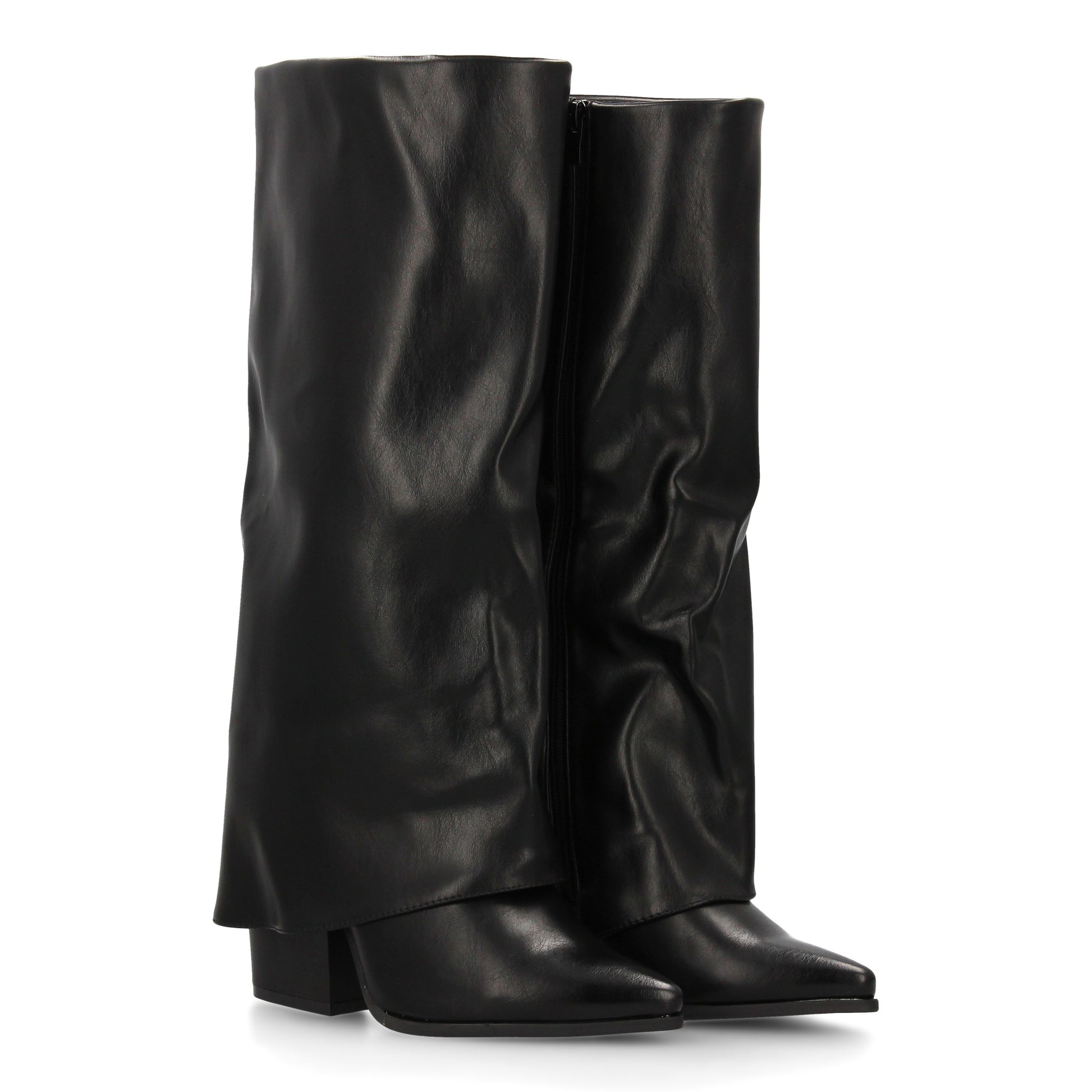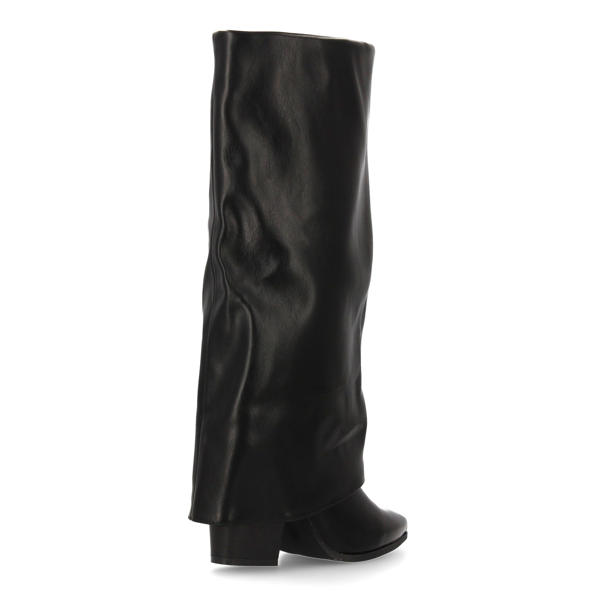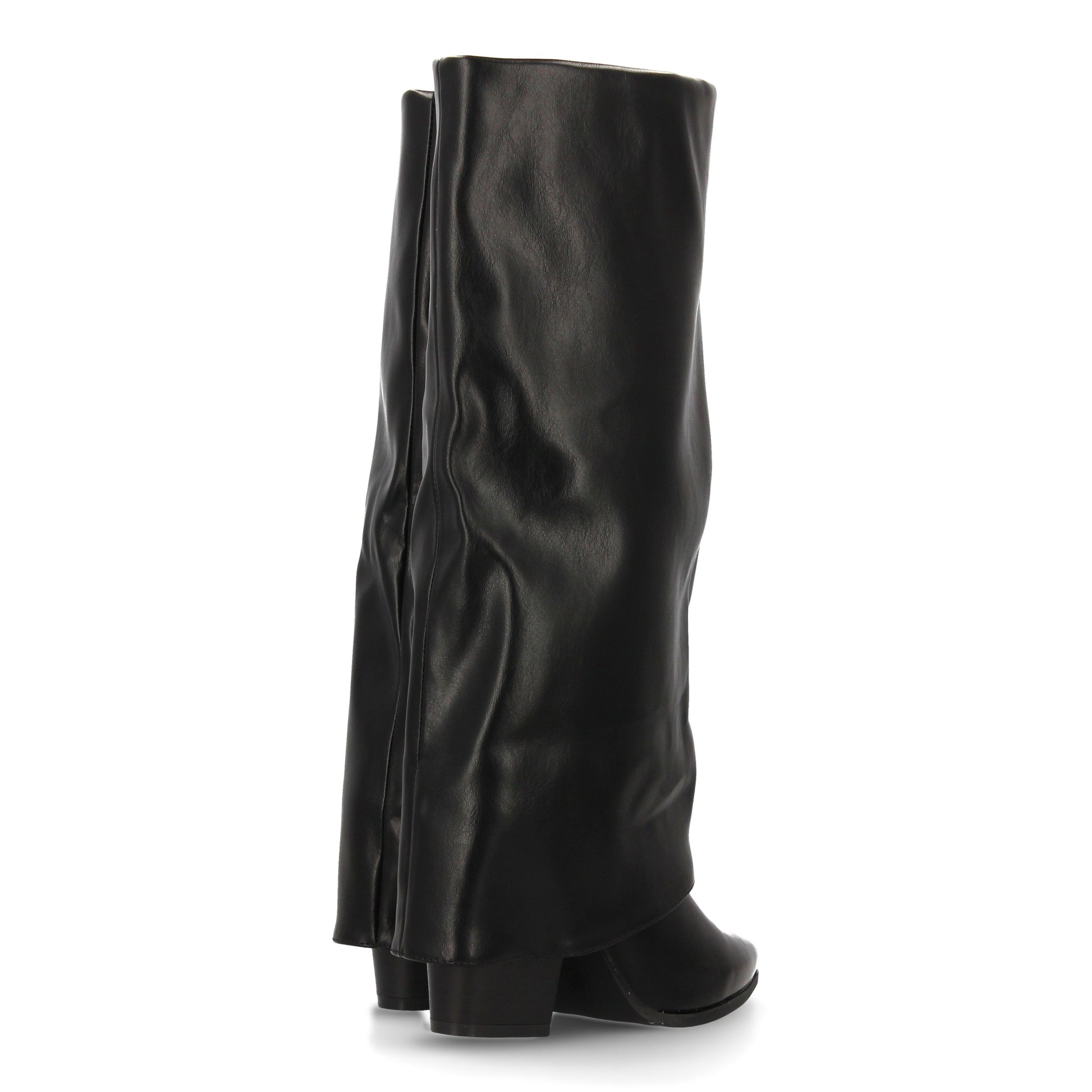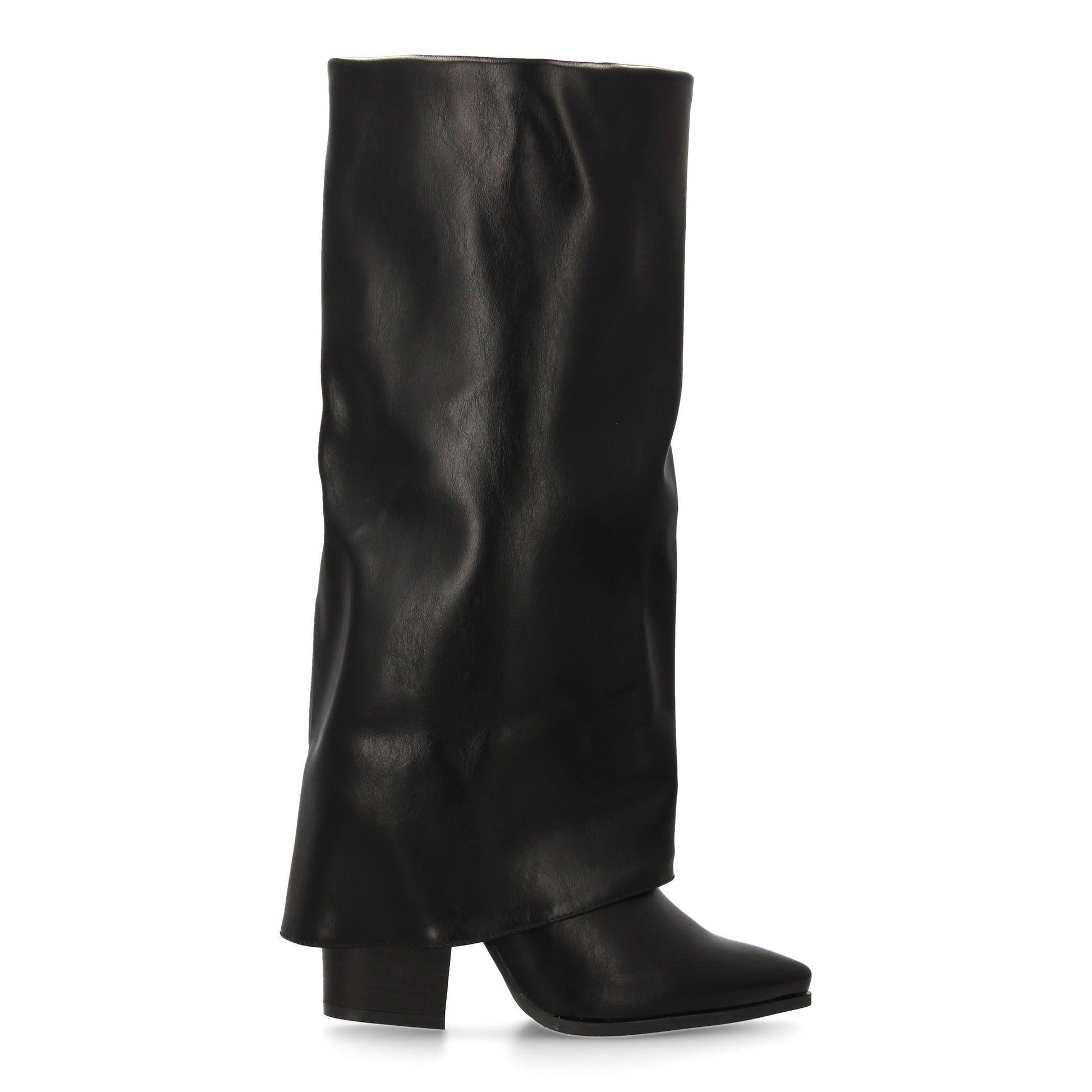 Bota alta de silueta amplia con tacón ancho. Diseño escultural con caída natural que envuelve el contorno de la pierna.