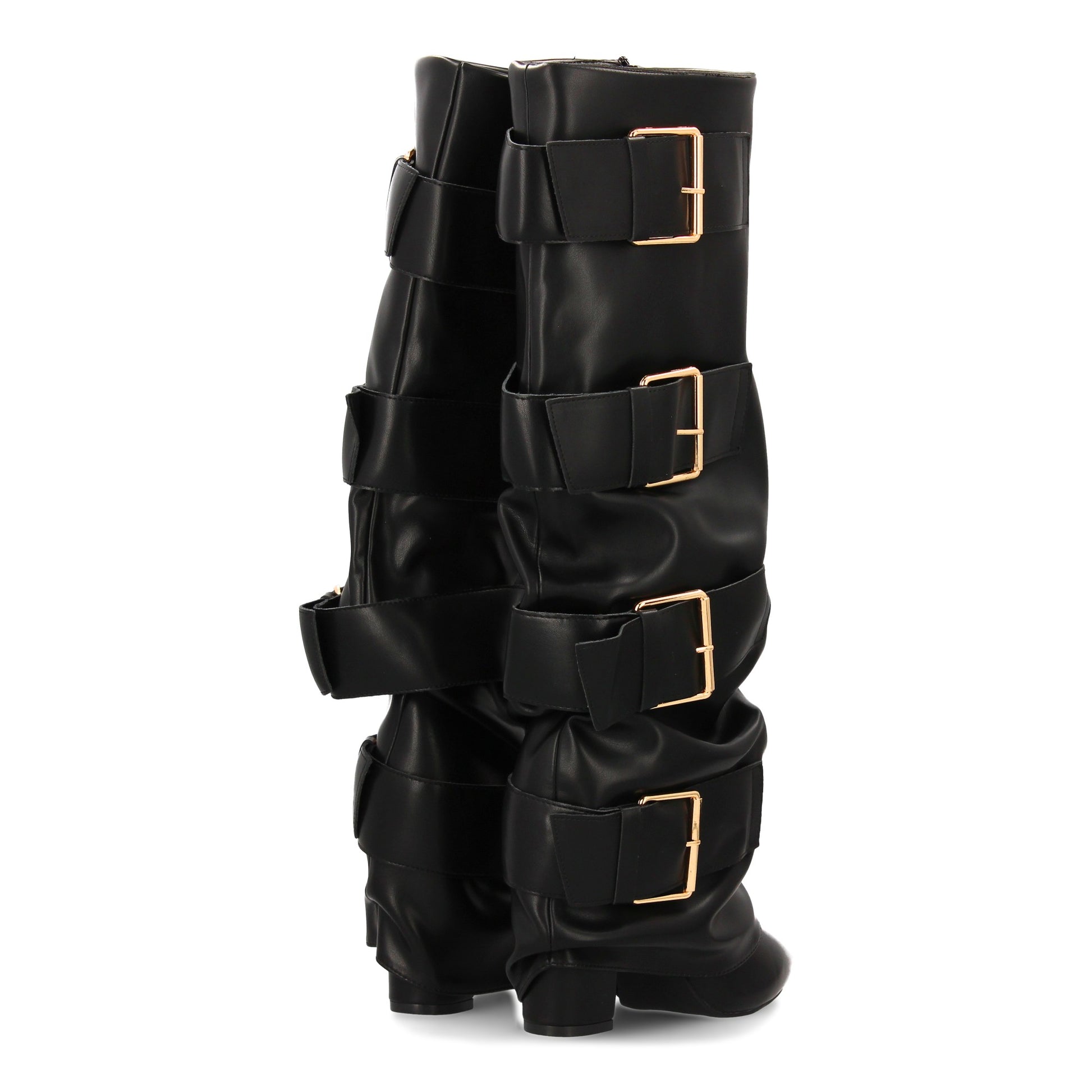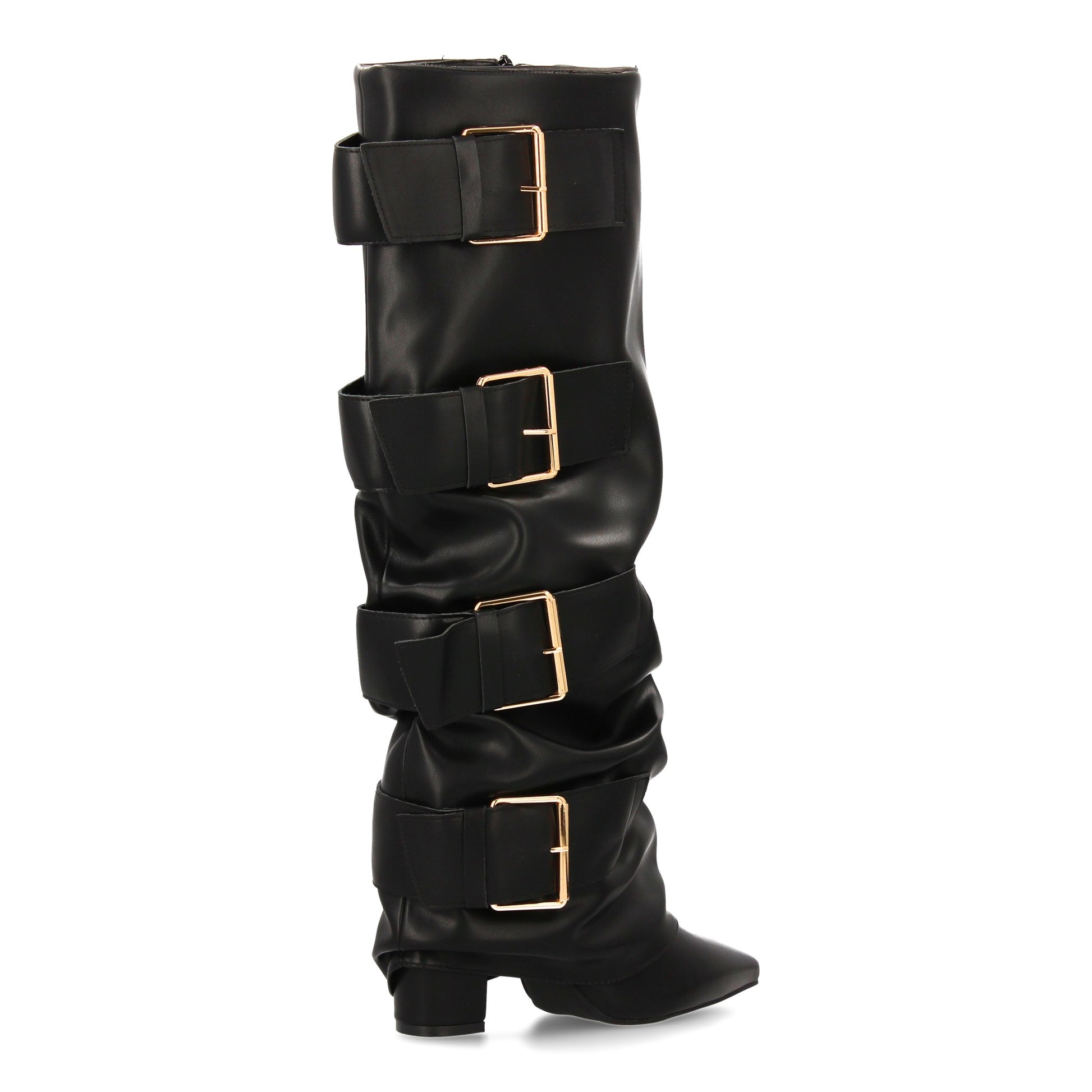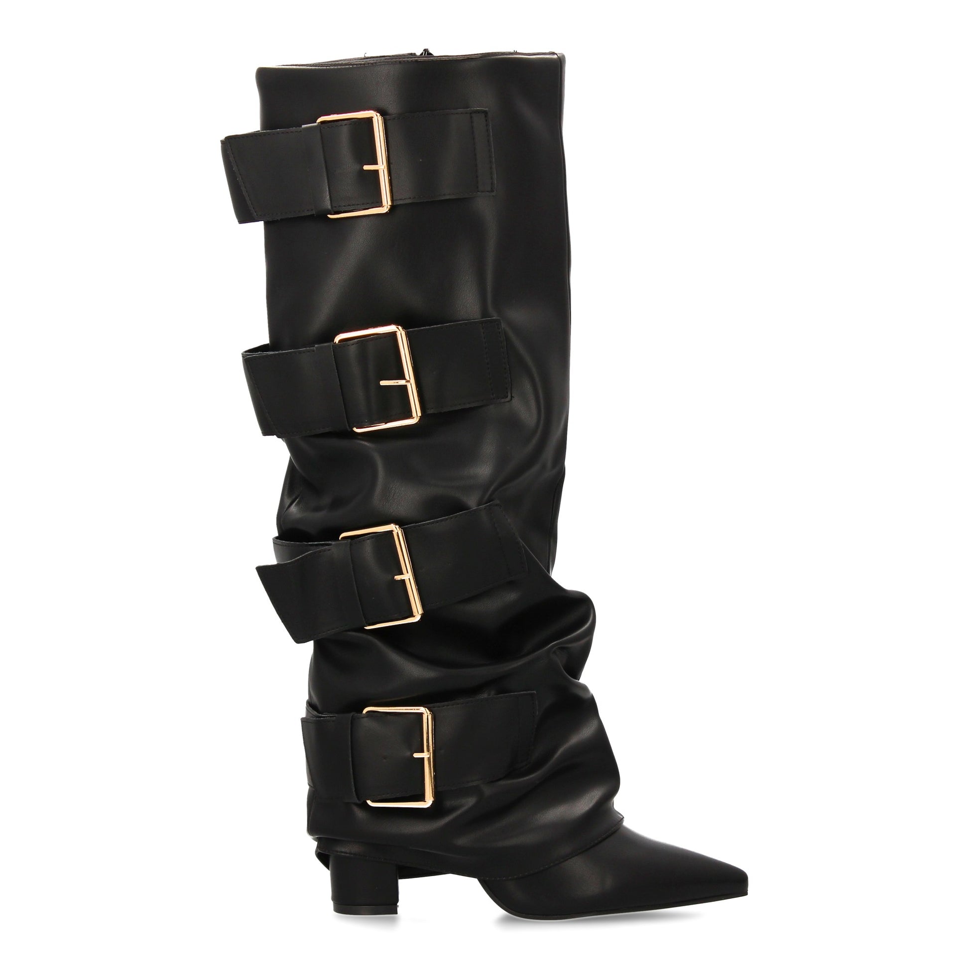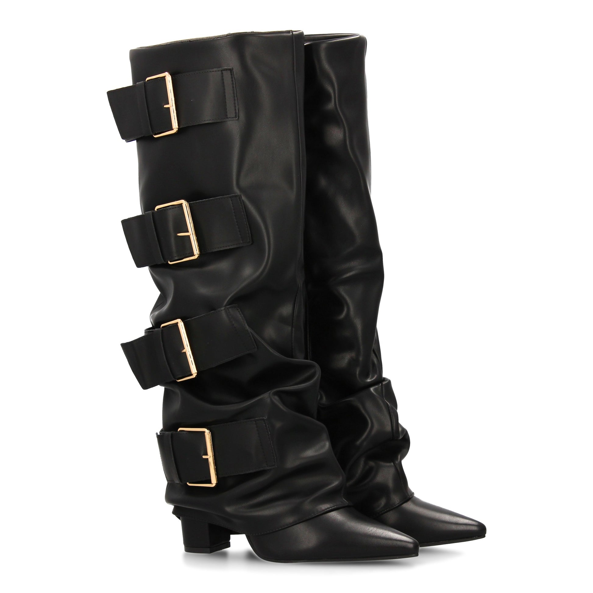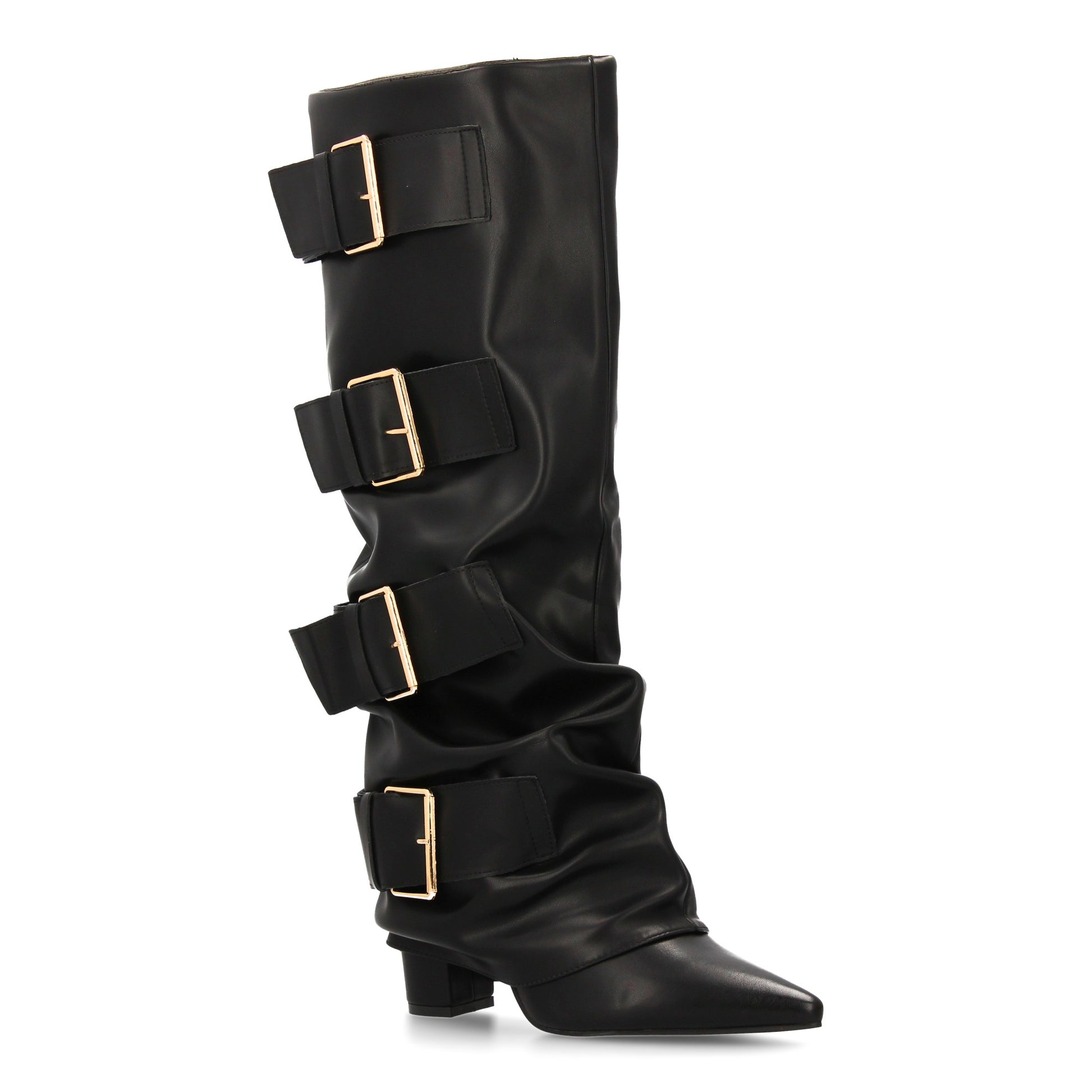 Bota alta con cuatro hebillas metálicas y tacón medio. Diseño estructurado con punta fina y acabado suave. Un modelo con carácter y estilo actual.