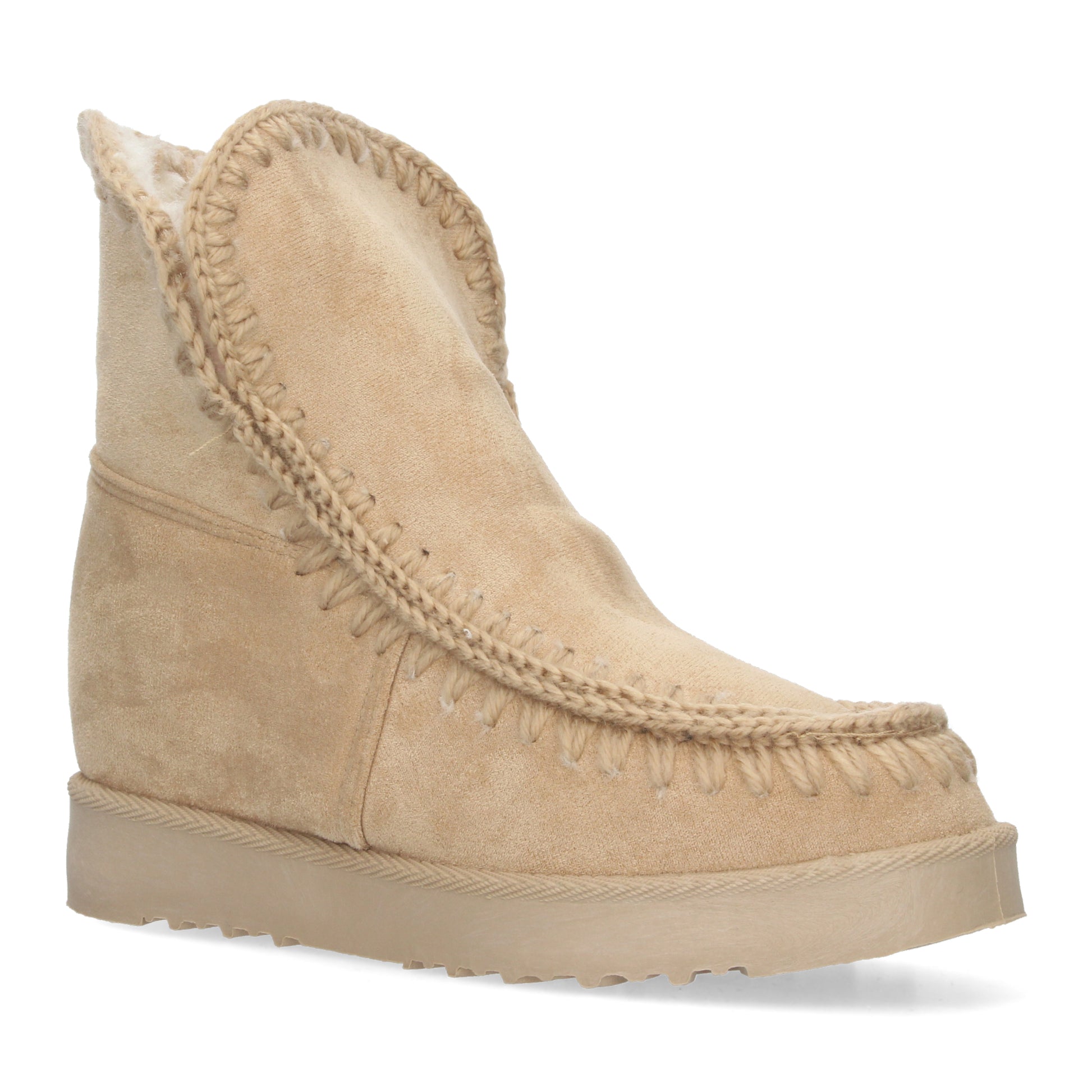 Botín plano estilo australiano con acabado aterciopelado y forro interior de pelo. Diseño de caña media con costuras visibles y tacto suave.
