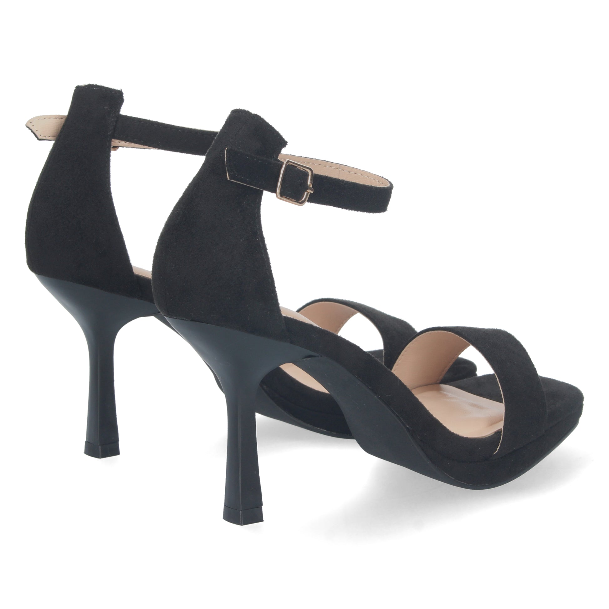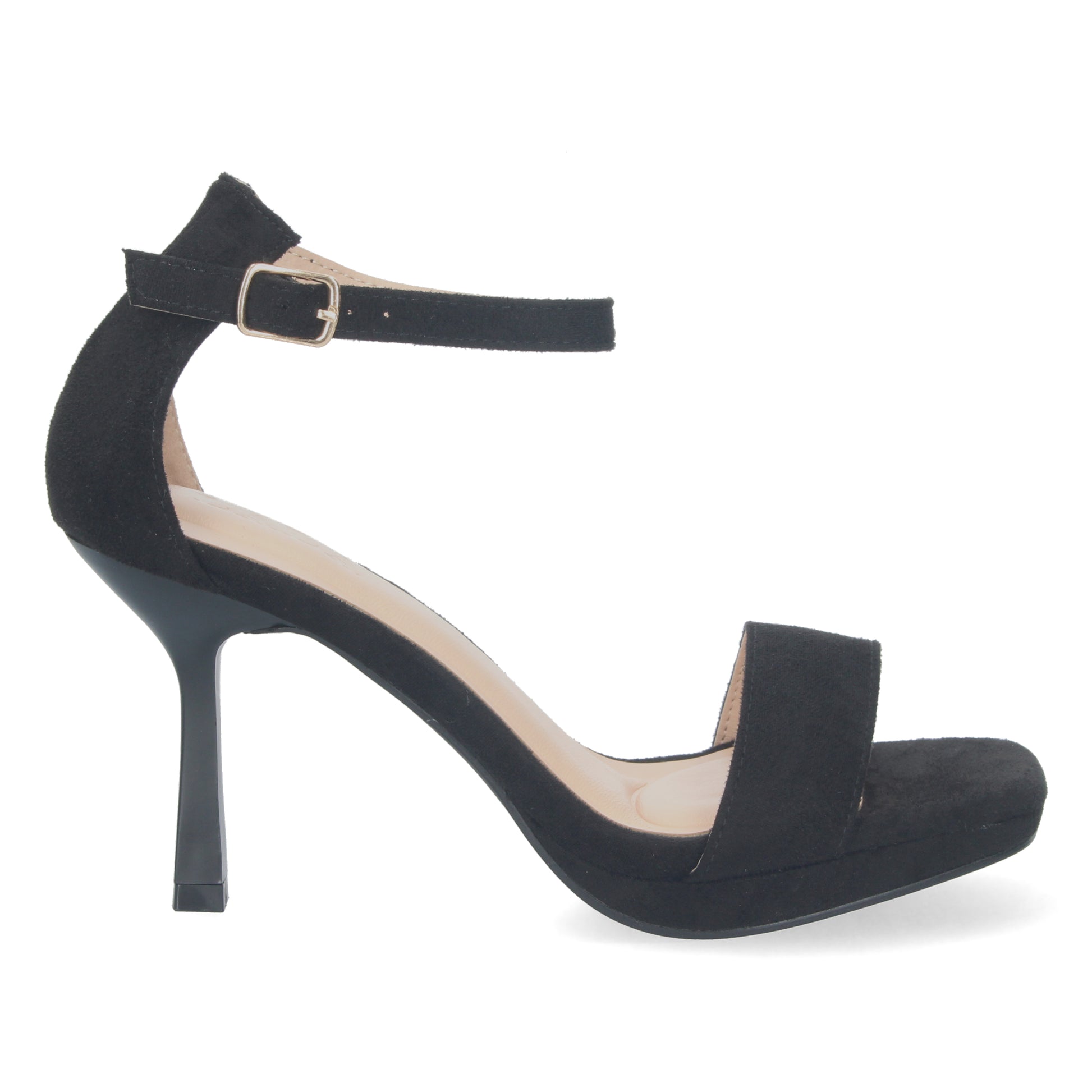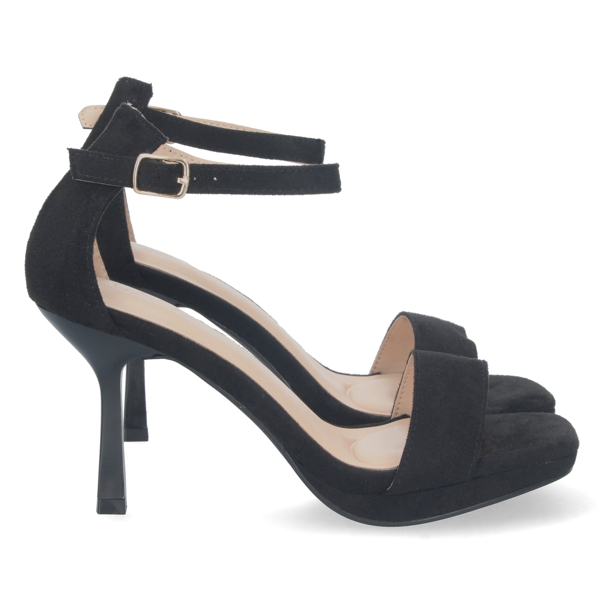 Sandalia con tacón alto y tira delantera ancha en acabado tipo ante. Sujeción doble al tobillo para mayor estabilidad.