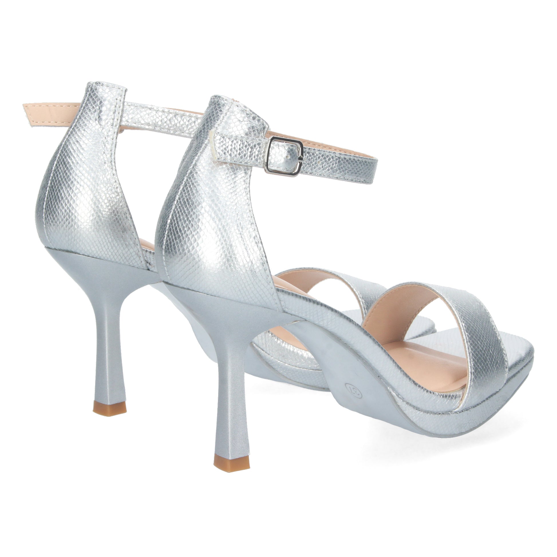 Sandalia de tacón alto con acabado plateado y doble tira al tobillo. Minimalista y estilizada.