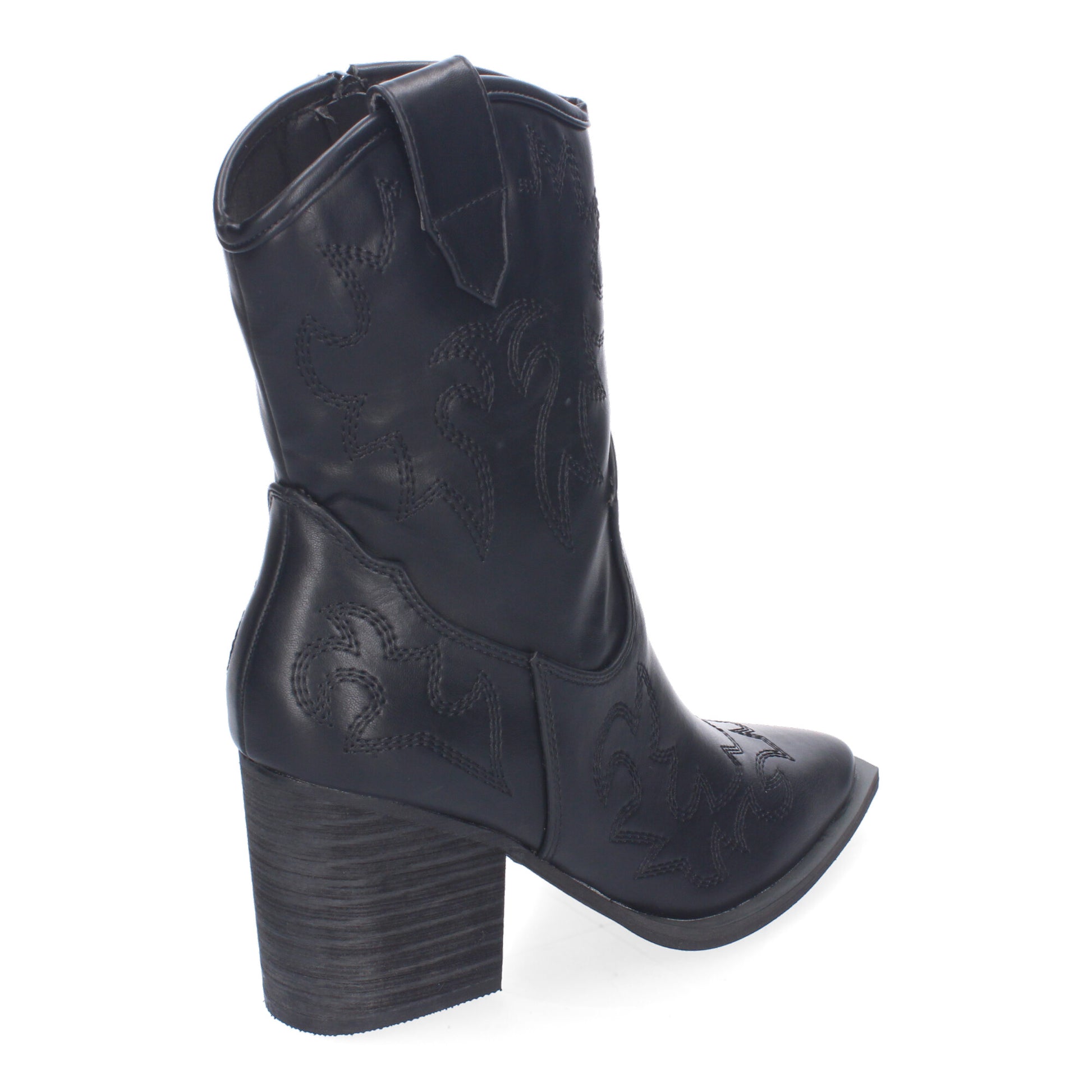 Botín estilo cowboy con bordados decorativos y cierre lateral de cremallera.