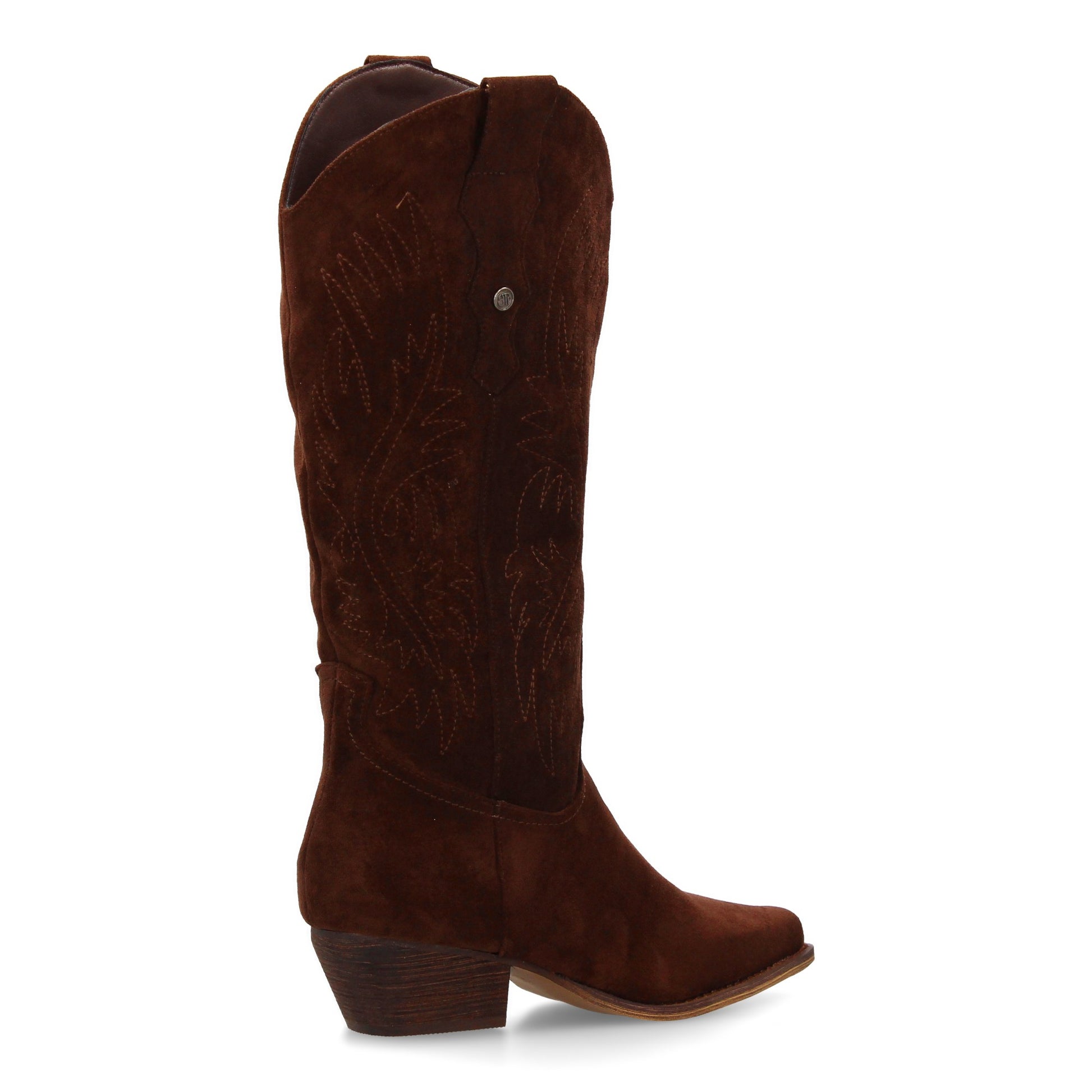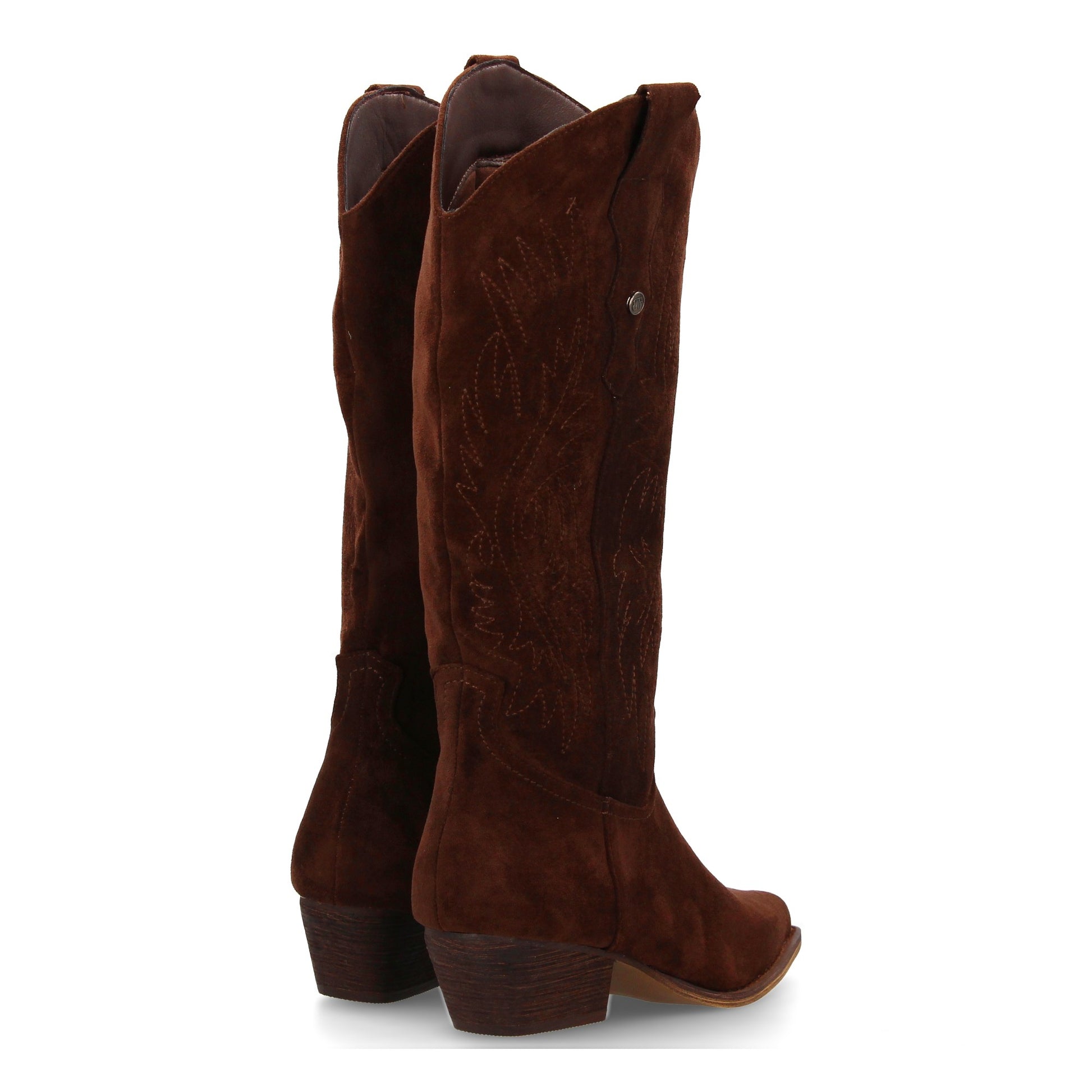 Bota cowboy de caña alta en acabado ante con bordado decorativo.