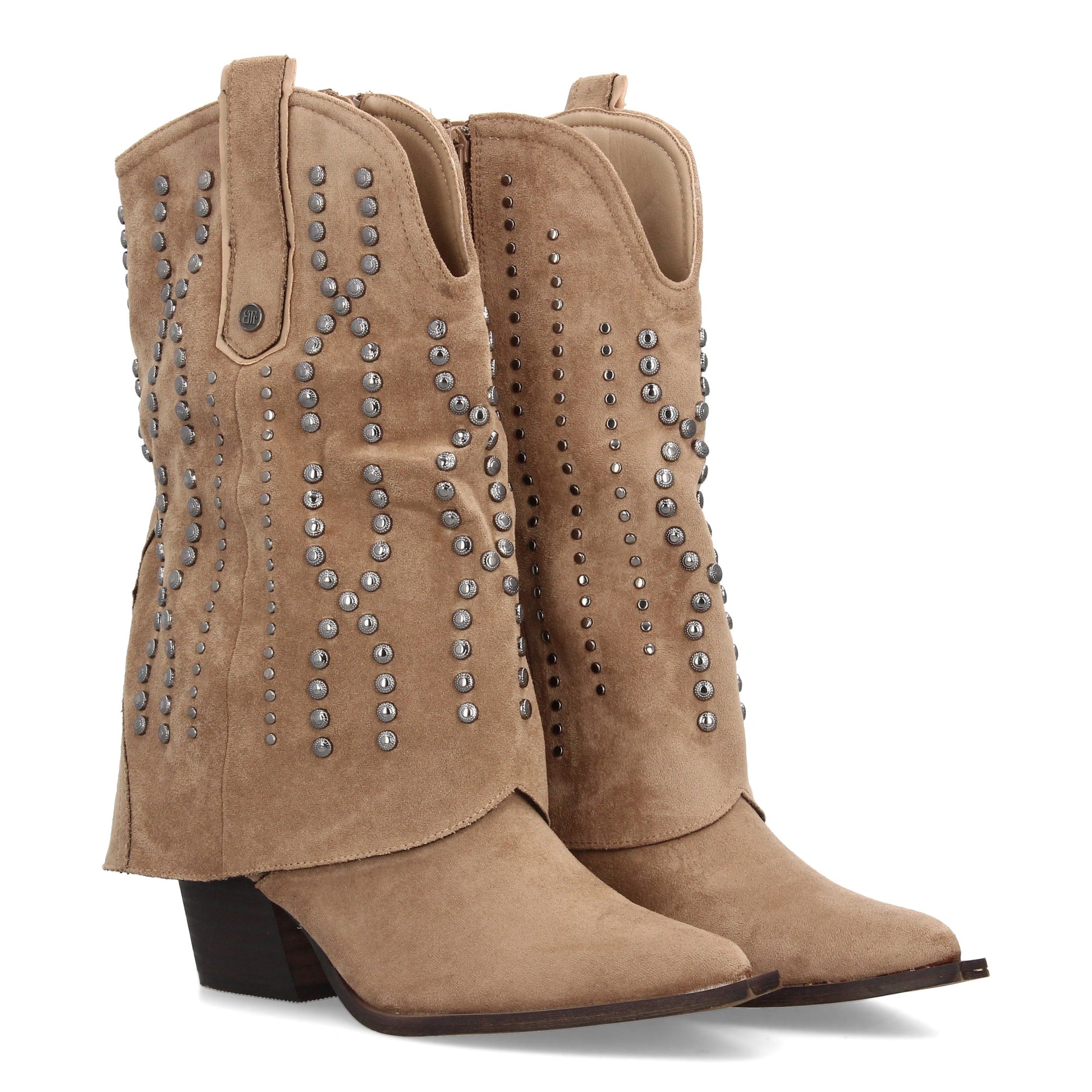 Bota de caña media con diseño western y microtachuelas metálicas sobre acabado ante. Cierre lateral interior y tacón medio.