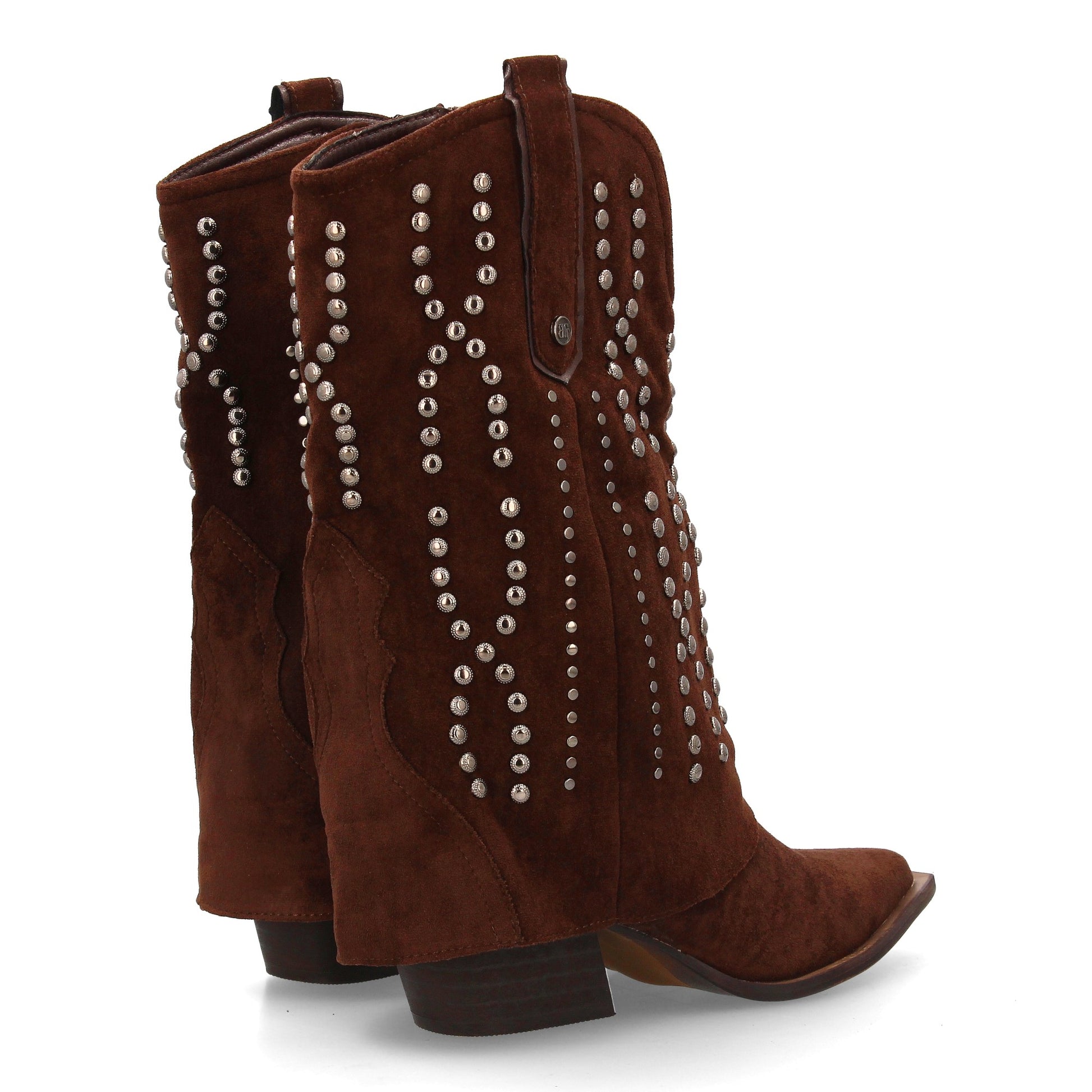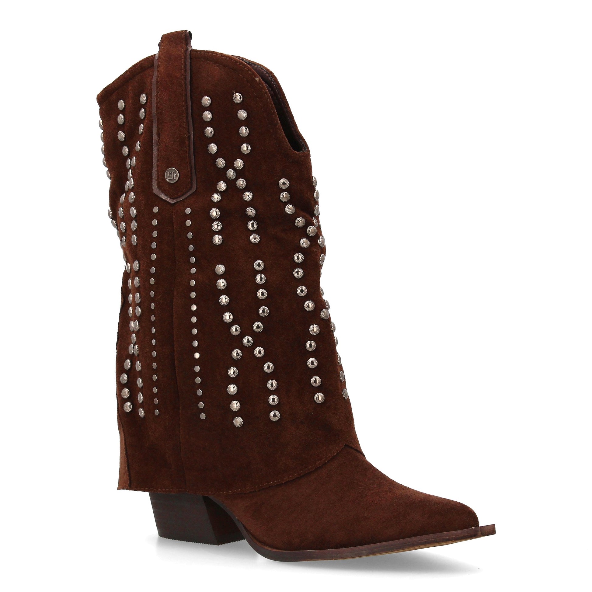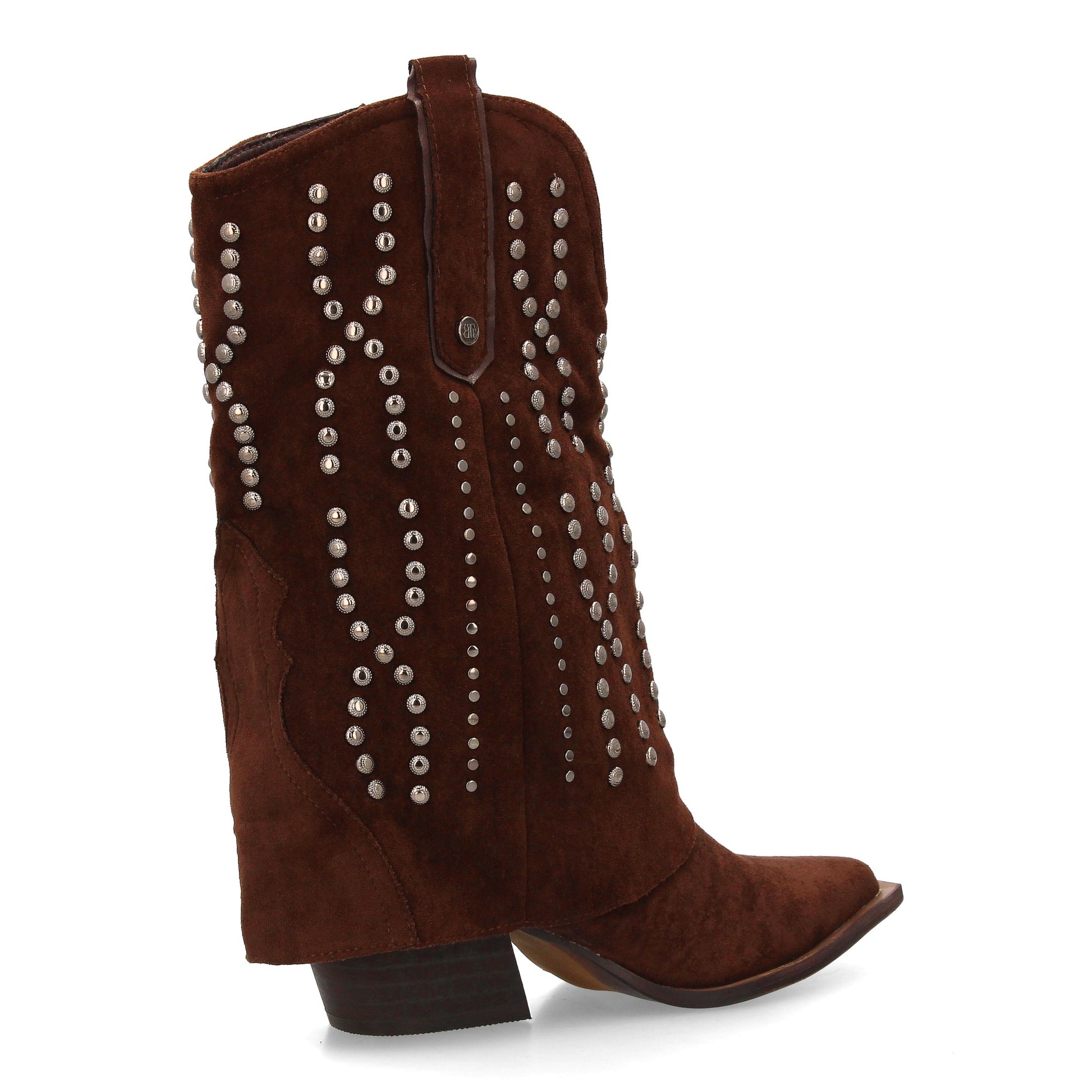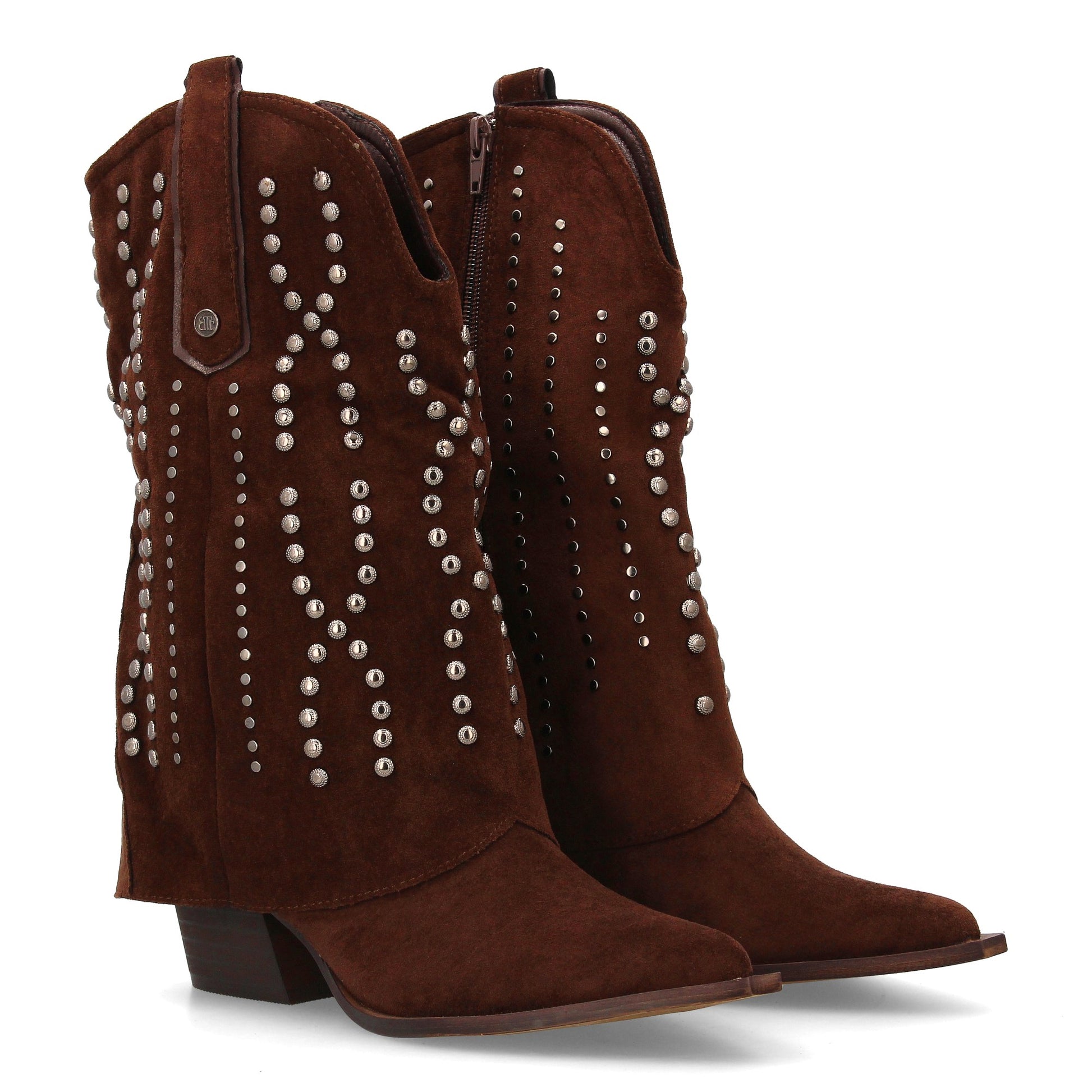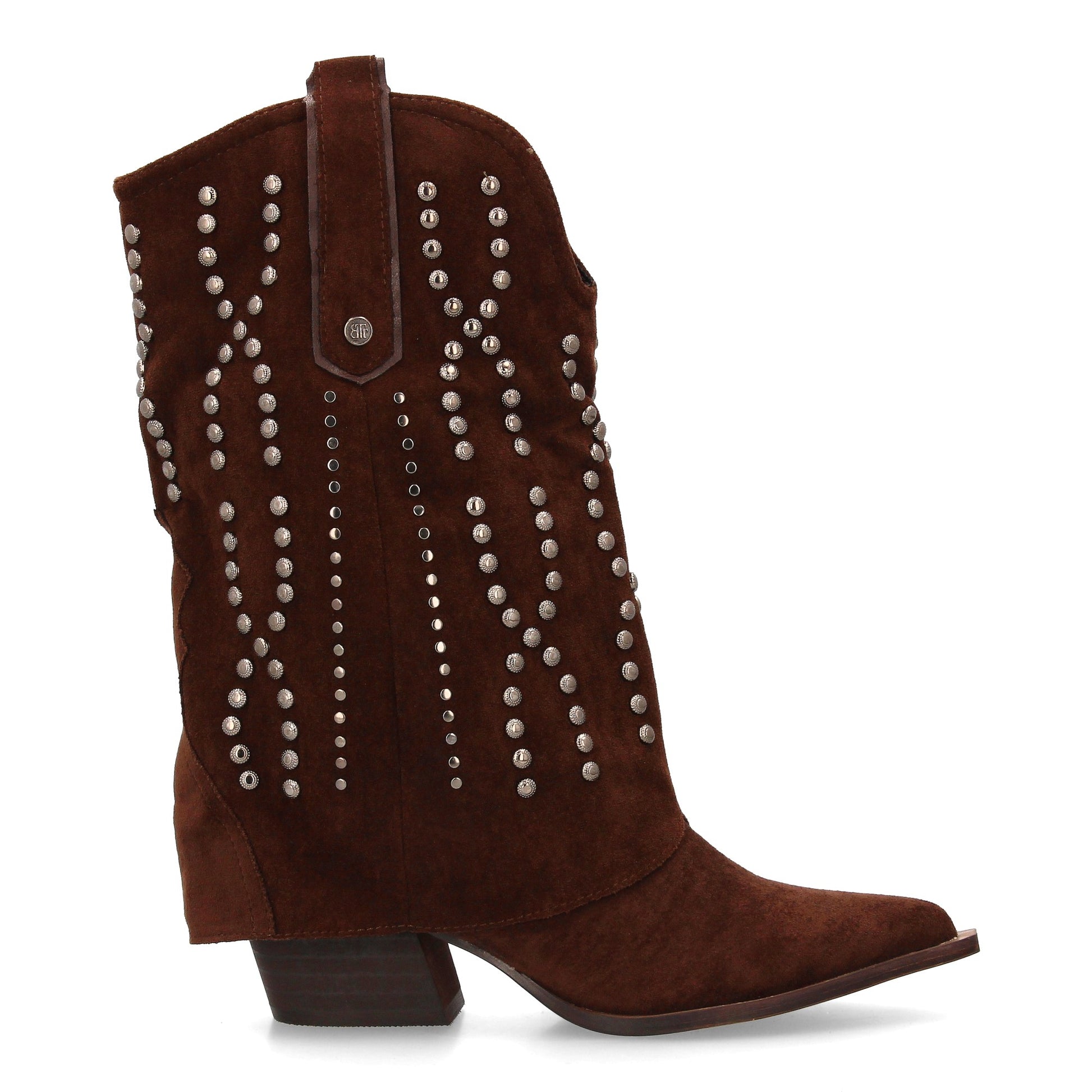 Bota de caña media con diseño western y microtachuelas metálicas sobre acabado ante. Cierre lateral interior y tacón medio.