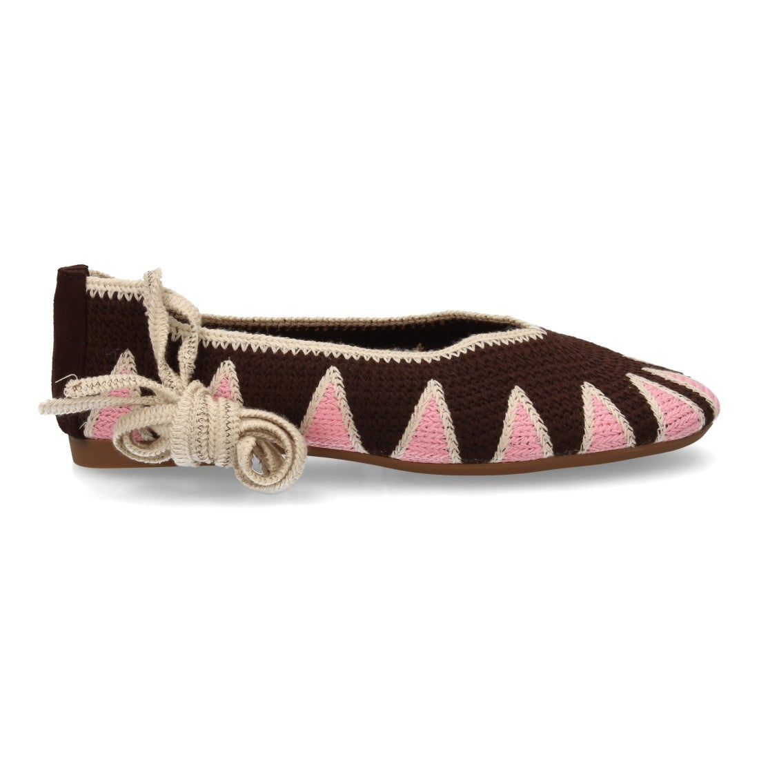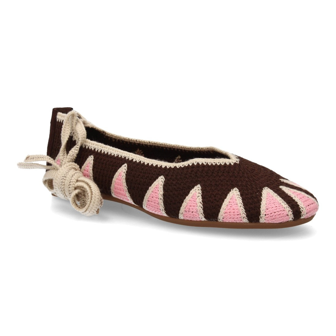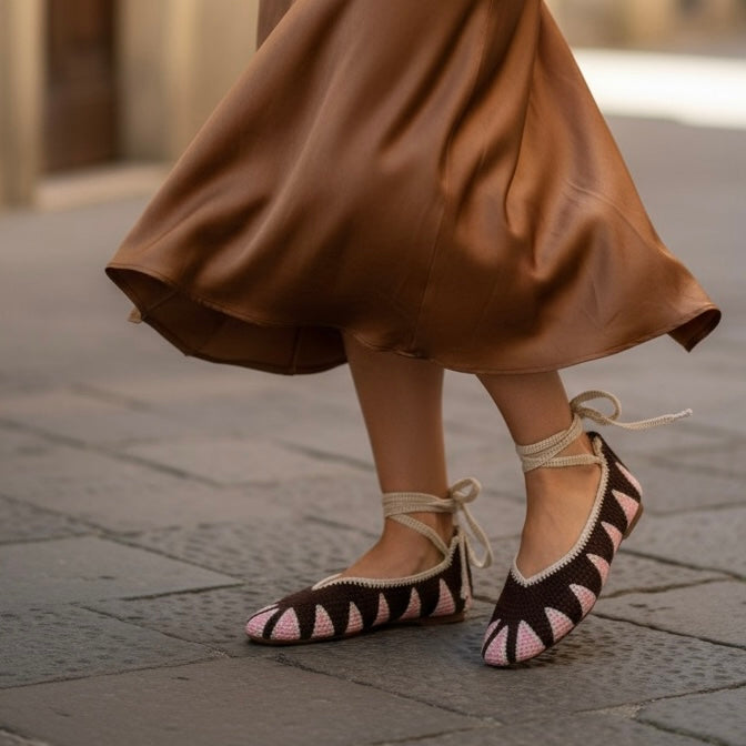 Bailarinas crochet, hecho a mano. Cierre de lazada ajustable en la parte trasera para un calce personalizado. Mezcla de colores en contraste y suela ligera.