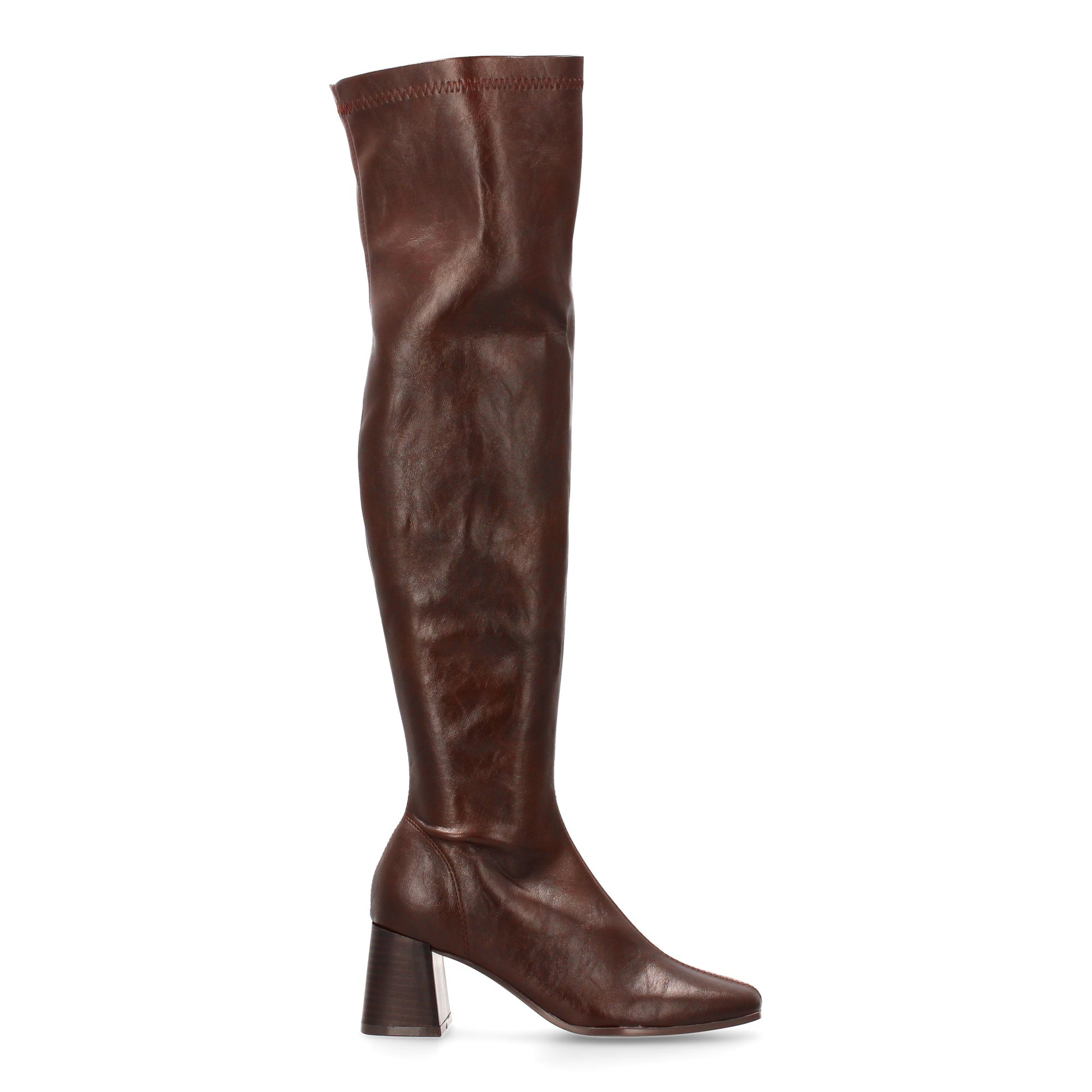 Bota alta por encima de la rodilla en color marrón con acabado efecto piel.