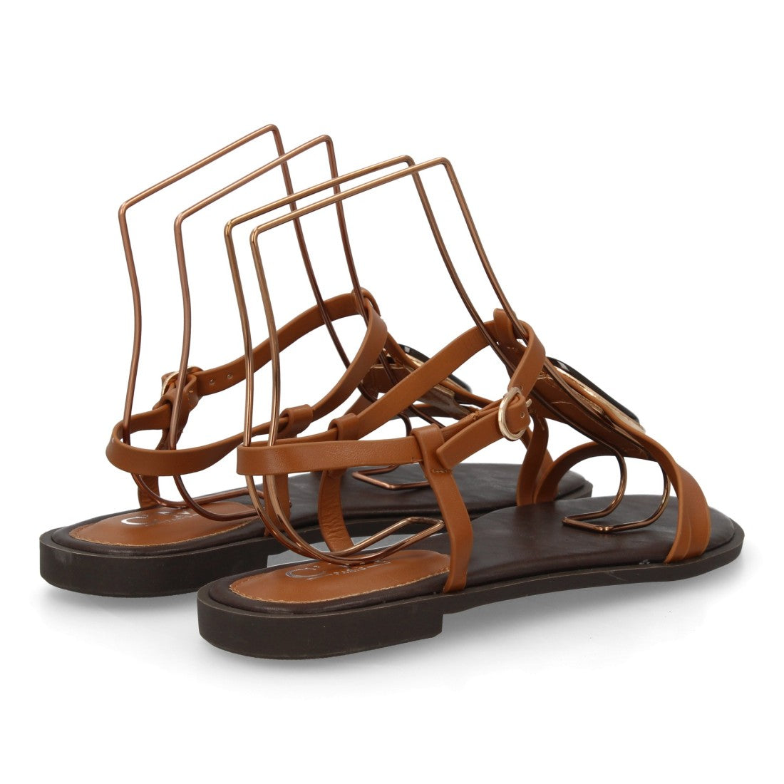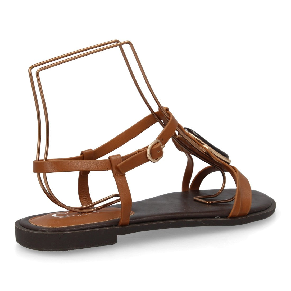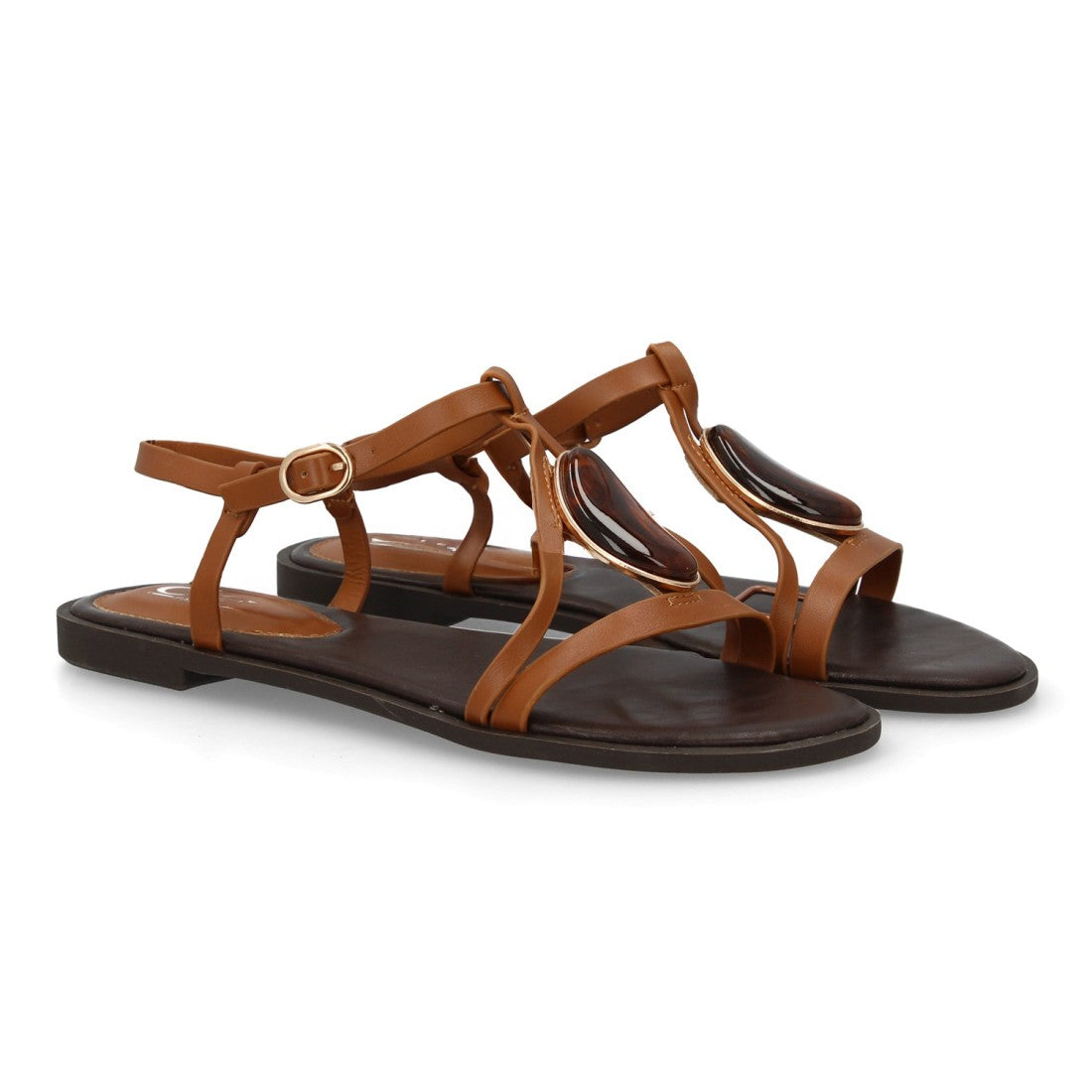 Sandalia plana con adorno de piedra en el empeine y tiras cruzadas.