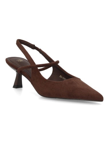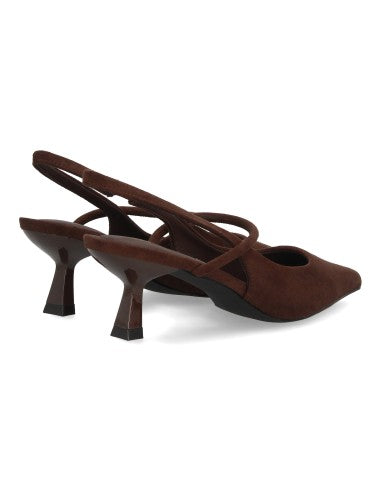 Zapato destalonado con tacón bajo, punta fina y tira cruzada. Estampado liso.