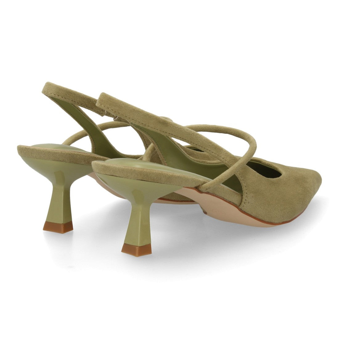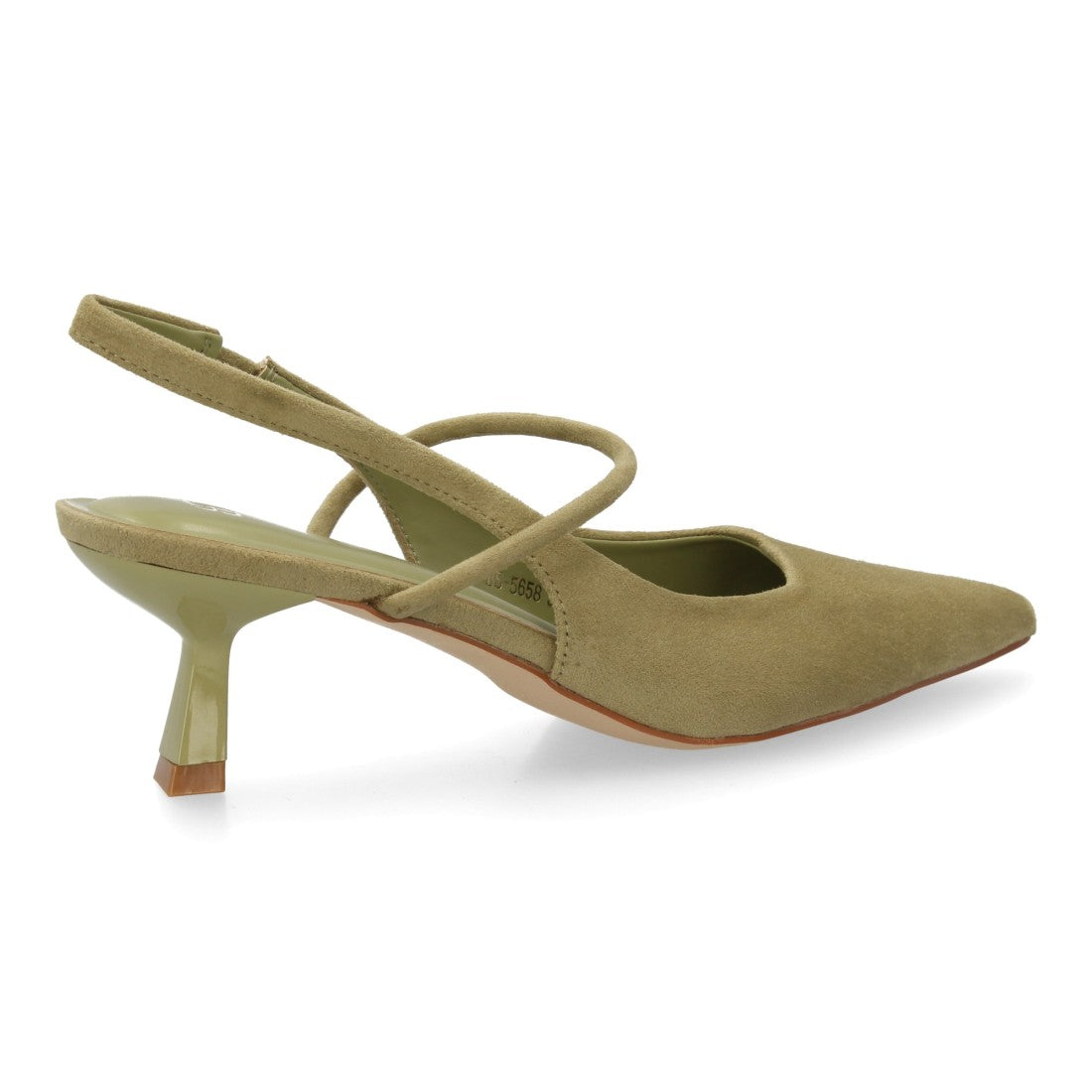 Zapato destalonado con tacón bajo, punta fina y tira cruzada. Estampado liso.
