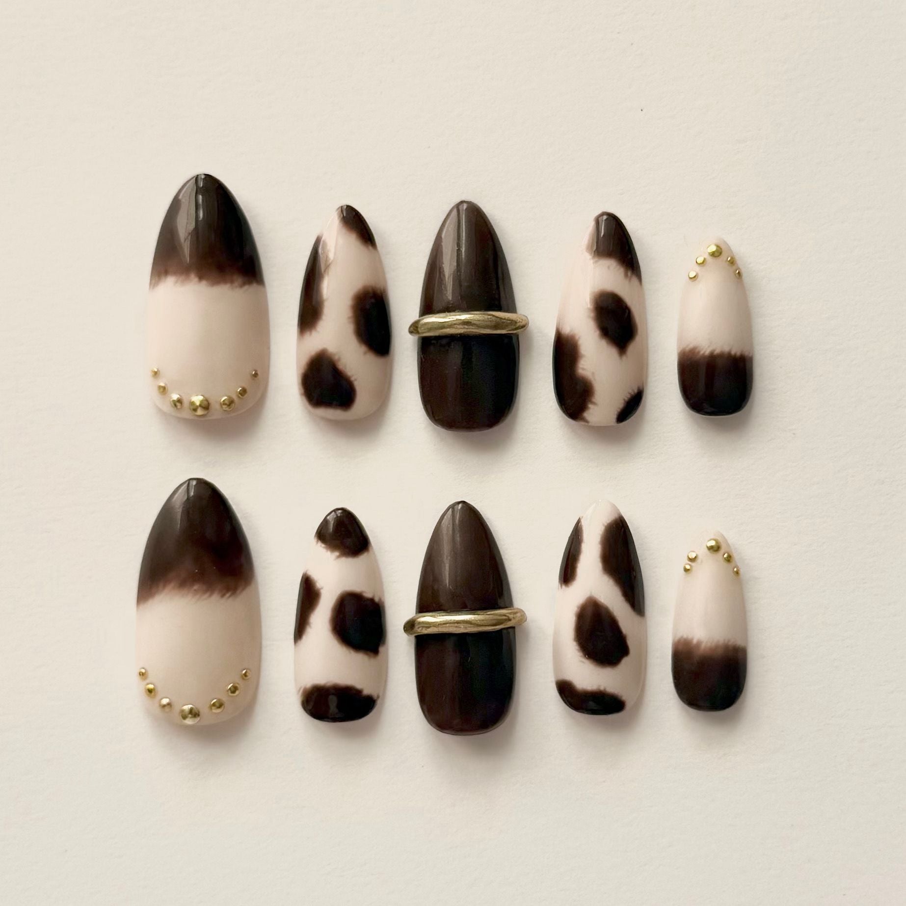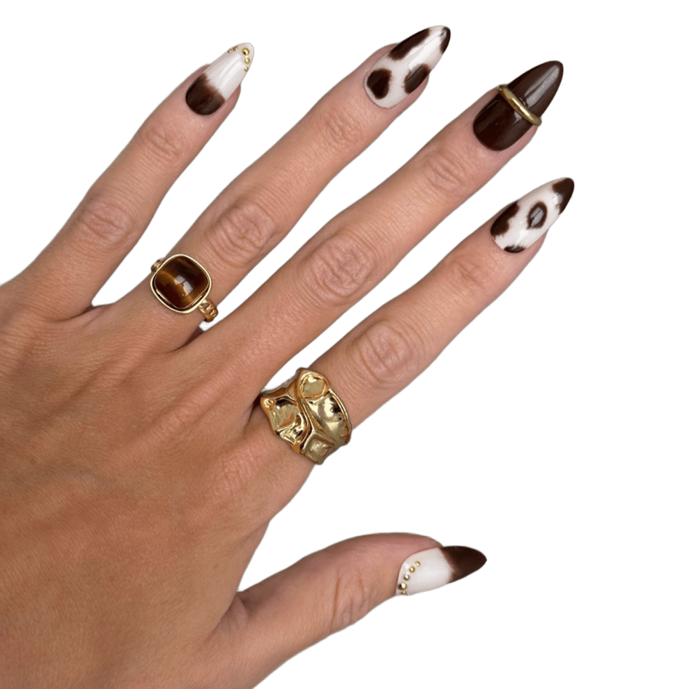 Set de uñas press on con acabado en tonos nude y marrón oscuro, inspiradas en el clásico estampado de “cow print”. El diseño combina piezas con detalles metálicos en dorado —mini perlas y anillos— que realzan su elegancia y exclusividad.