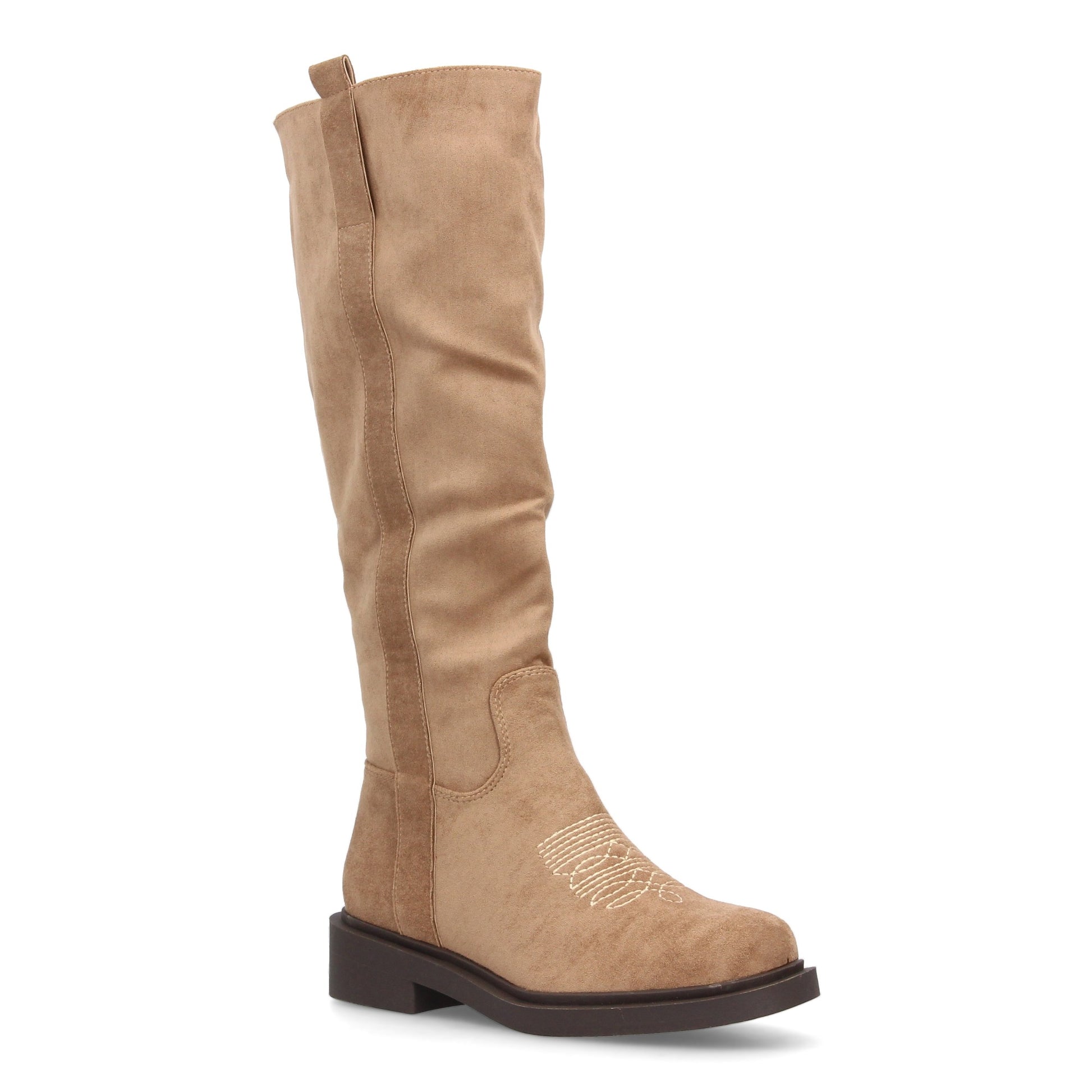 Bota plana con caña alta. Confeccionada en ante sintético suave con bordado frontal sutil y acabado estructurado.