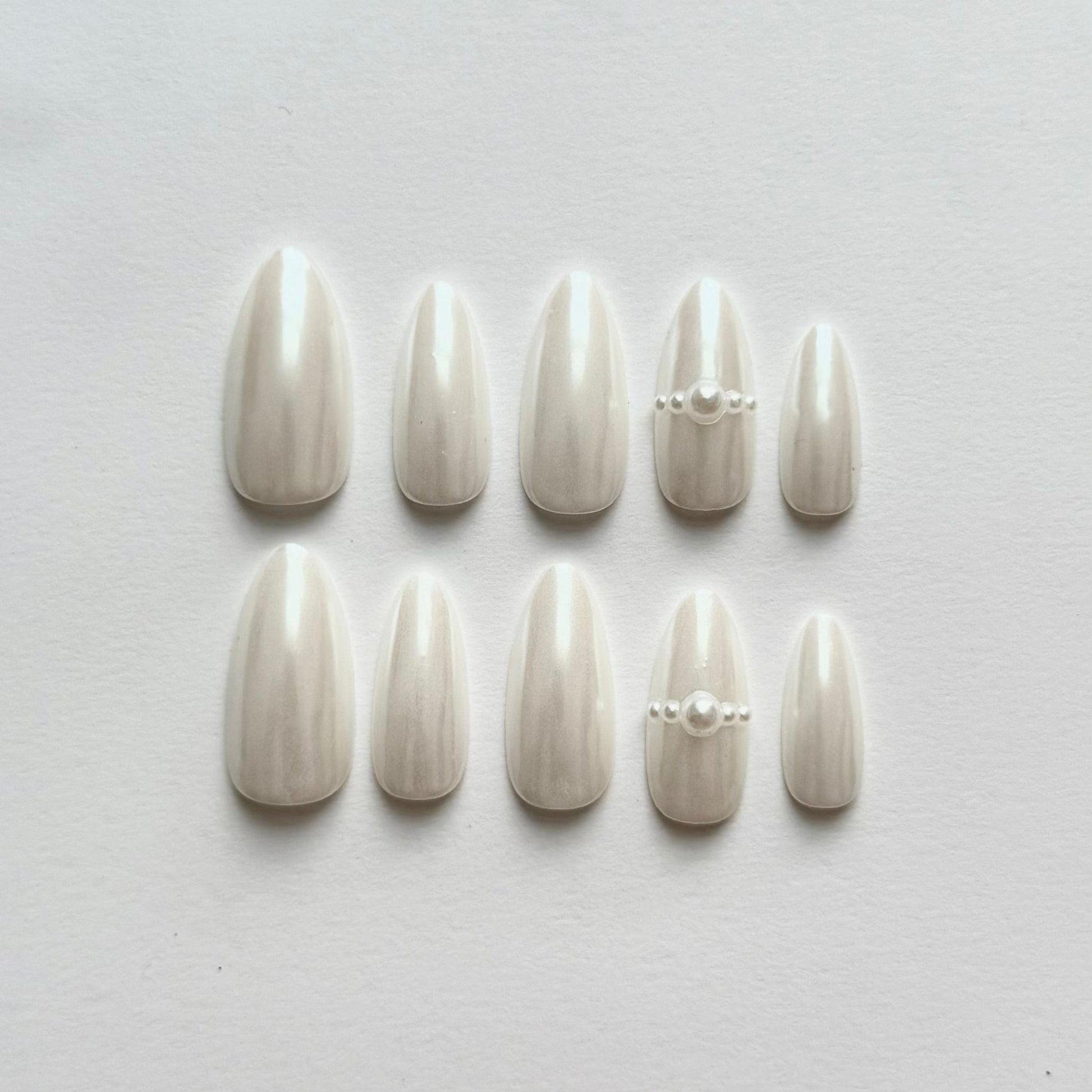 Set de uñas press on en tono blanco perlado con acabado nacarado, adornado con delicadas aplicaciones de perlas en dos uñas que aportan un detalle distintivo y elegante. Su estilo cómodo y atemporal lo convierte en la opción ideal para ocasiones especiales, eventos formales o para quienes buscan un look refinado y glamuroso. Un diseño exclusivo que combina minimalismo y lujo en una sola propuesta.