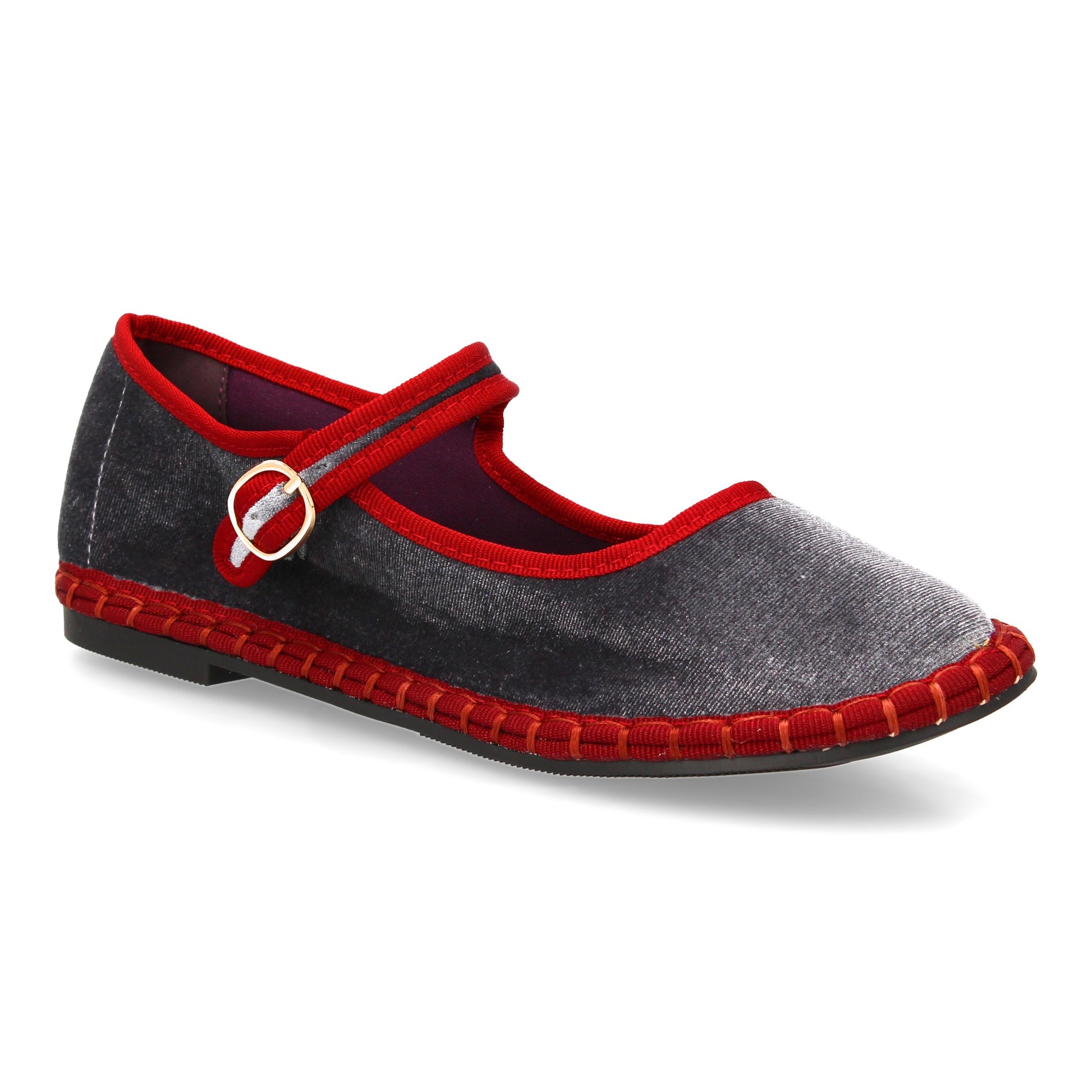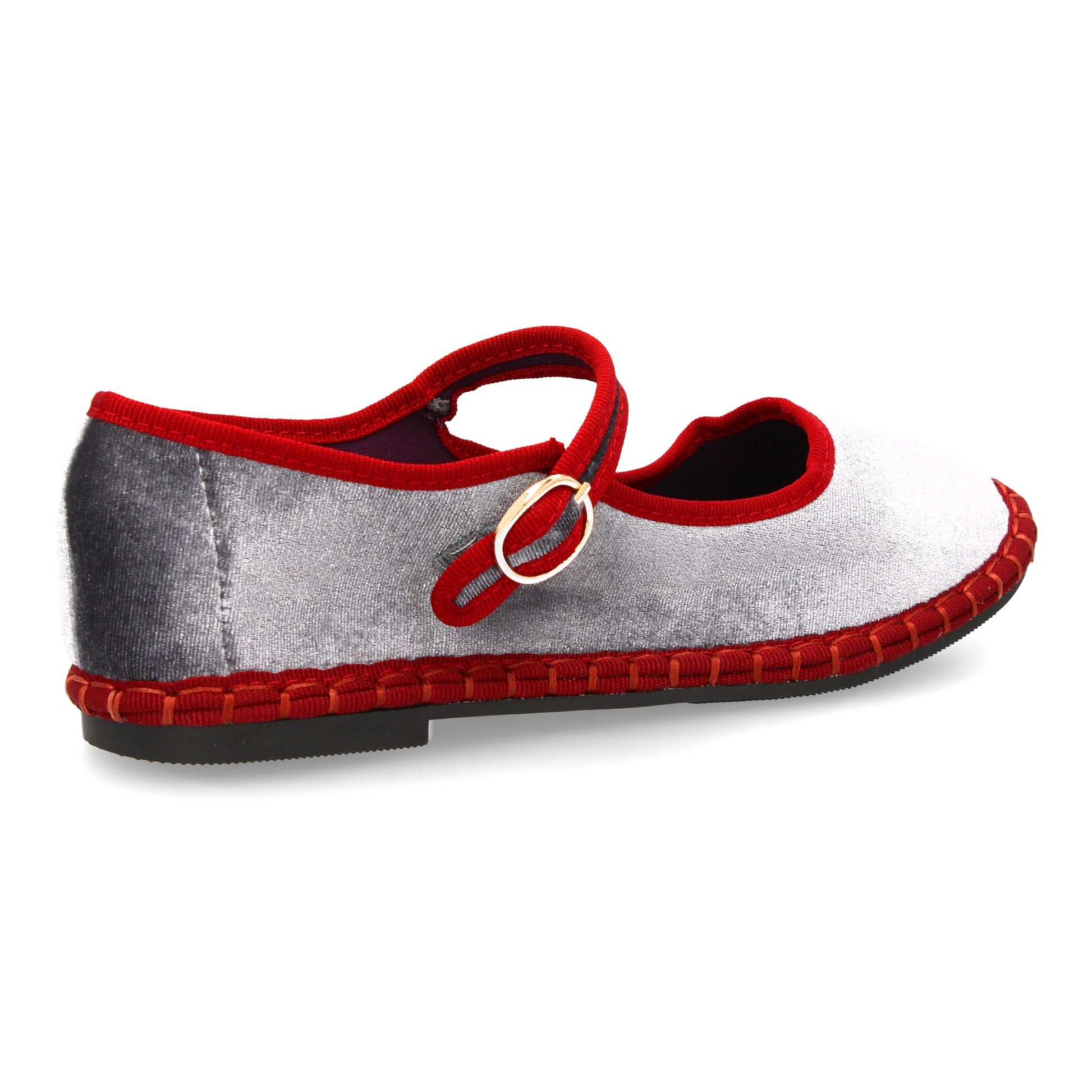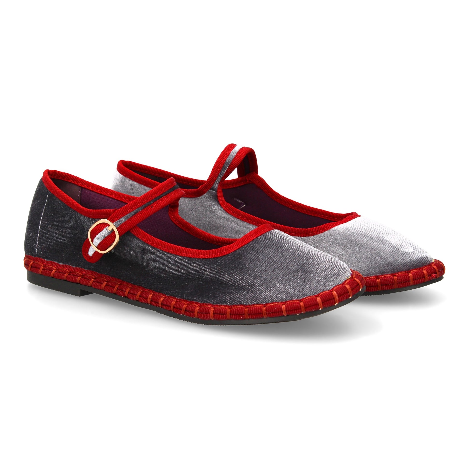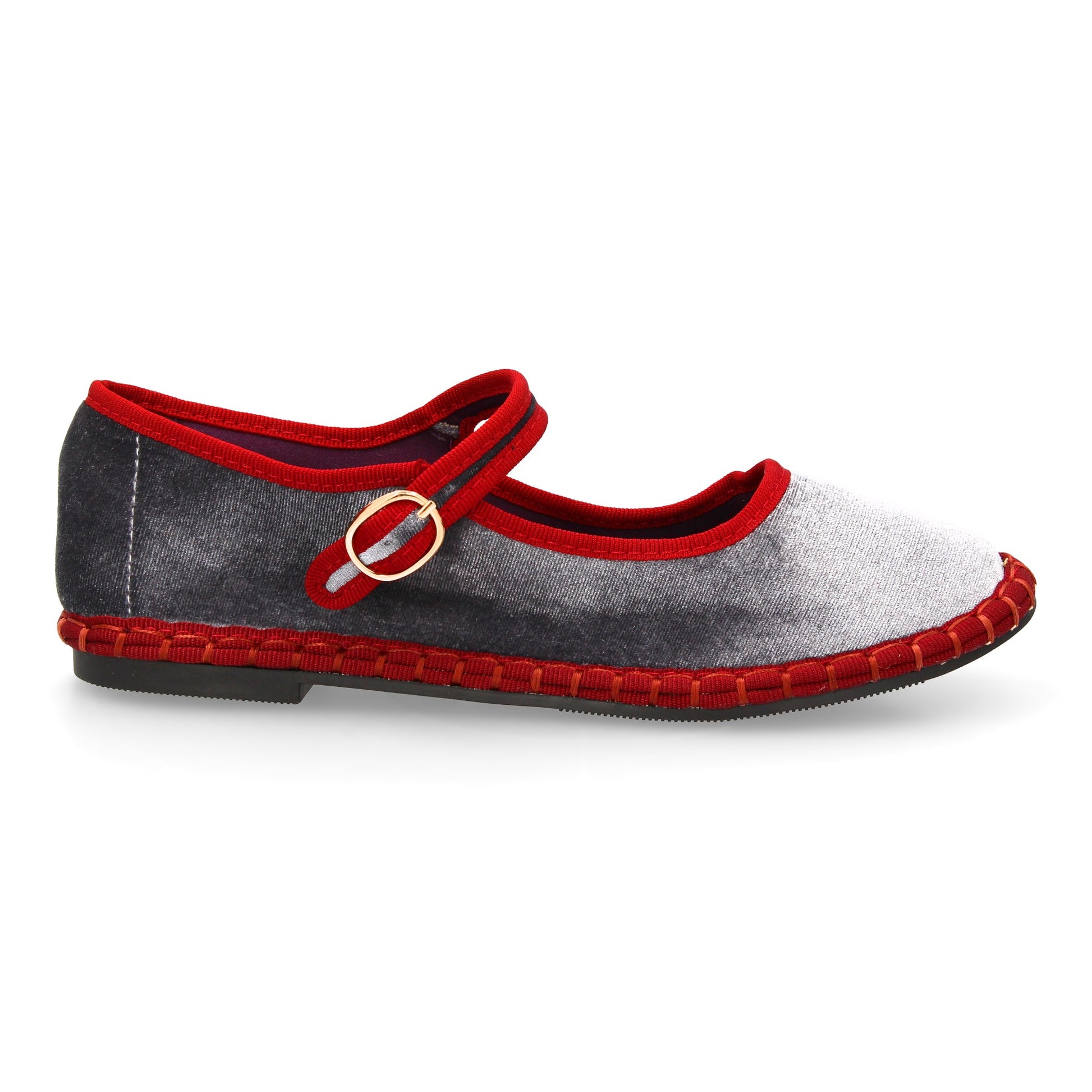 Bailarina tipo mercedita con pulsera ajustable y acabado de terciopelo suave. Borde textil en contraste y suela plana ligera.