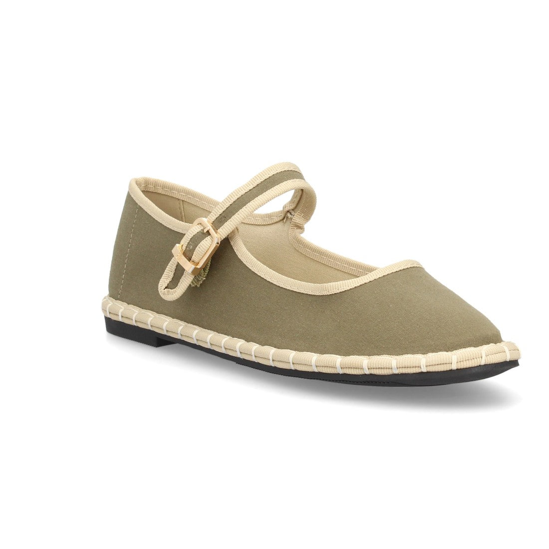 Bailarina con pulsera ajustable y acabado de terciopelo suave. Borde textil en contraste y suela plana ligera.