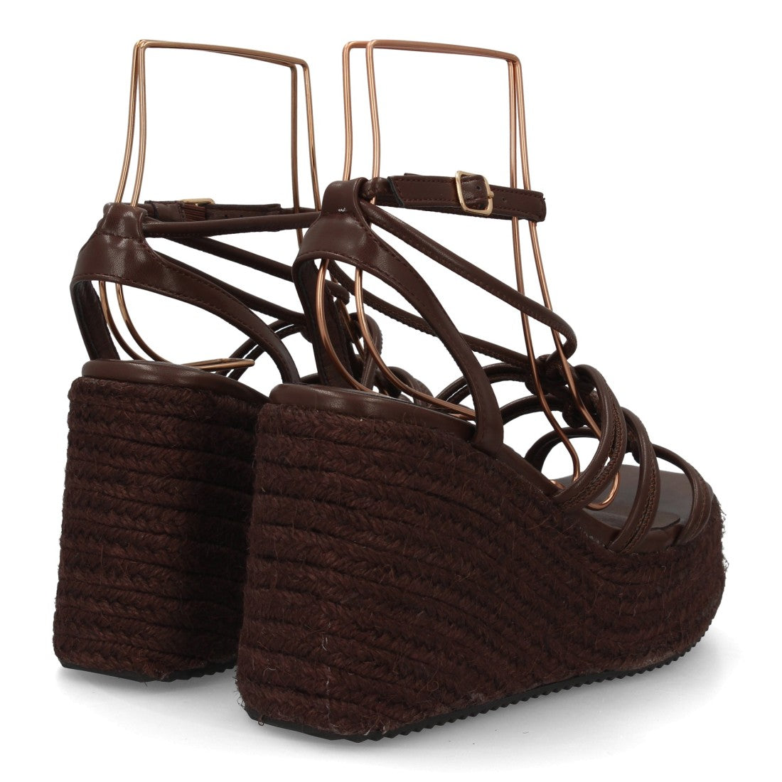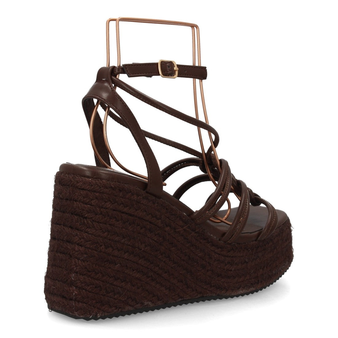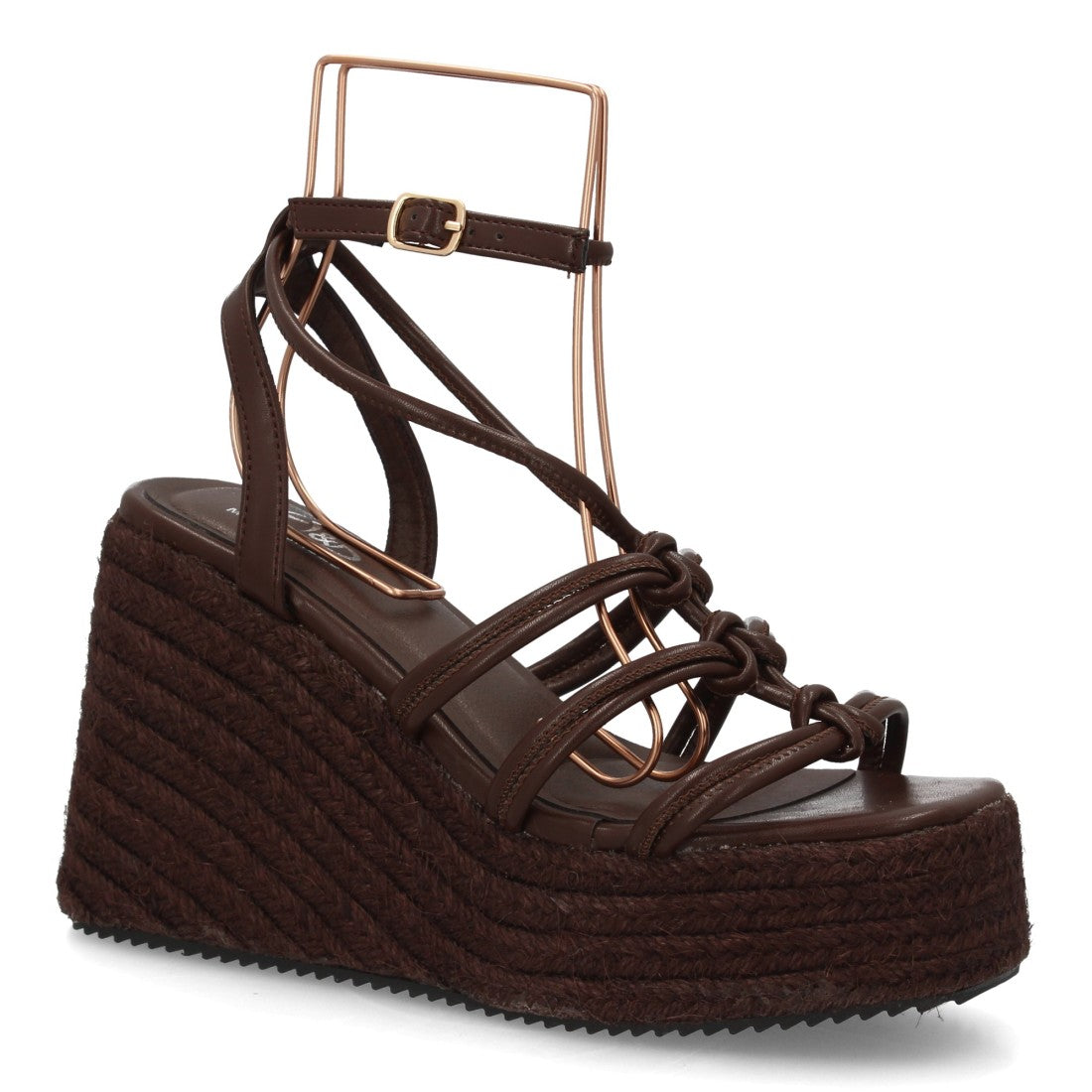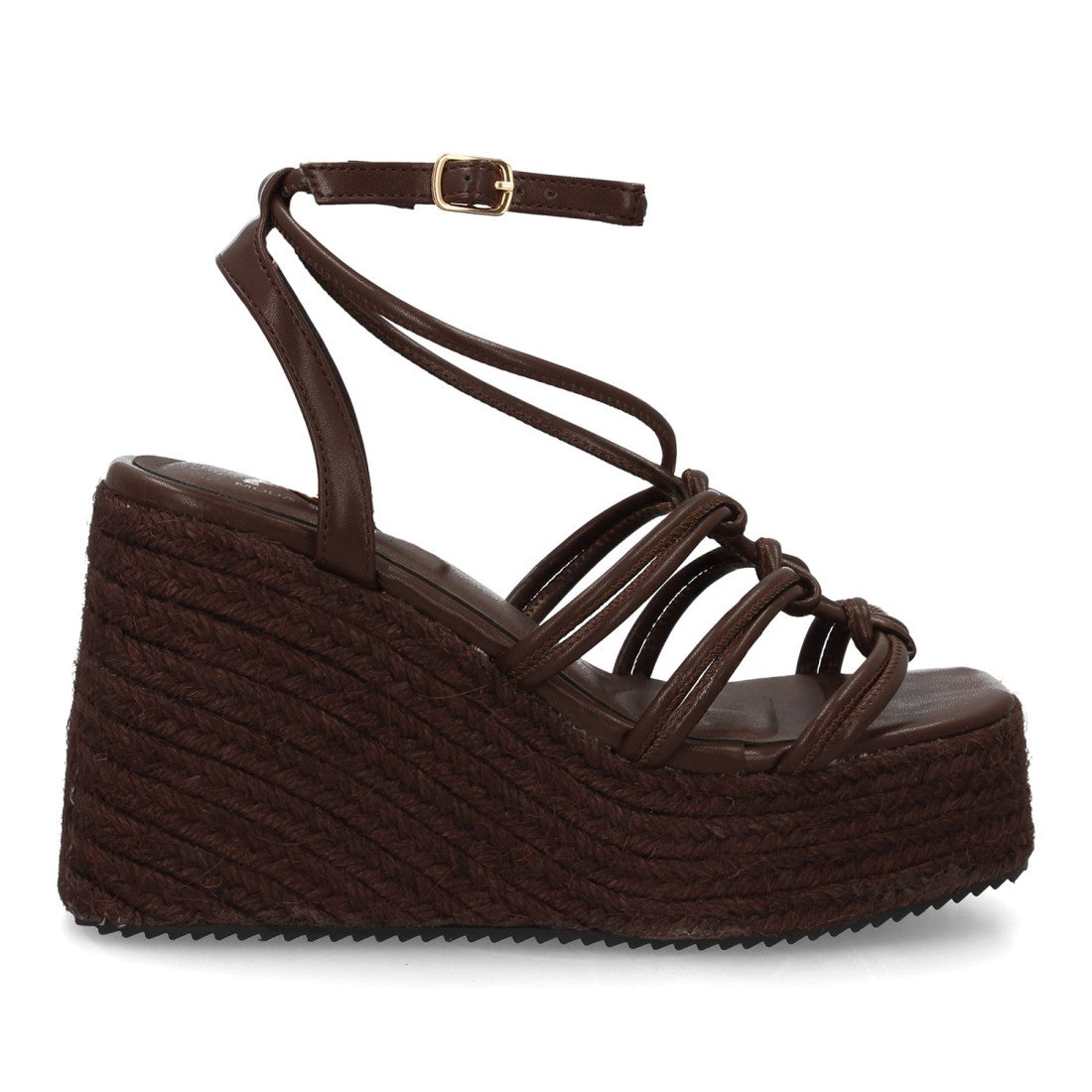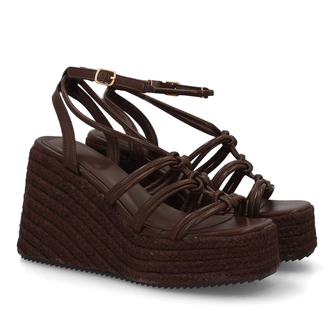 Sandalia con cuña alta y plataforma de esparto, máxima comodidad. Diseño de tiras múltiples con detalles anudados Cierre con hebilla ajustable.