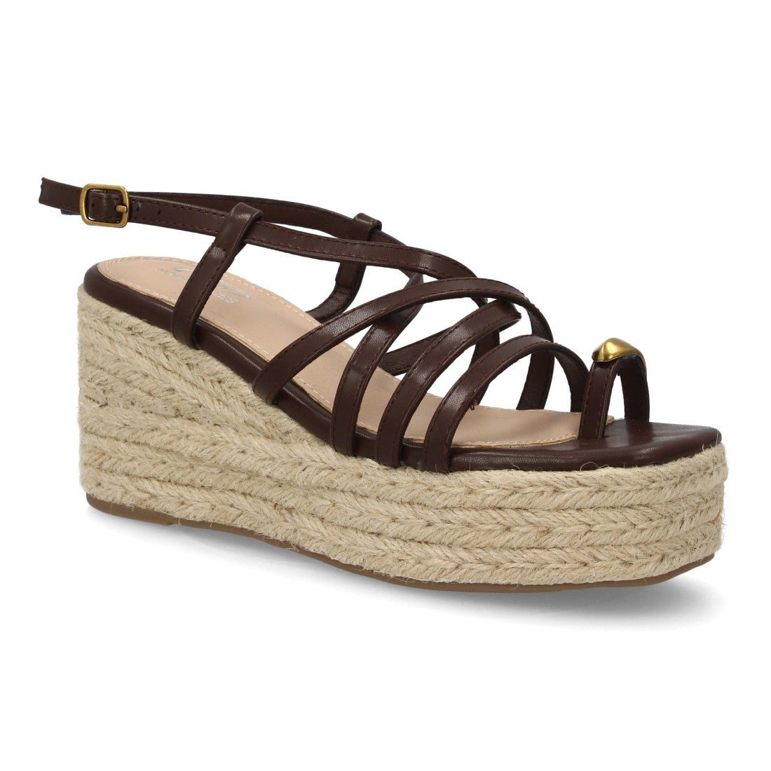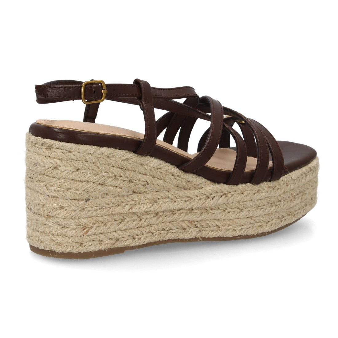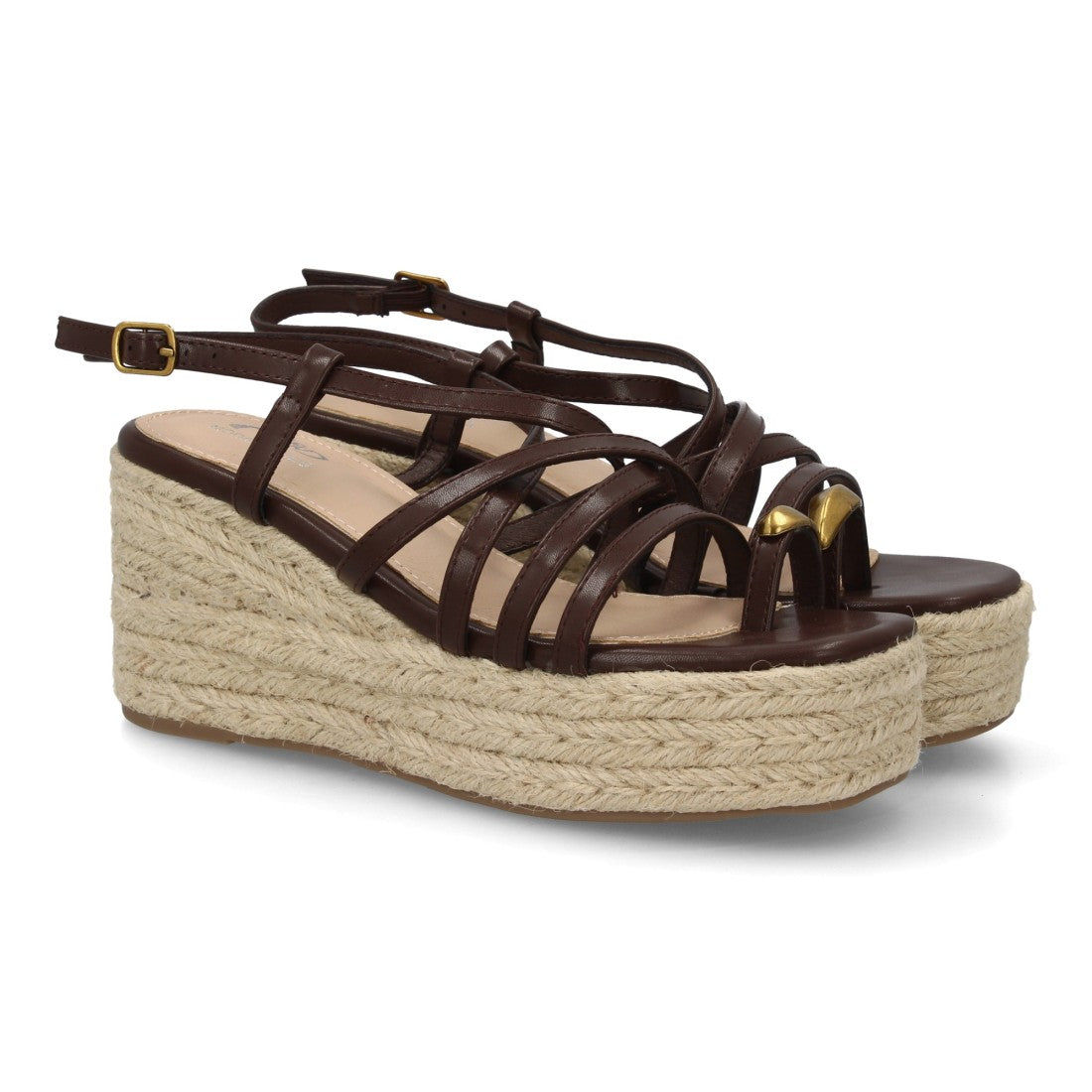 Sandalia de mujer con cuña de esparto y plataforma. Diseño de tiras finas cruzadas y pulsera con cierre de hebilla. Detalle metálico decorativo.