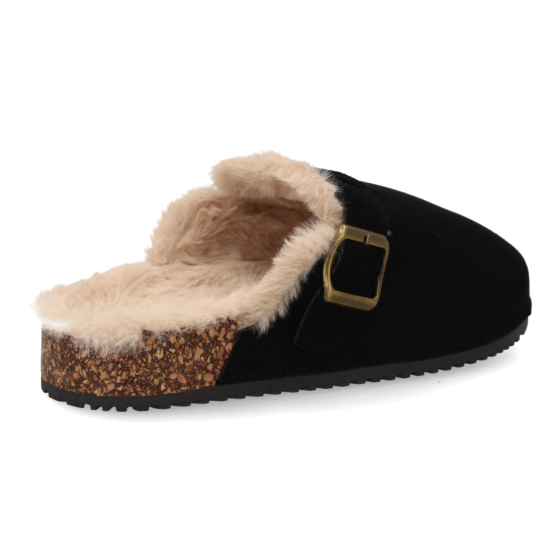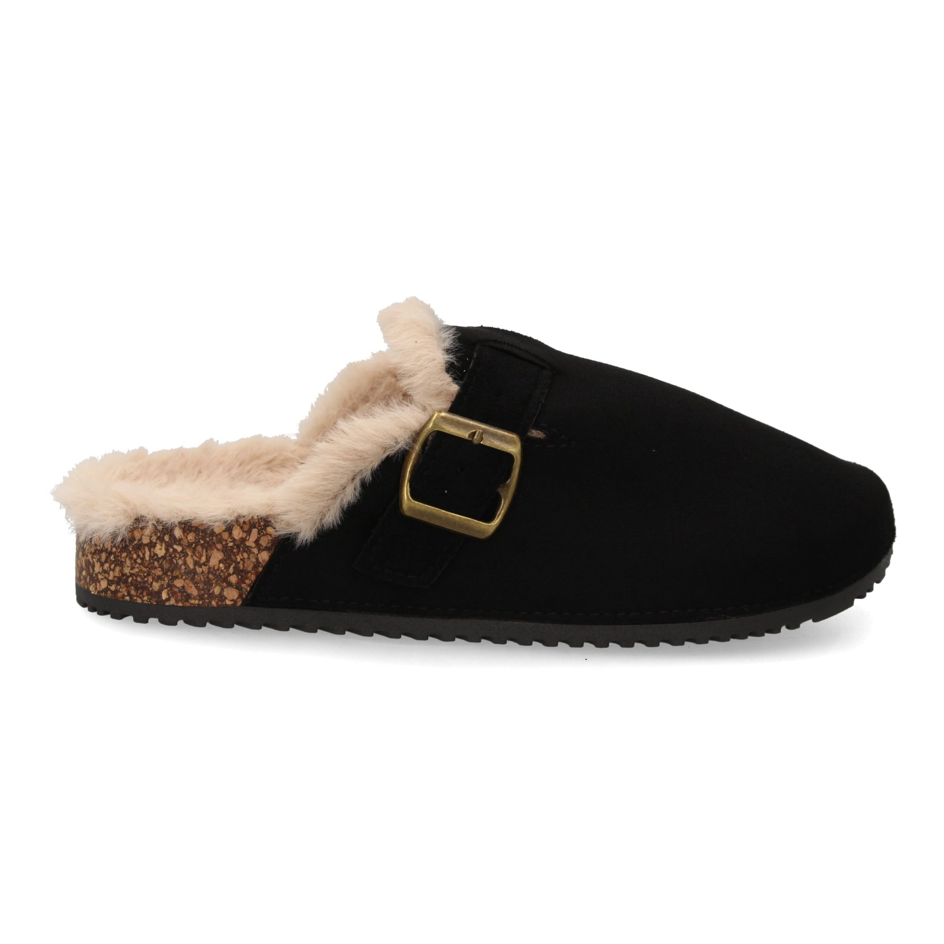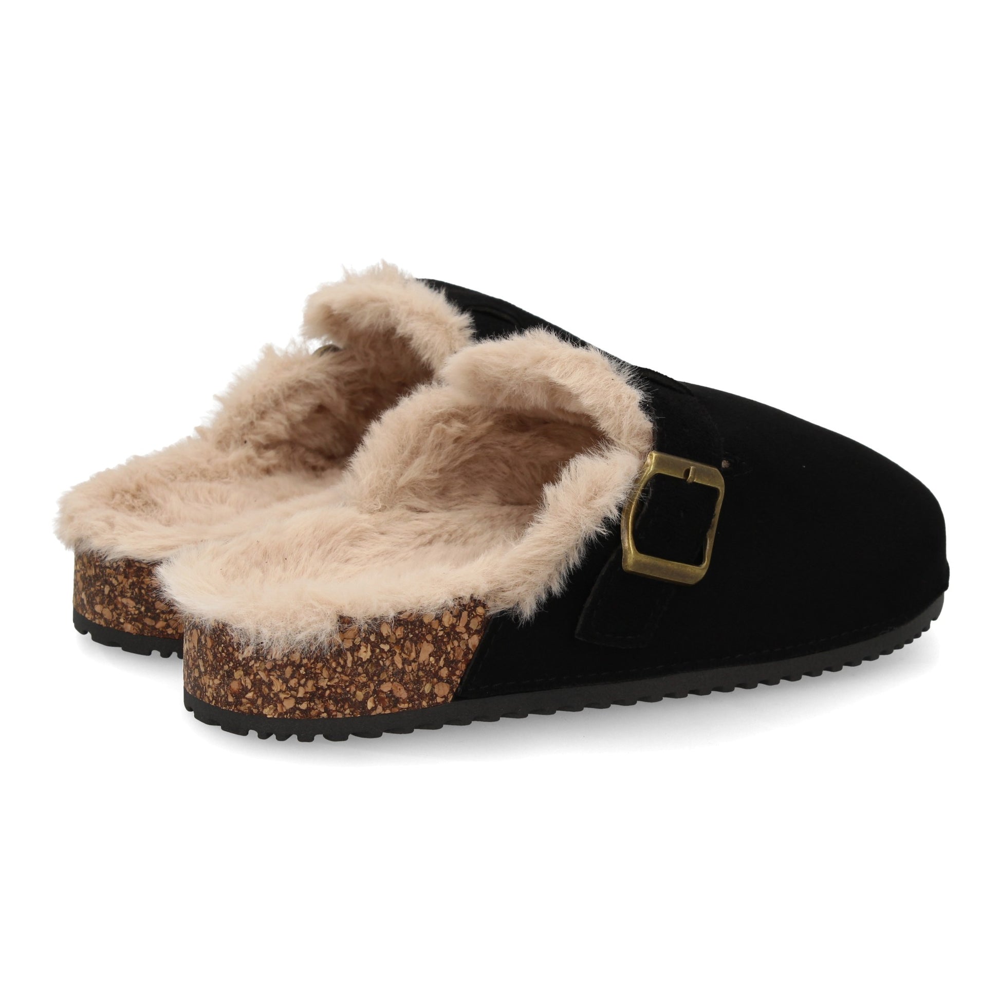 Zueco tipo sabot para mujer con punta cerrada y acabado afelpado. Interior forrado de borreguito sintético suave que aporta calidez.