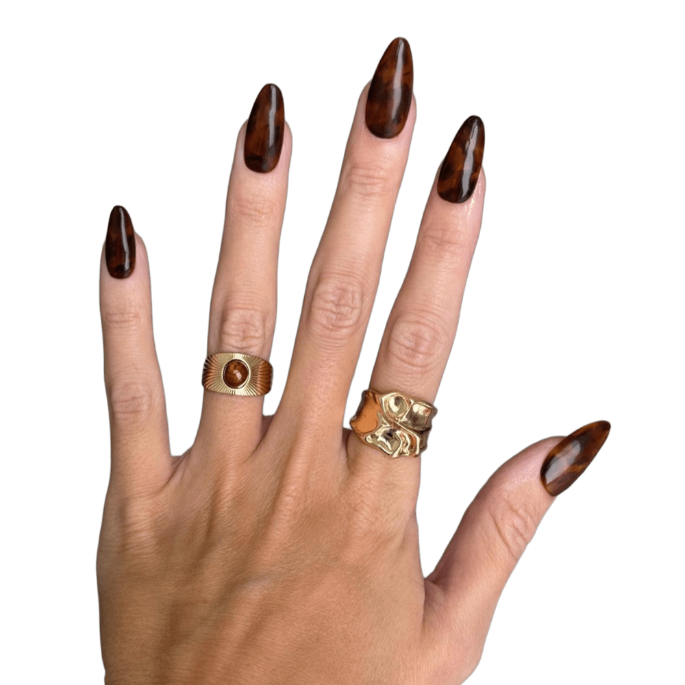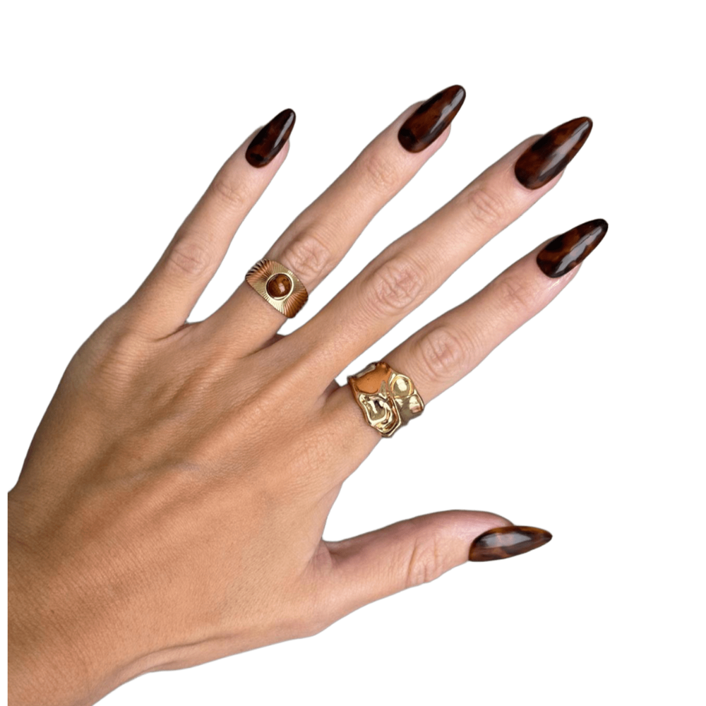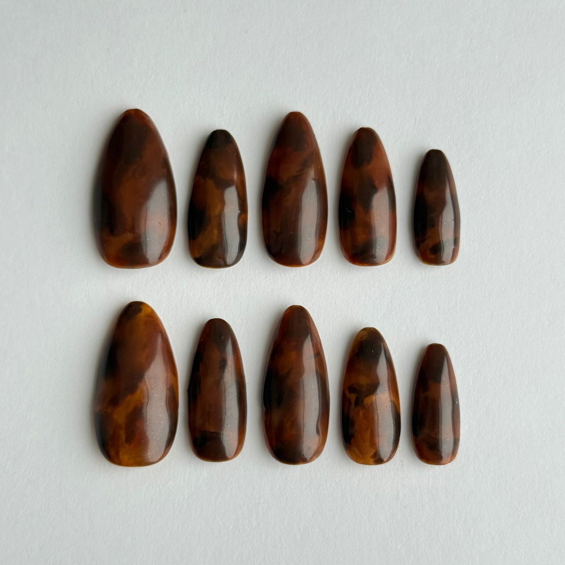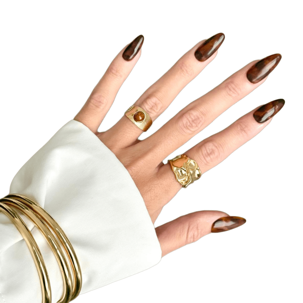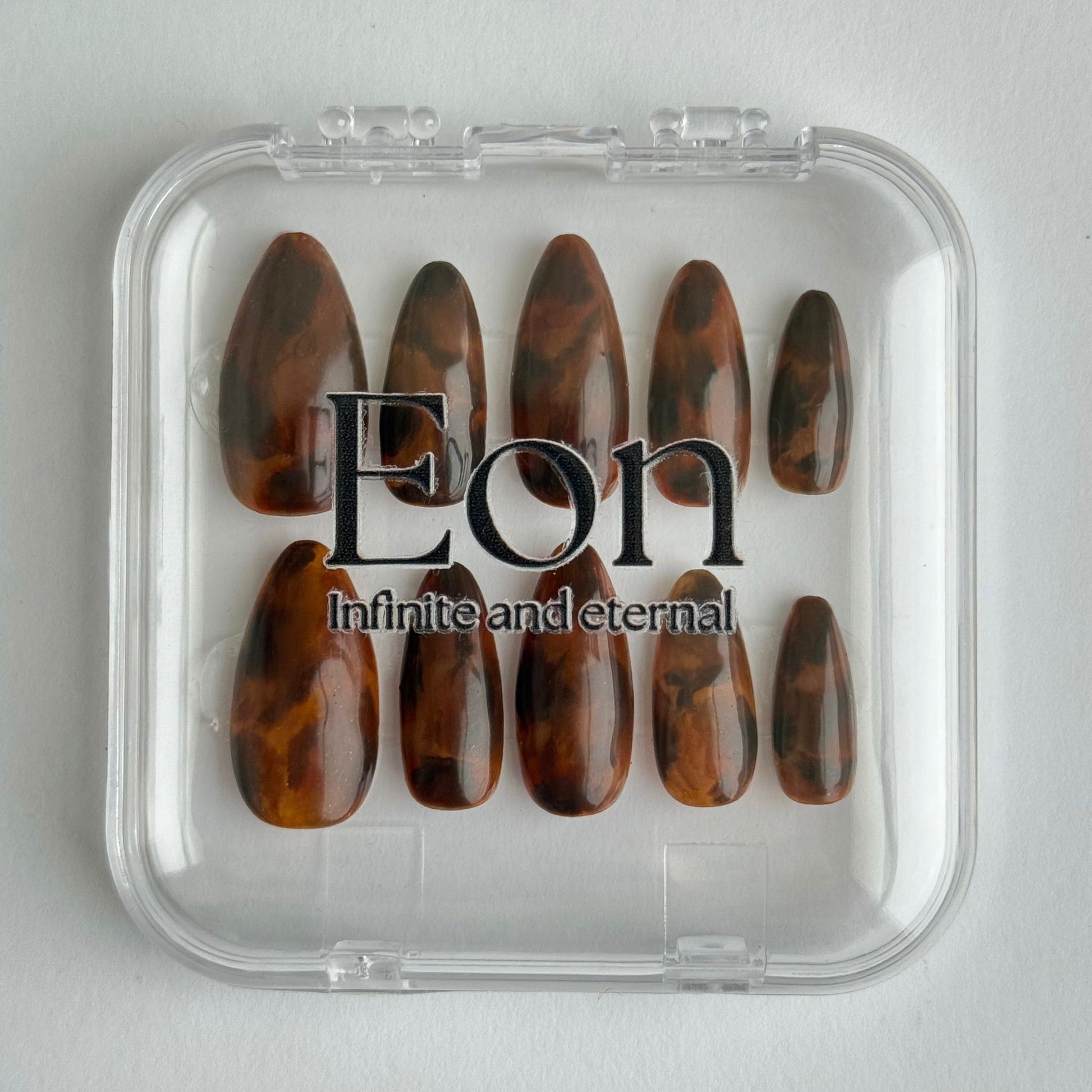 Set de uñas press on con efecto carey en tonos marrones. Su acabado brillante y su mezcla de matices naturales evocan la elegancia clásica del carey, reinterpretada con el estilo atemporal de EON. Un diseño sofisticado y versátil, ideal para esta temporada otoño-invierno.