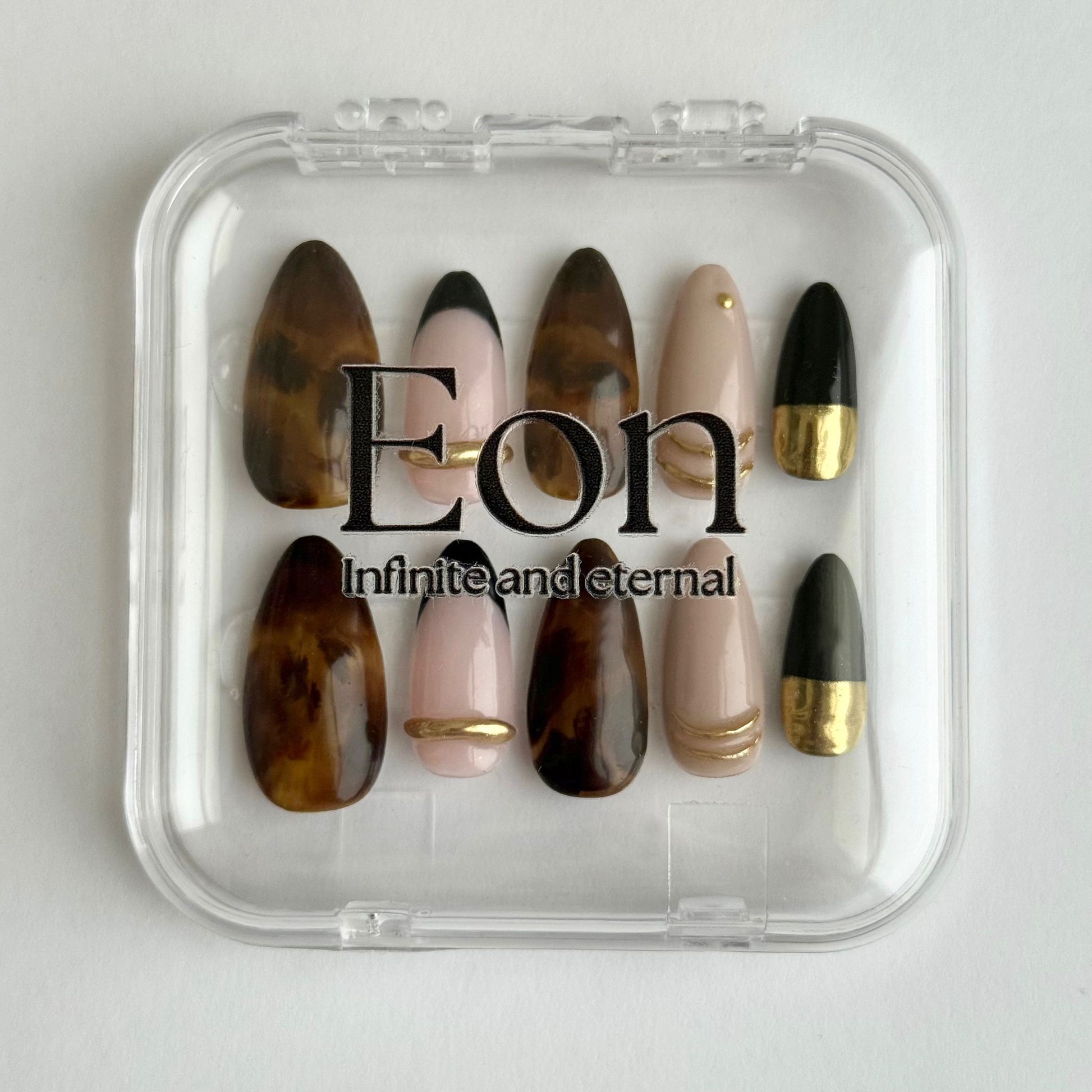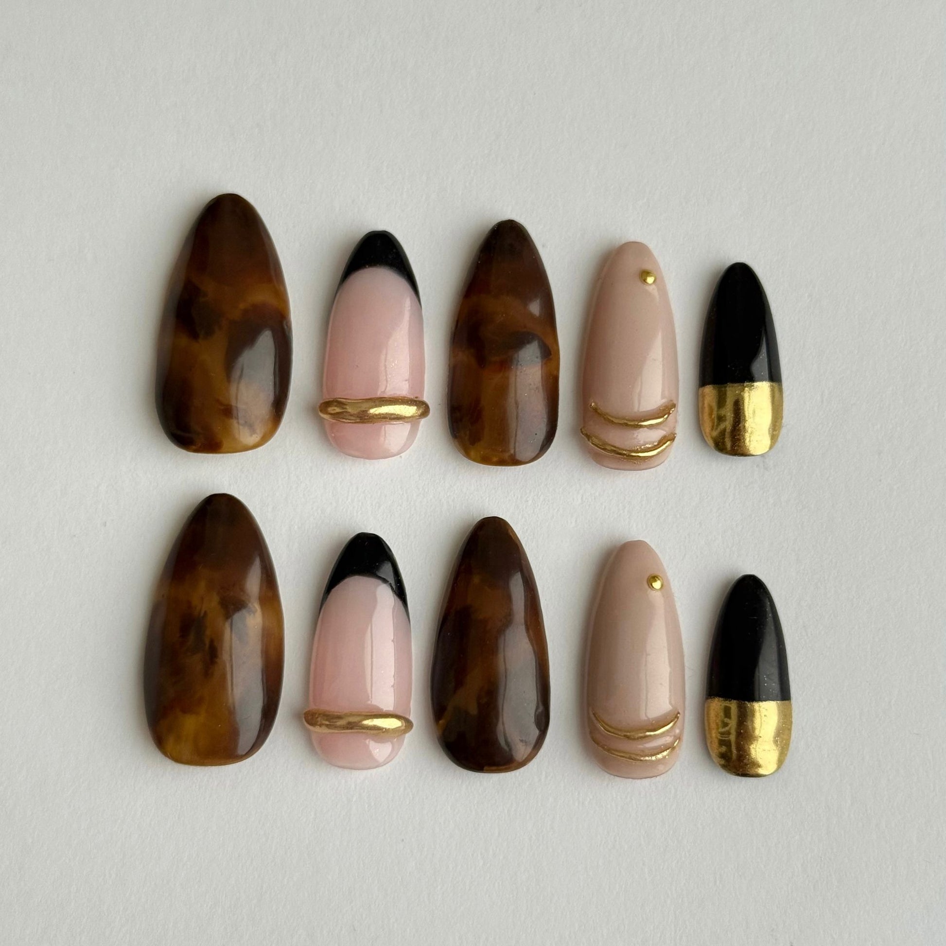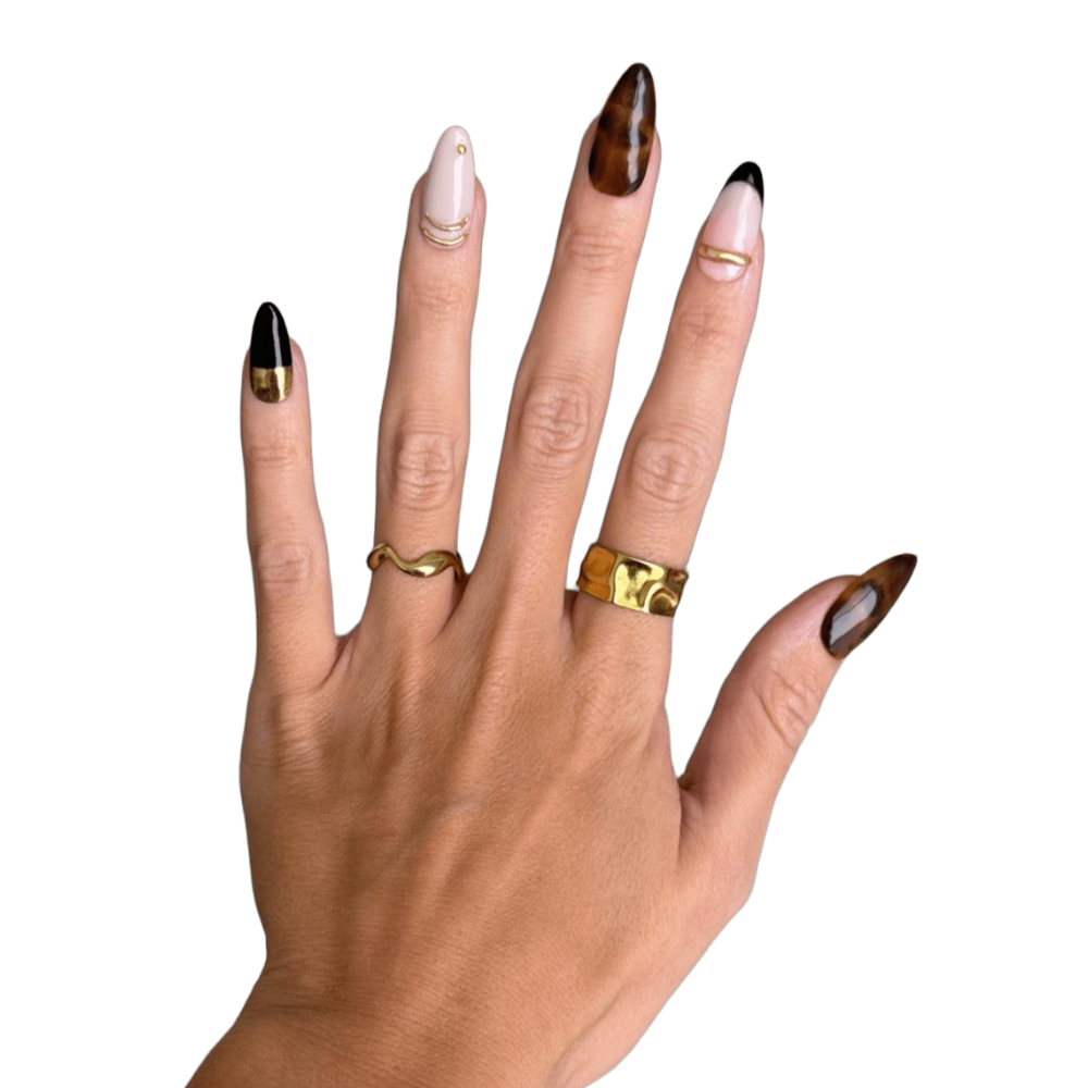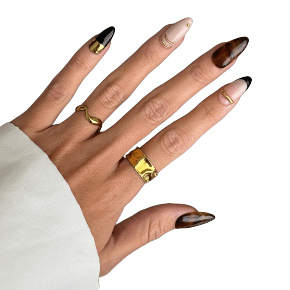 Set de uñas press on que combina el efecto carey con tonos nude, negro intenso y detalles. Este diseño fusiona texturas cálidas y contrastes sofisticados para un resultado moderno y atemporal. Perfecto para quienes buscan destacar con elegancia sin perder sutileza.