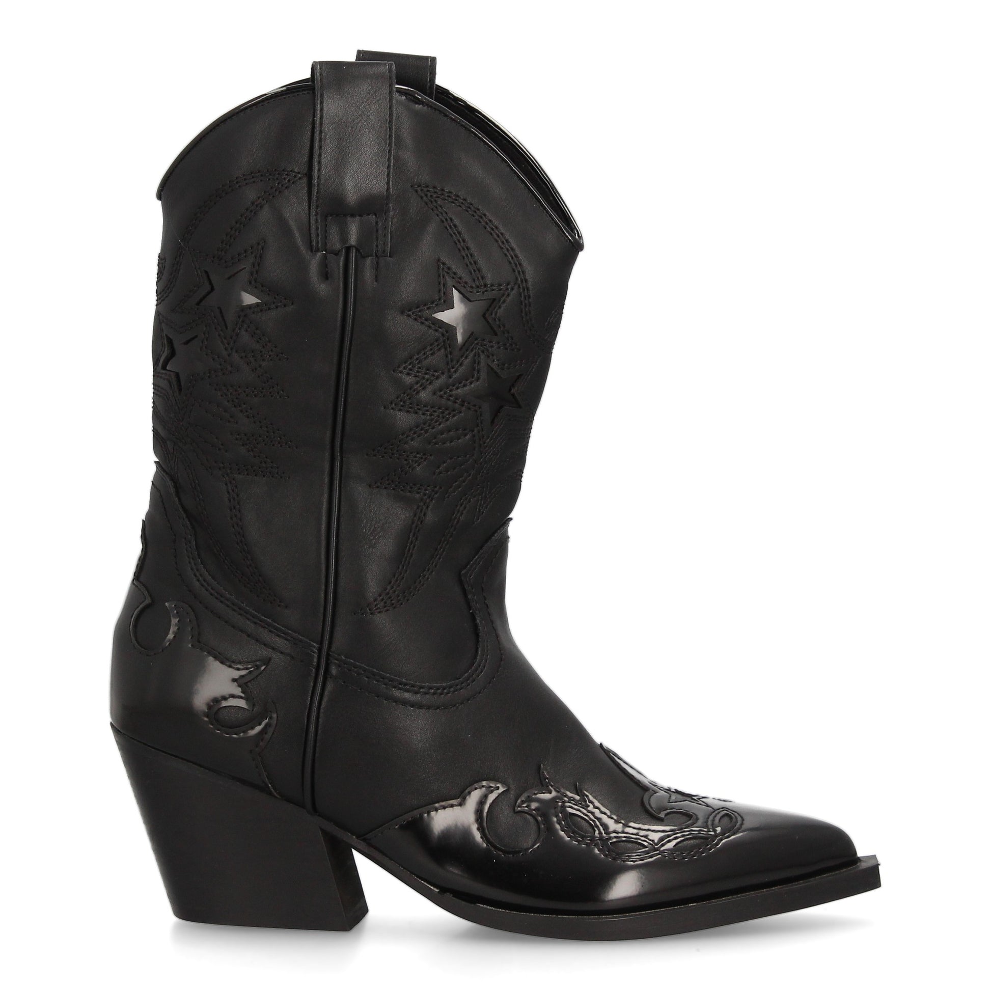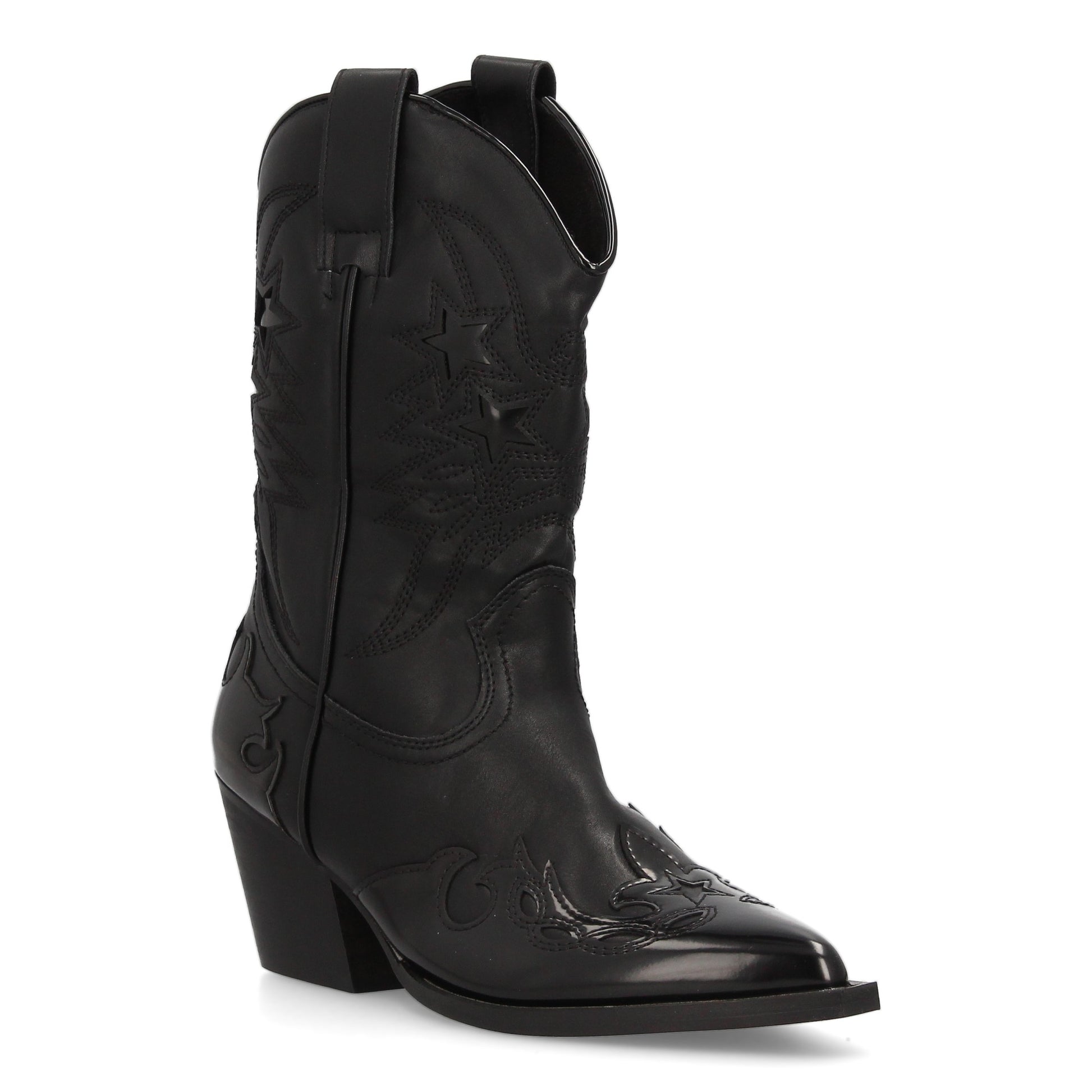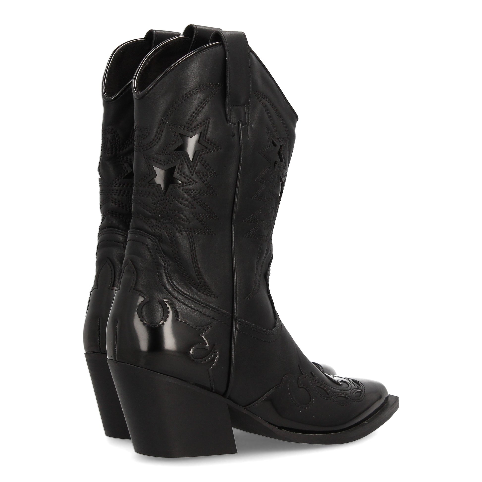 Botín cowboy con bordado de estrellas y diseño estructurado.