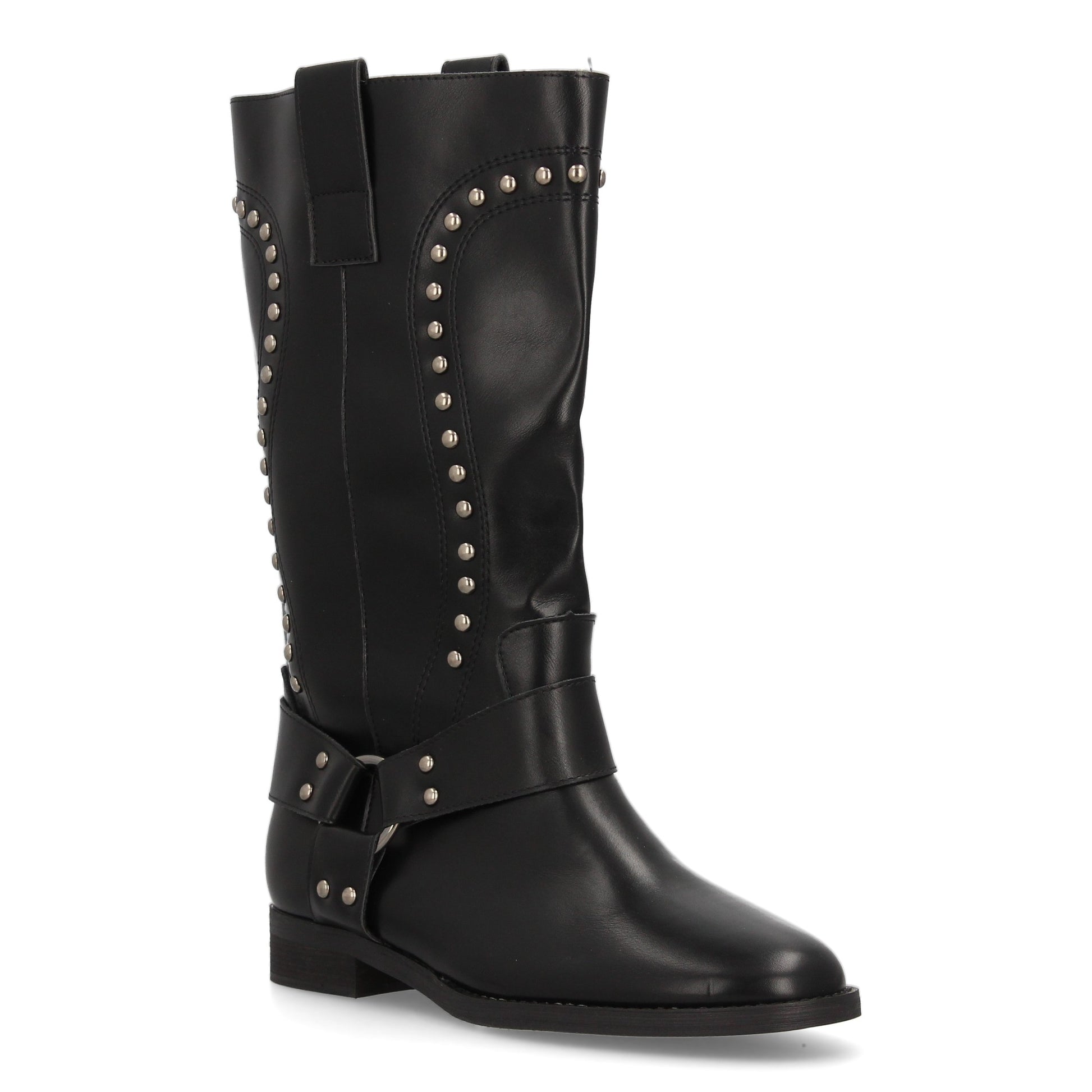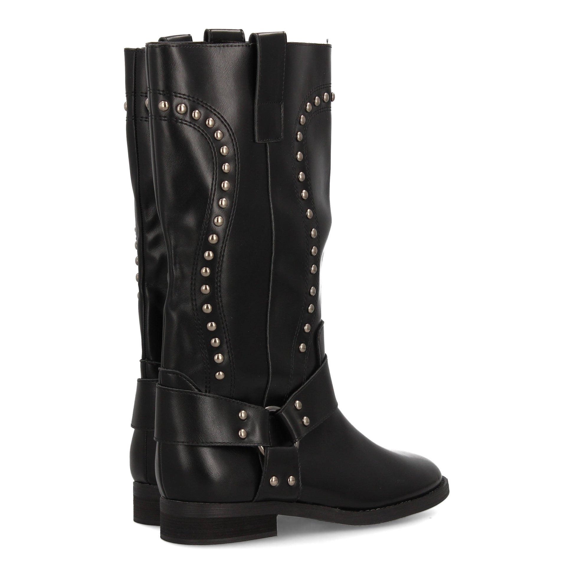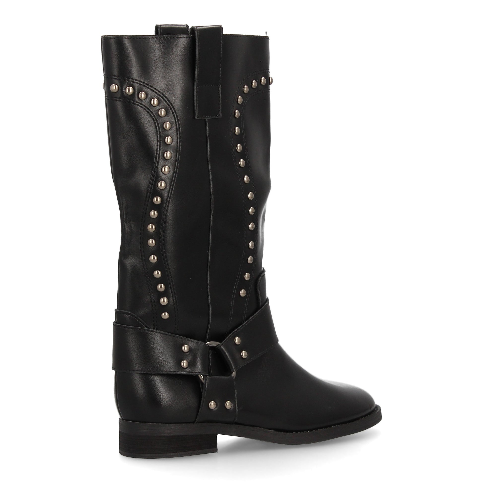 Bota alta para mujer con diseño elegante estilo cowboy. Caña con tachuelas metálicas. Arnés decorativo con tiras y hebillas. Ideal Otoño invierno.