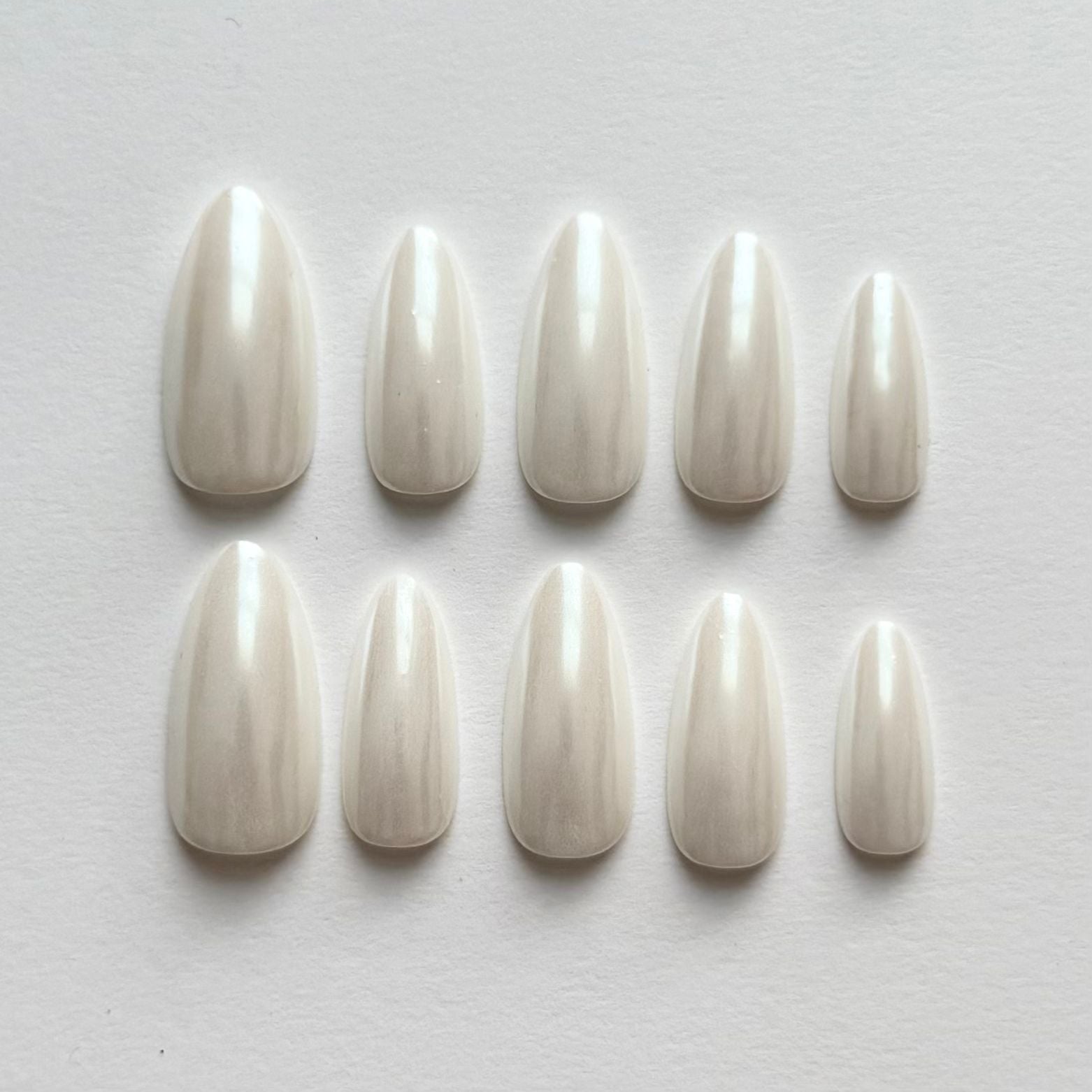 Set de uñas press on en un delicado tono blanco perlado, con un sutil brillo nacarado que aporta luminosidad y sofisticación. Inspiradas en la elegancia atemporal de las perlas, son perfectas para ocasiones especiales, para quienes buscan un estilo refinado y versátil.