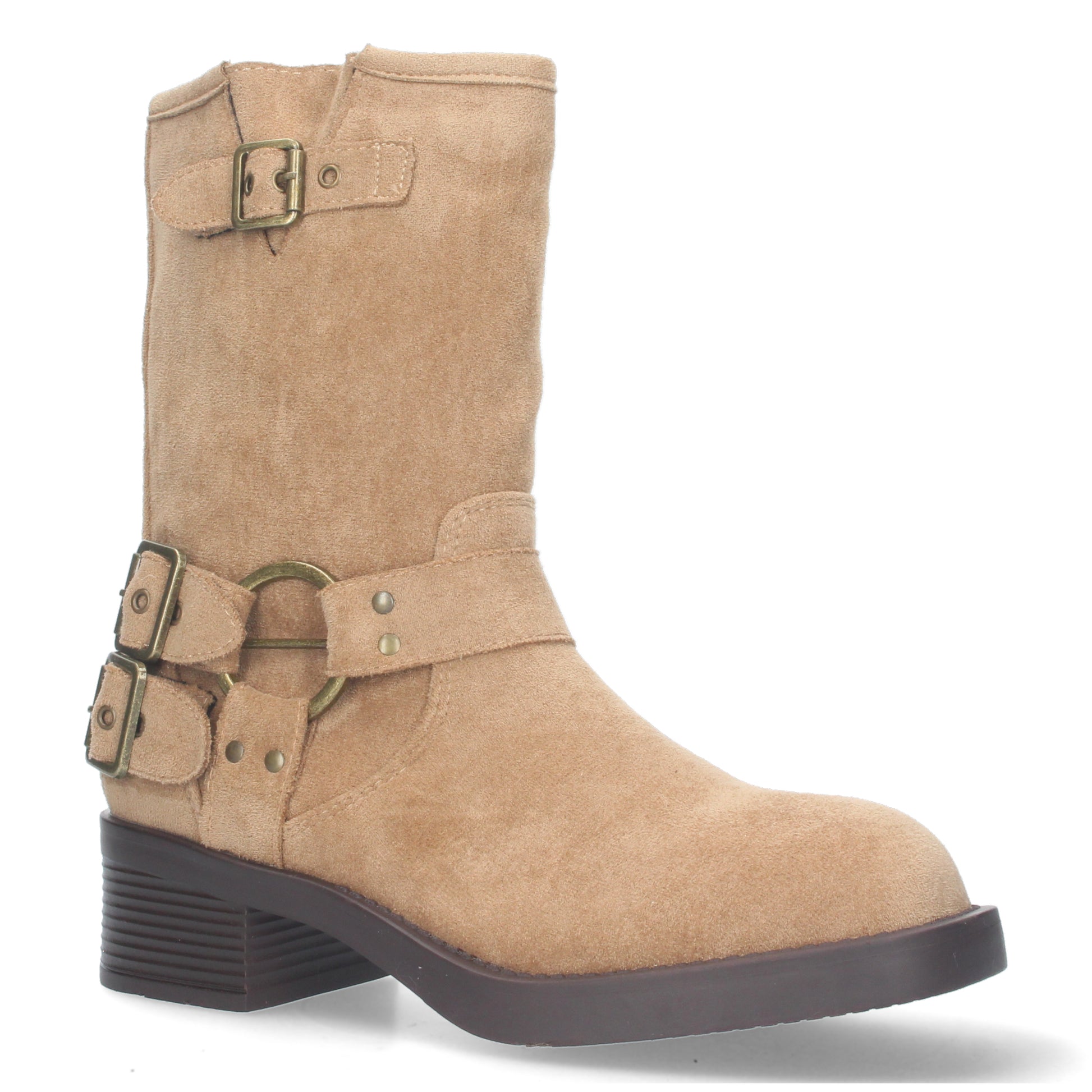 Bota biker con hebillas metálicas y caña media. Diseño estructurado con tacón bajo y suela gruesa.