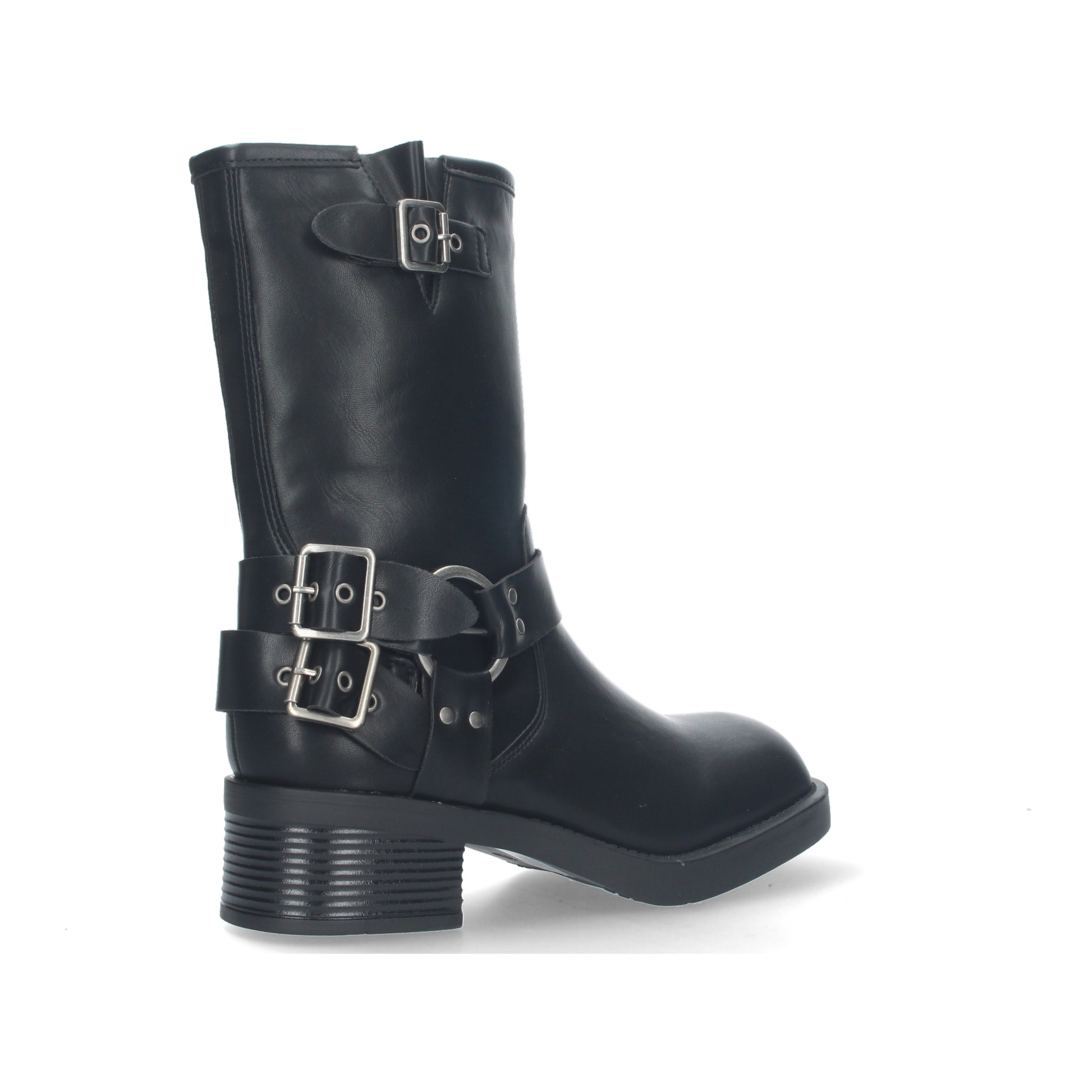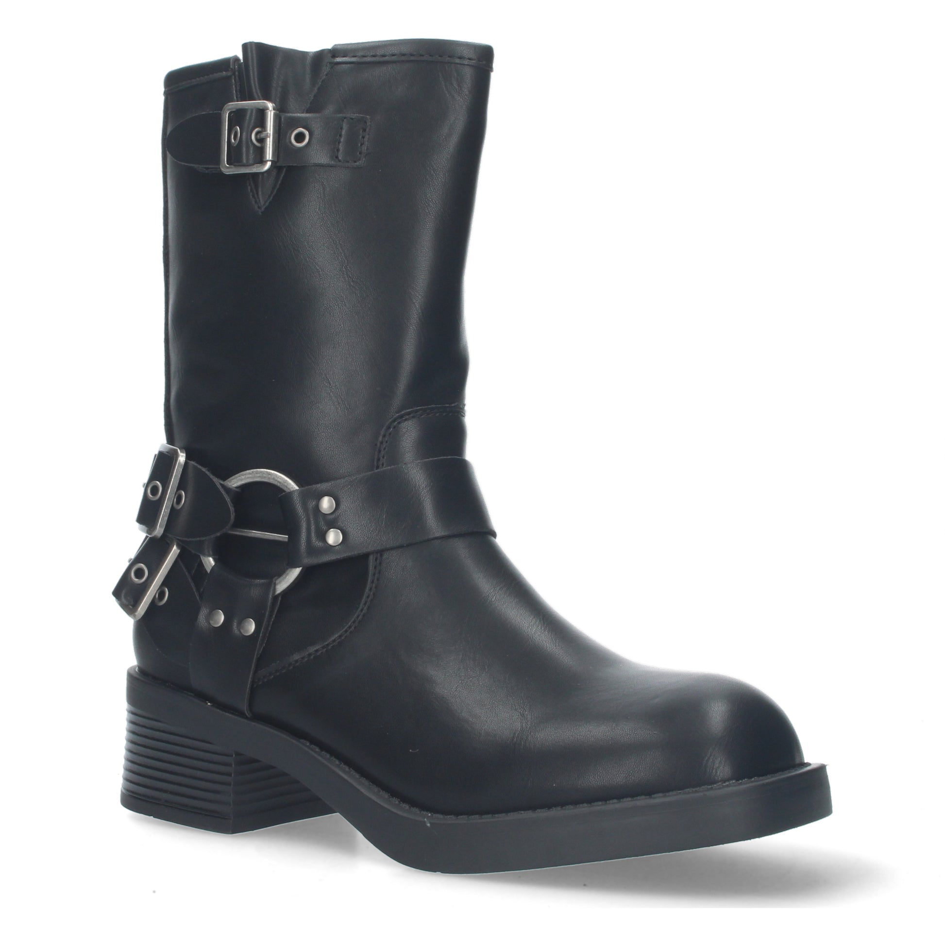 Bota biker con hebillas metálicas y caña media. Diseño estructurado con tacón bajo y suela gruesa.