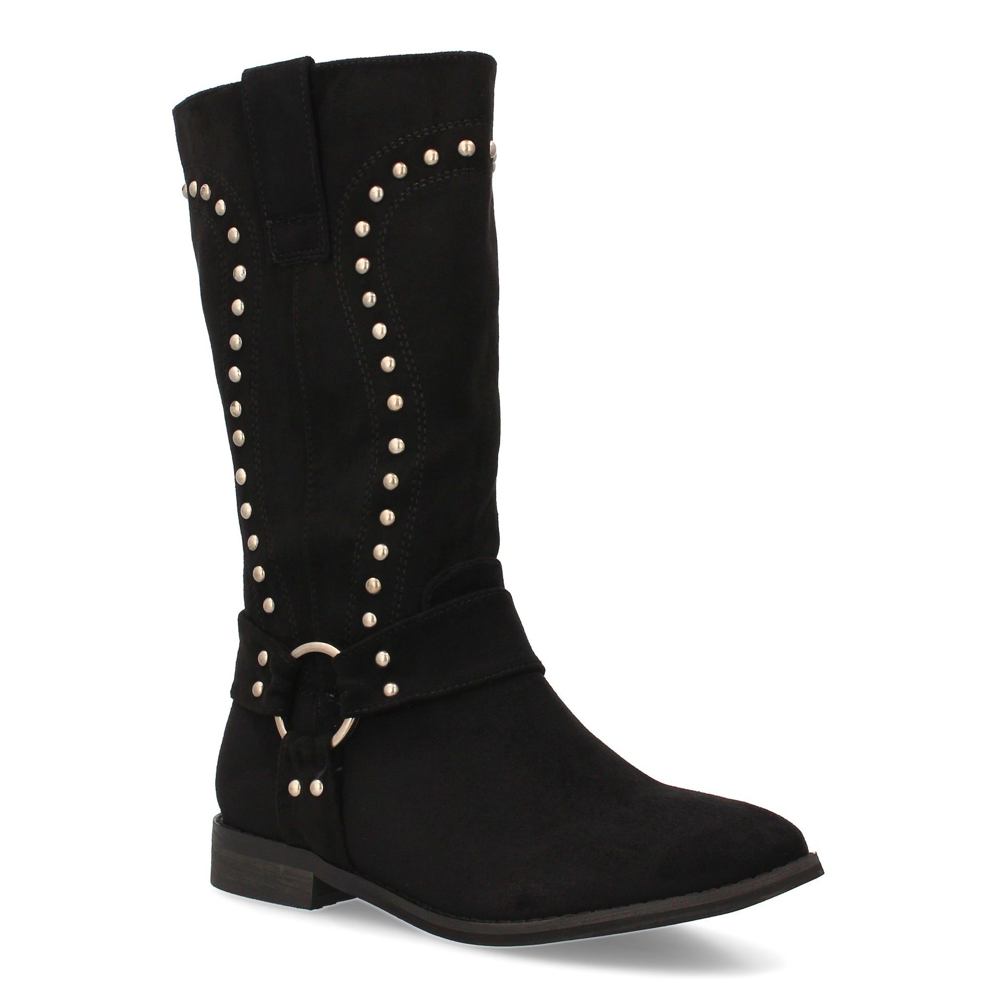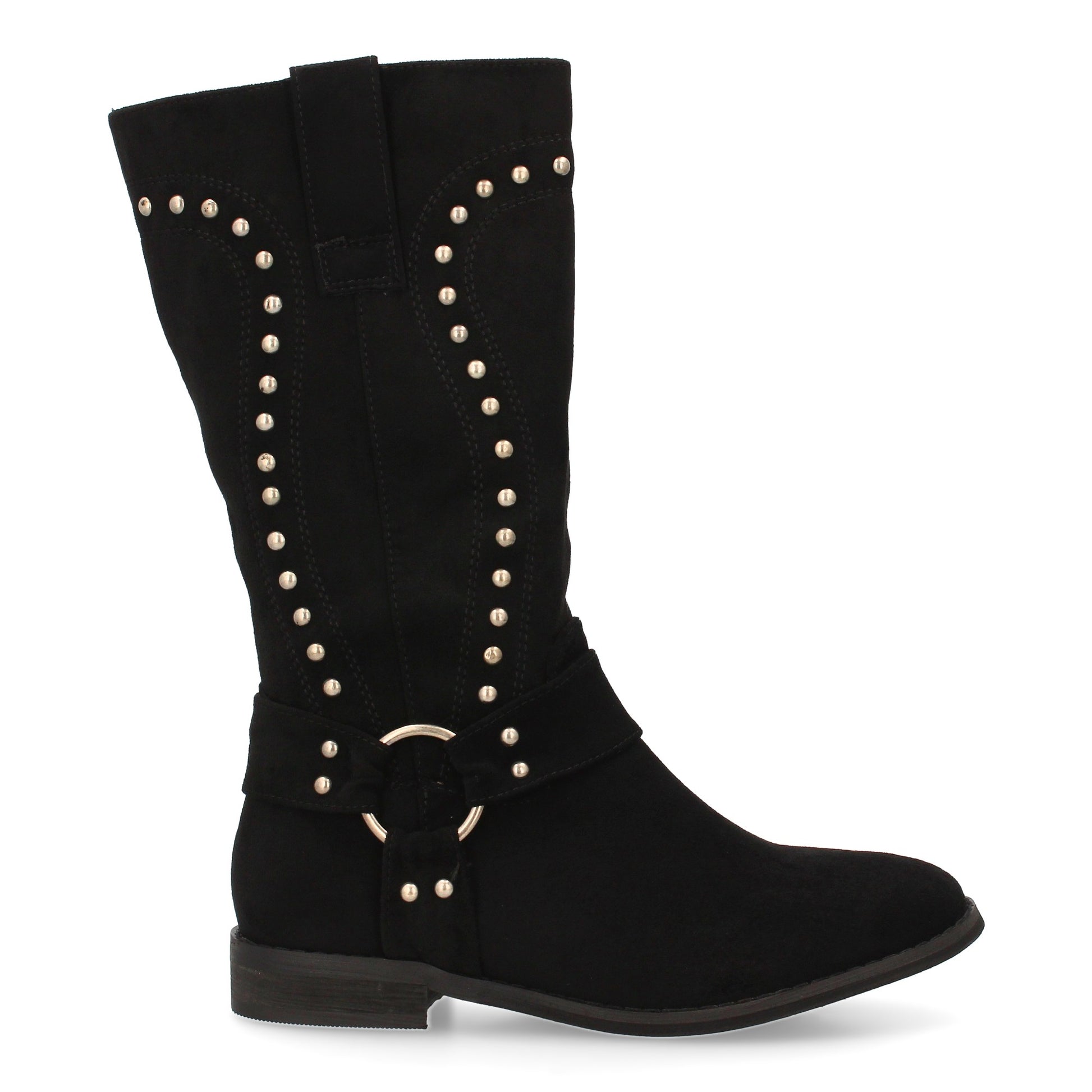 Bota de caña media con detalle de tachuelas decorativas en el contorno y acabado tipo antelina. Diseño recto y suela plana.