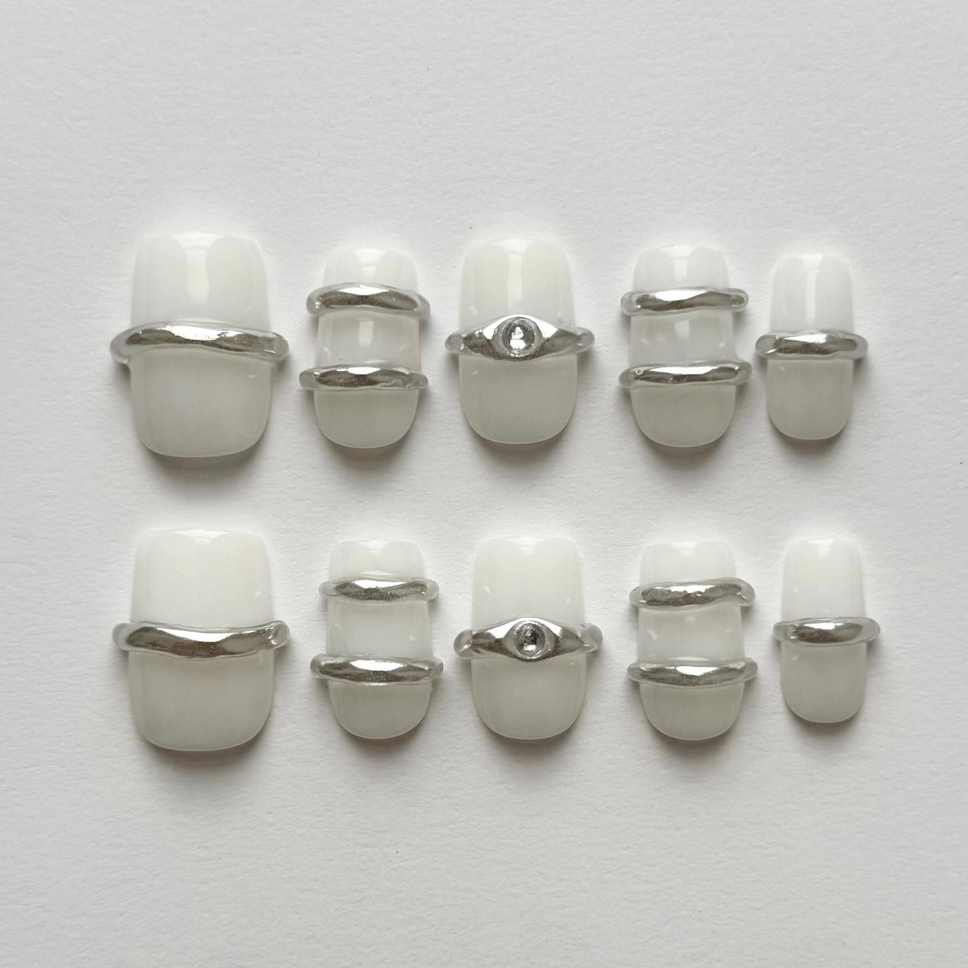 Set de uñas press on en tono blanco milky, realzado con delicadas aplicaciones metálicas plateadas que recuerdan a finos anillos de joyería. Un diseño exclusivo y sofisticado, pensado para aportar distinción y elegancia en cualquier ocasión.