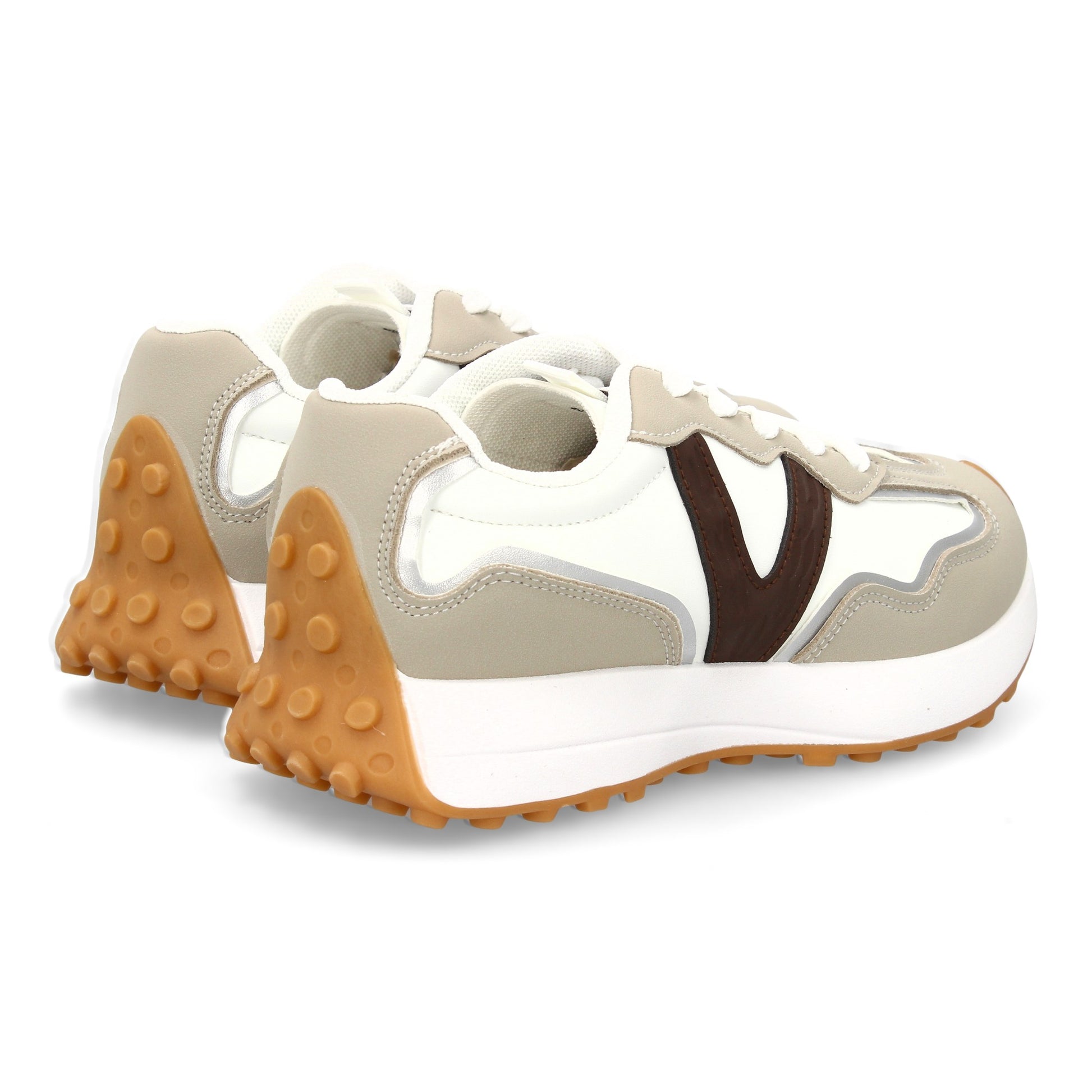 Zapatilla deportiva combinada en gris, blanco y marrón oscuro en el lateral. Suela dentada y cierre con cordones.