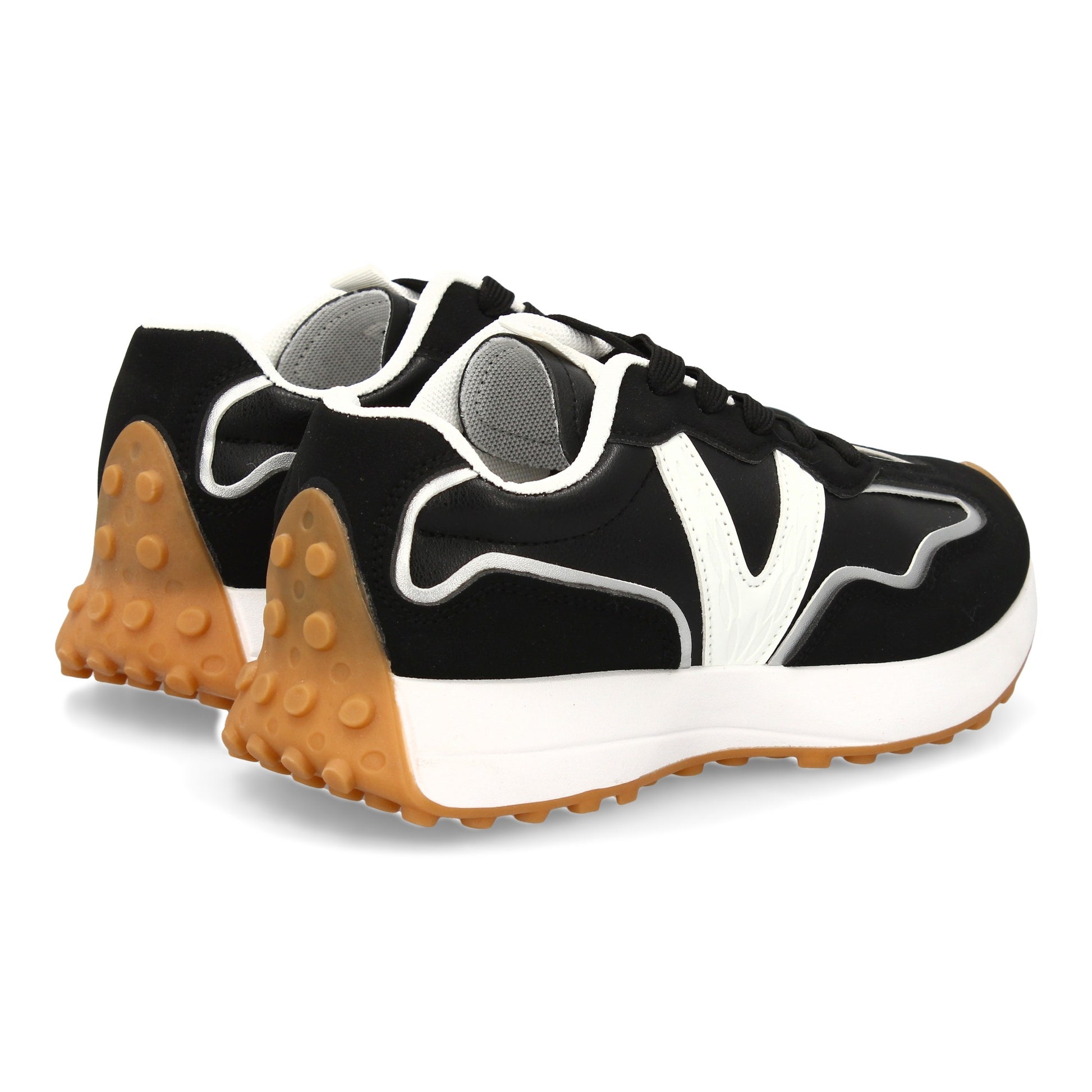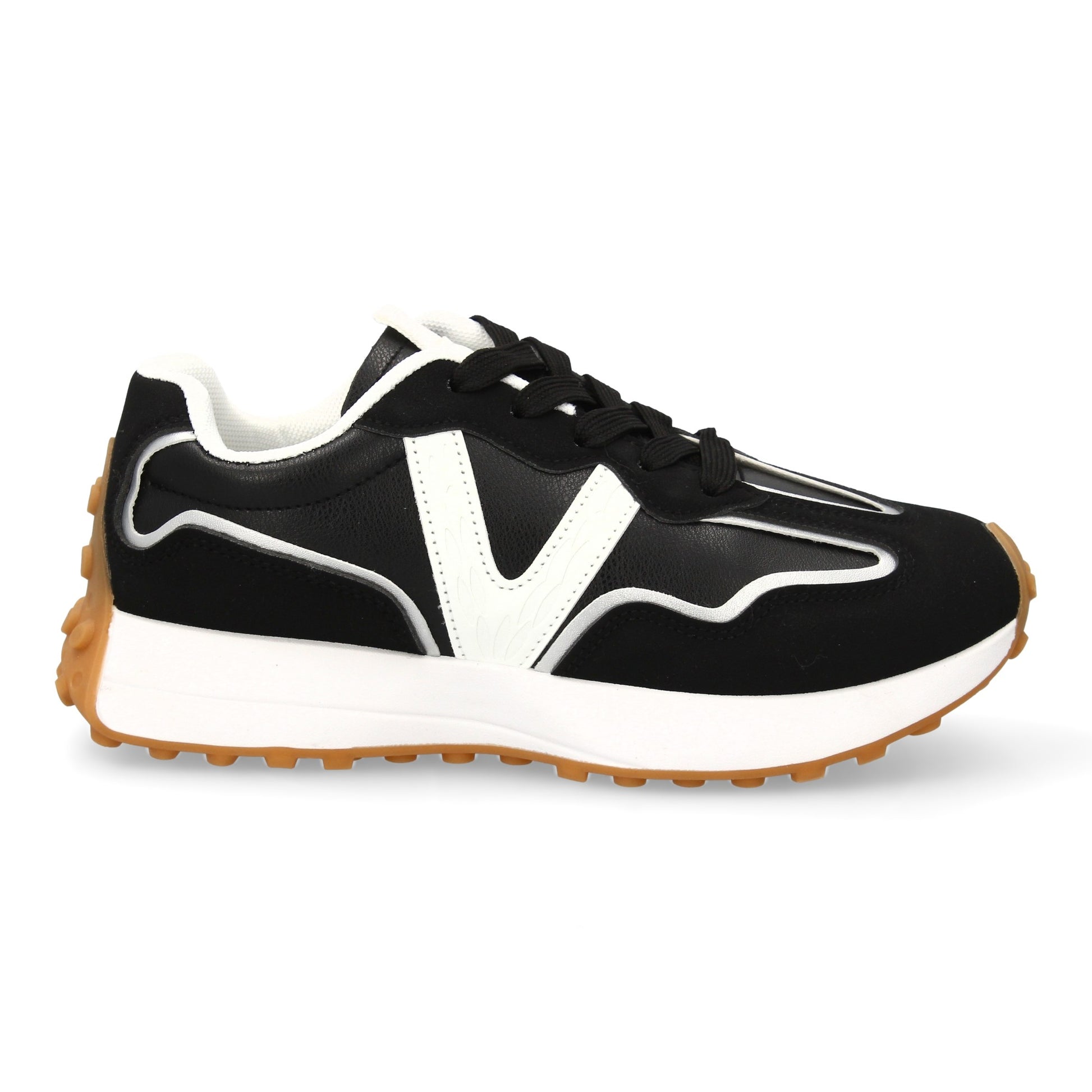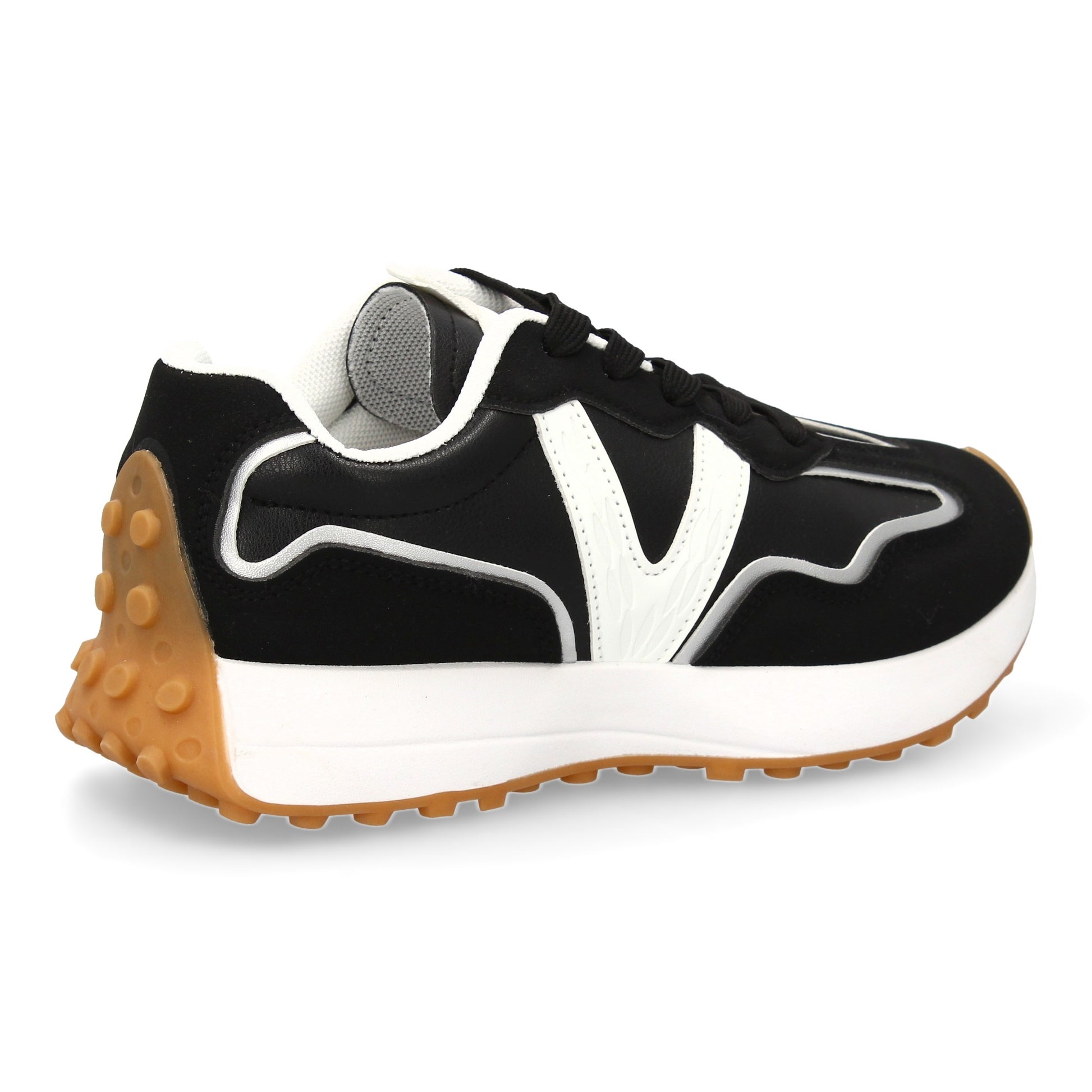 Zapatilla deportiva con suela dentada y combinación de tonos negros y blancos. Cierre con cordones y refuerzos laterales para mayor comodidad.