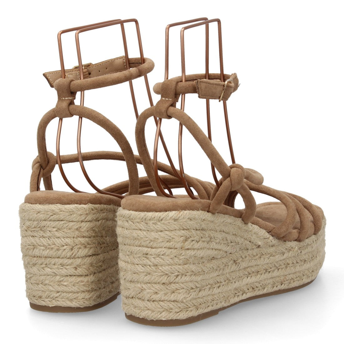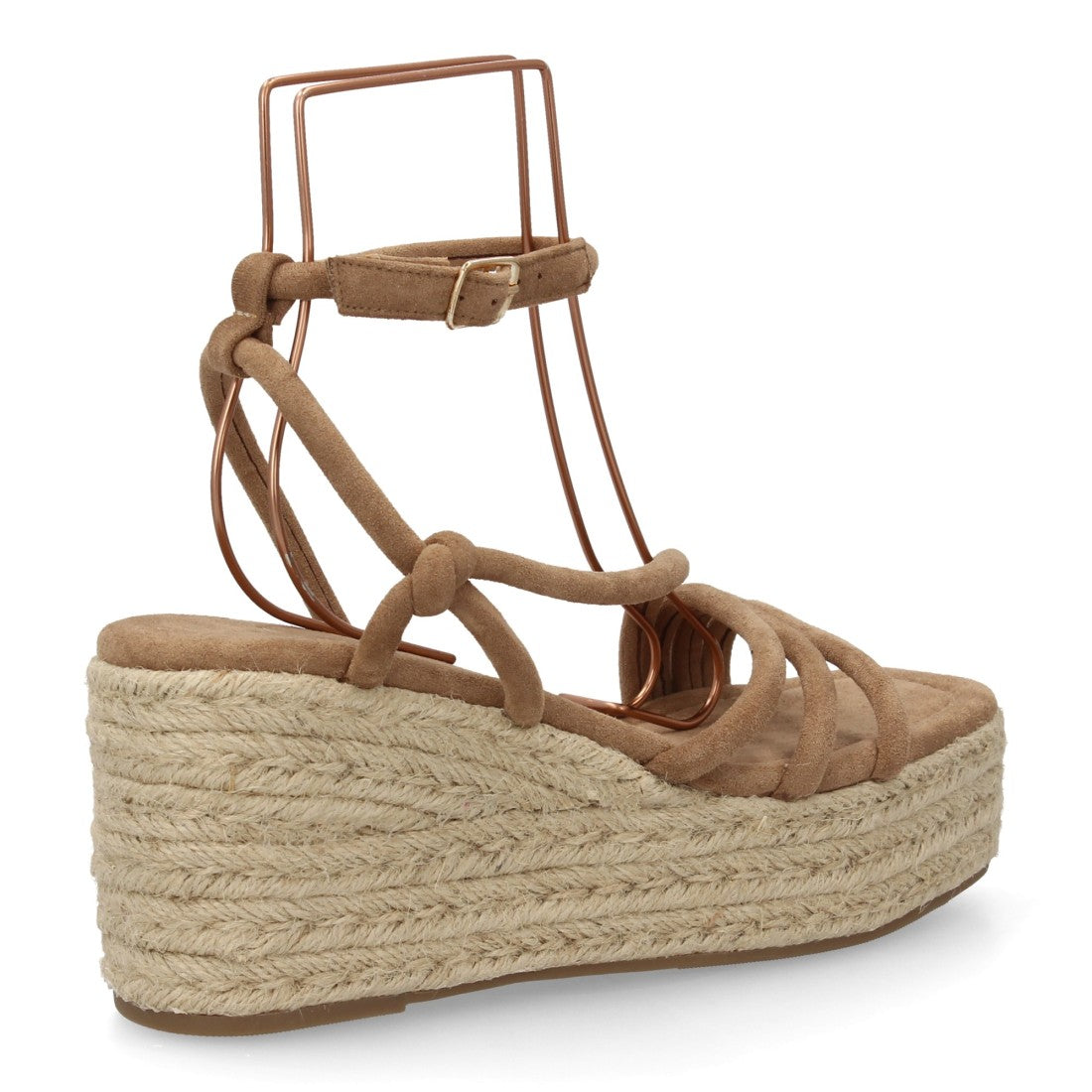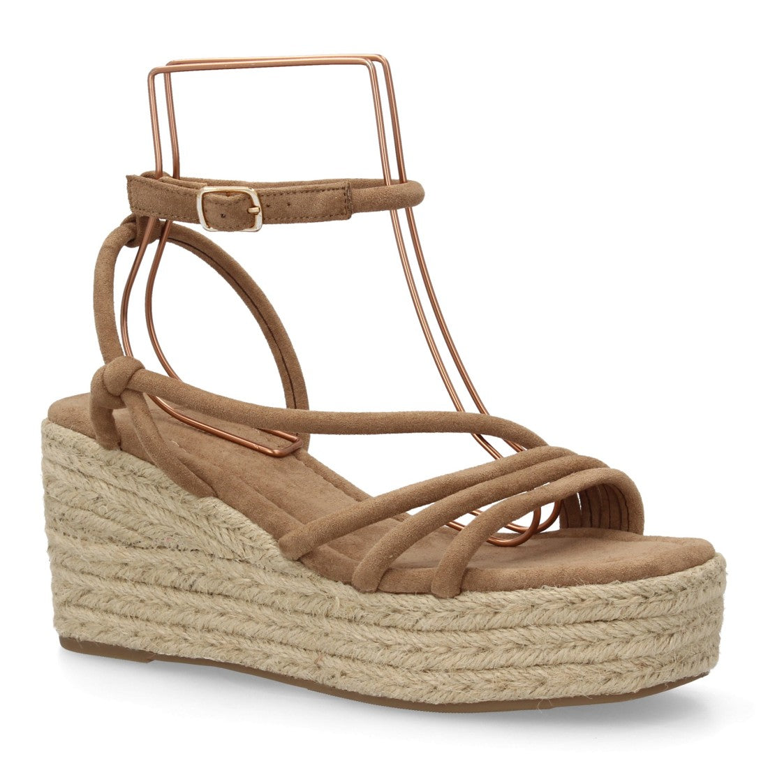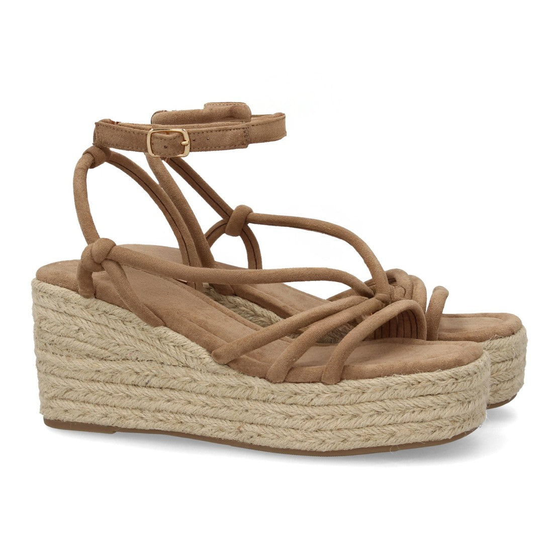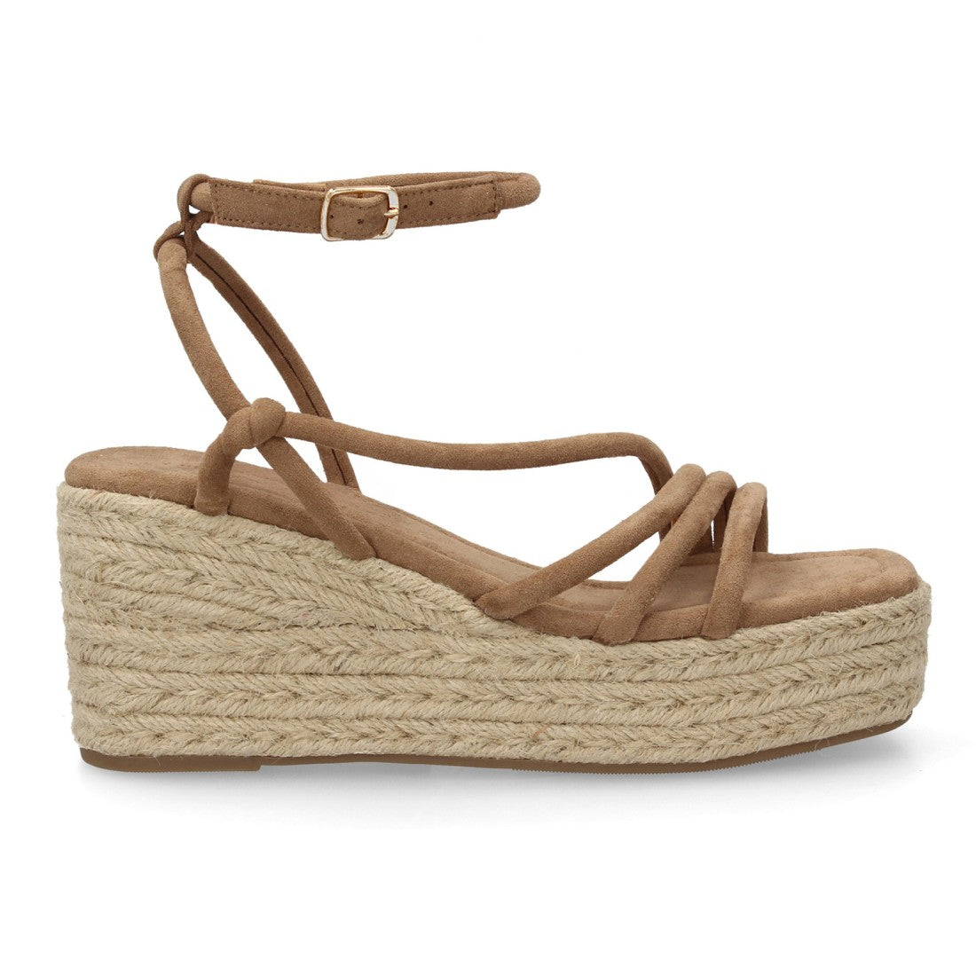 Sandalia con cuña y diseño de tiras finas, con nudos decorativos. Cierre de hebilla ajustable.