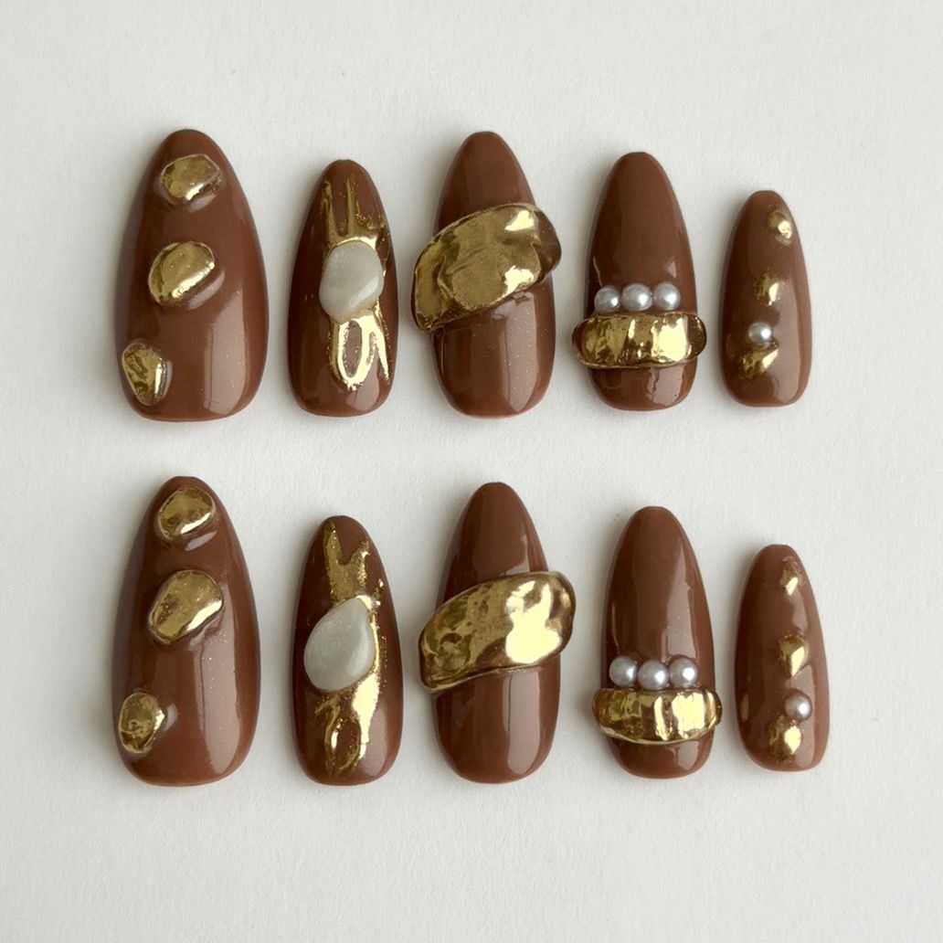 Set en tono marrón con detalles en dorado metálico y pequeñas perlas decorativas.