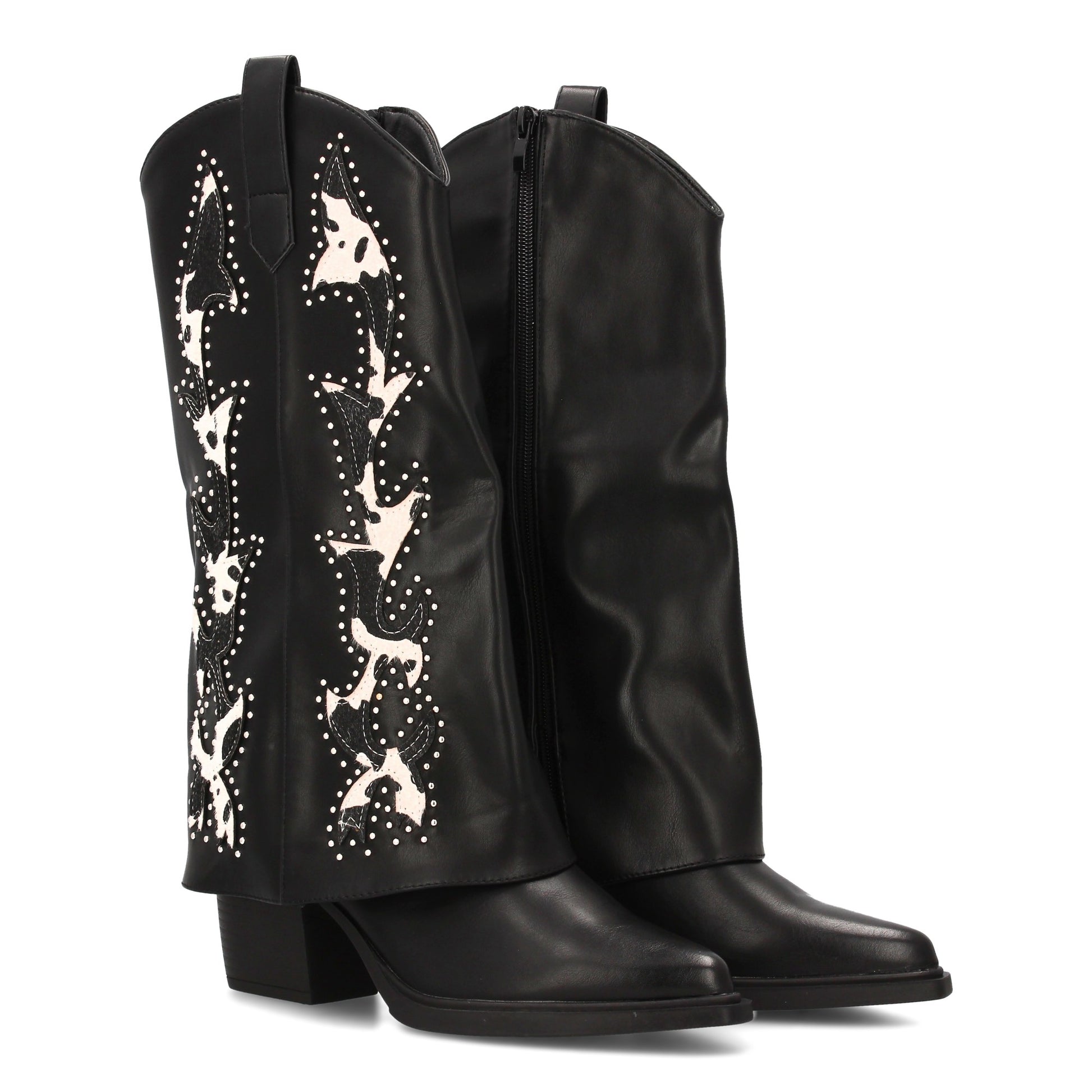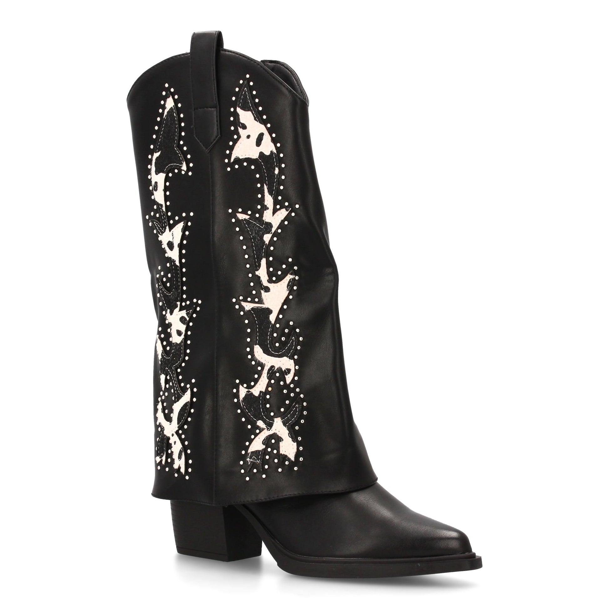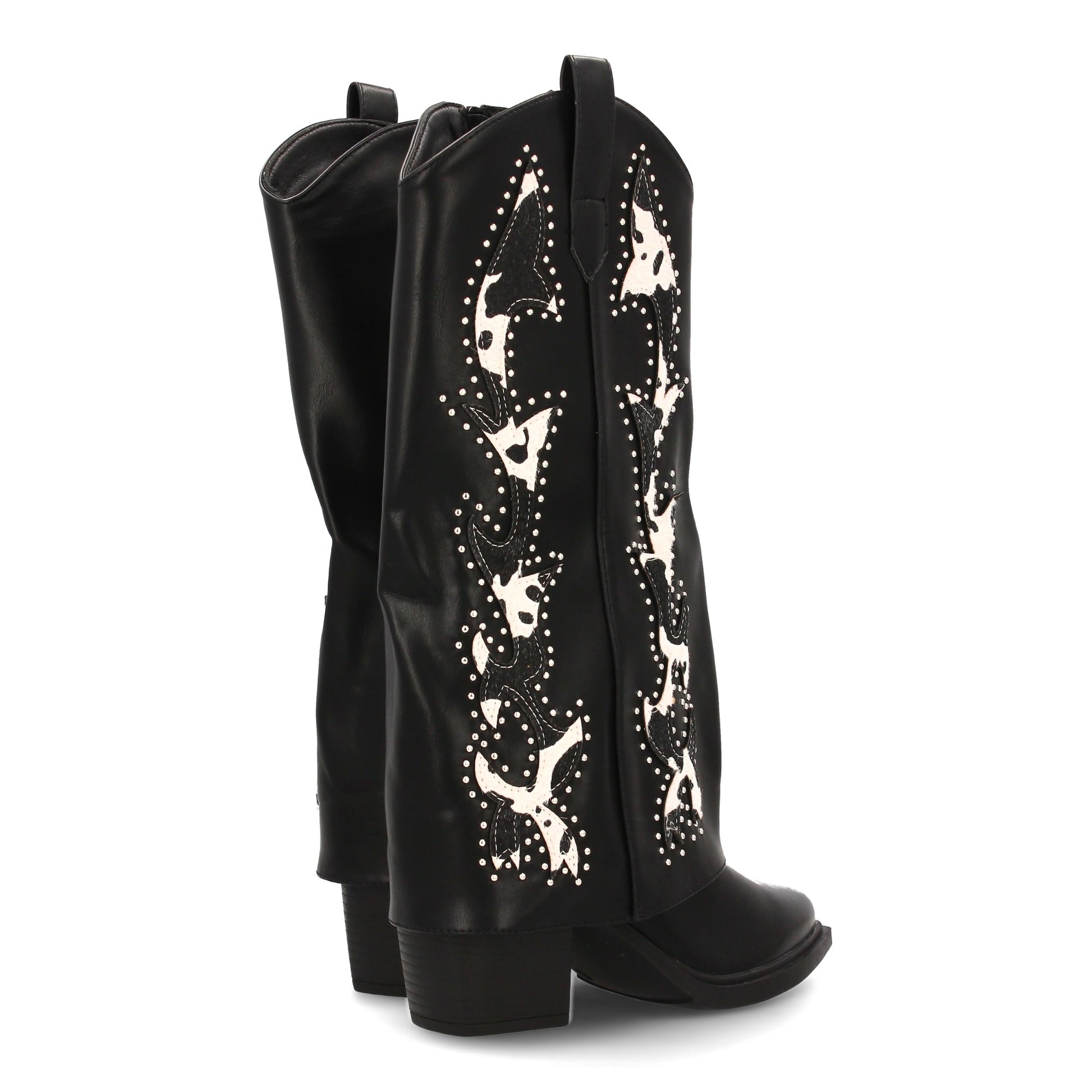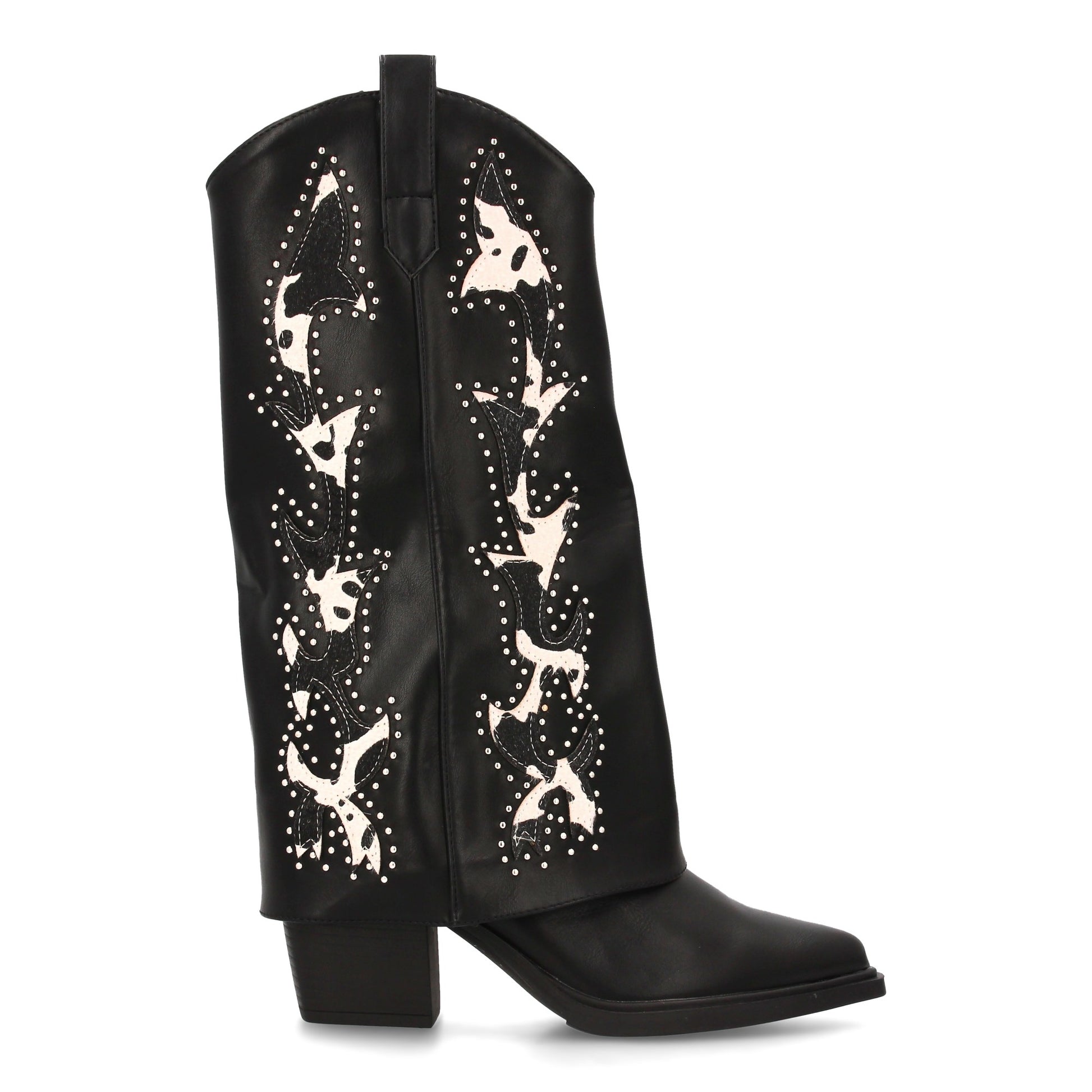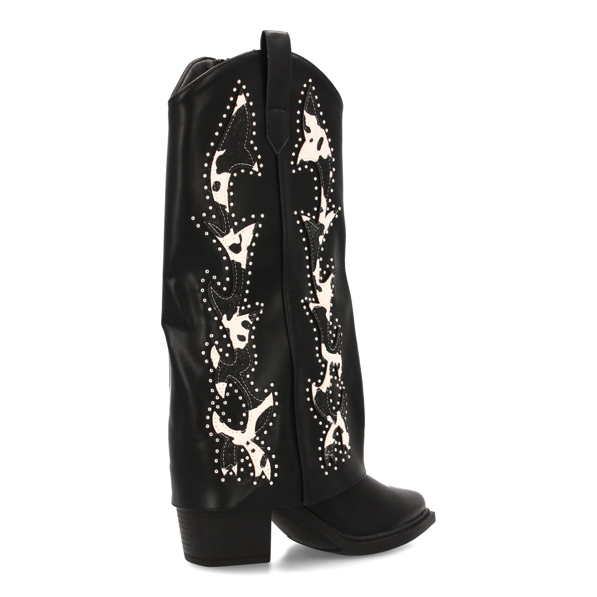 Bota de caña alta con tacón en bloque, estilo cowboy con estampado animal print y detalles de tachuelas metálicas.