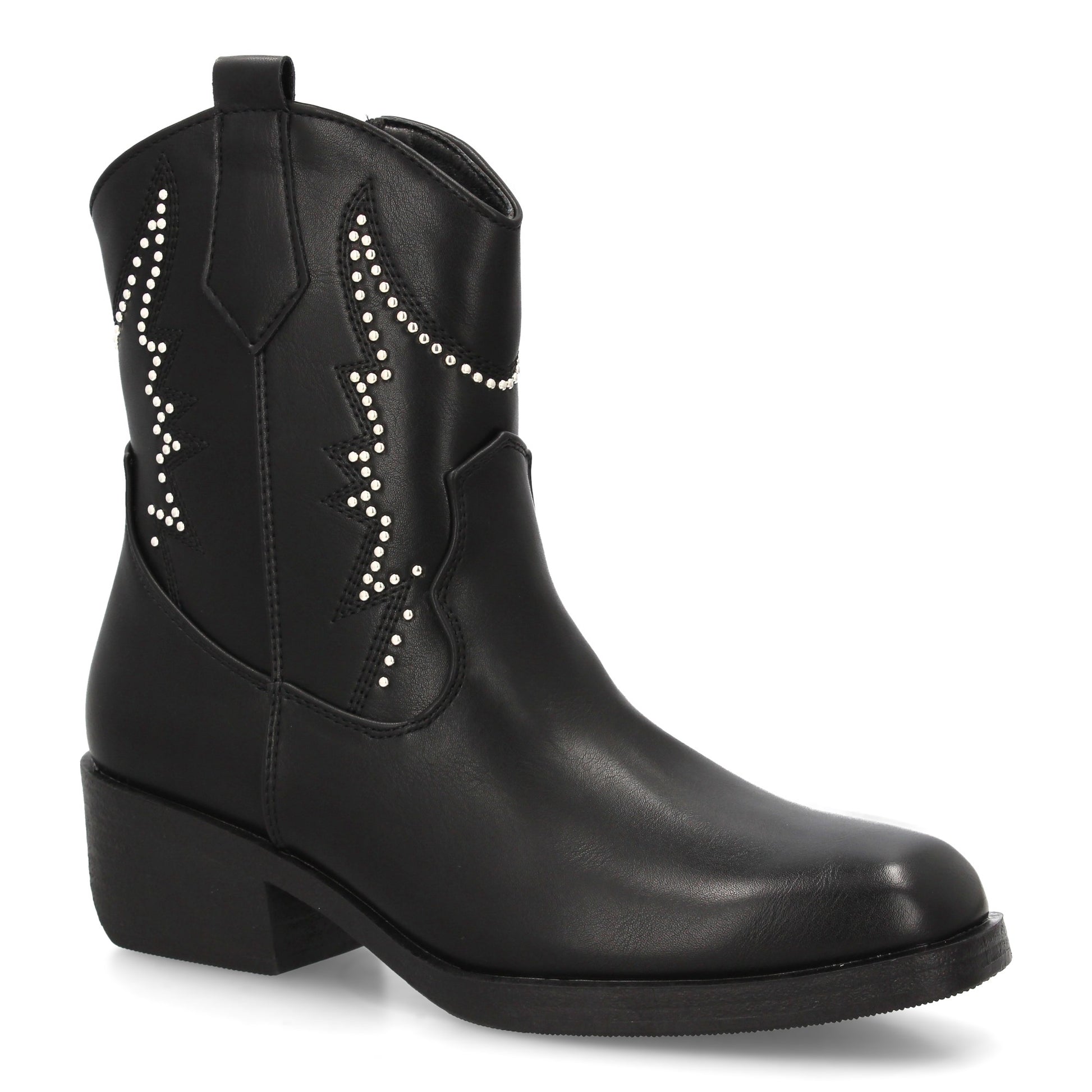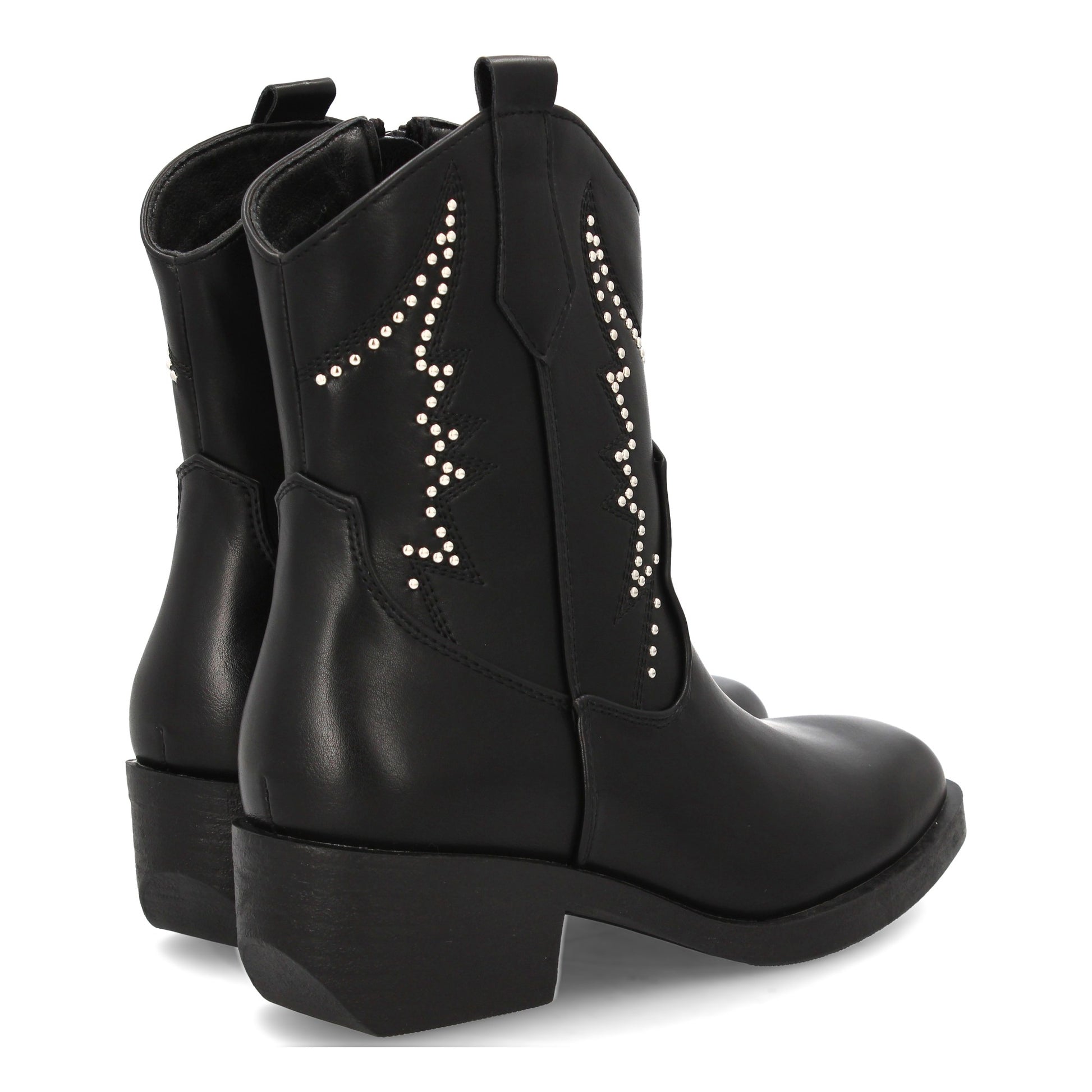 Botín con detalle de tachuelas plateadas en el lateral y bordado decorativo. Caña media con tacón bajo.